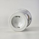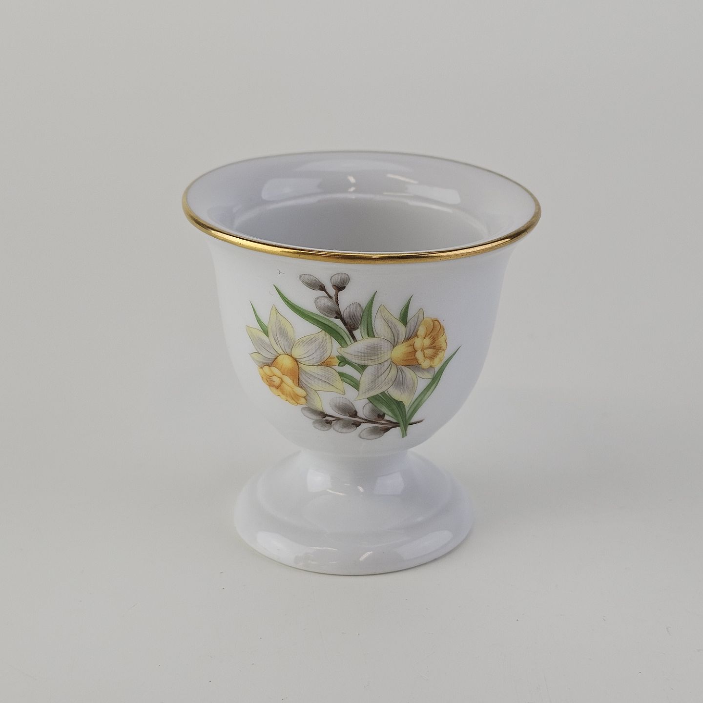 Bæger i hvidt porcelæn med guldkant og motiv af påskelilje
