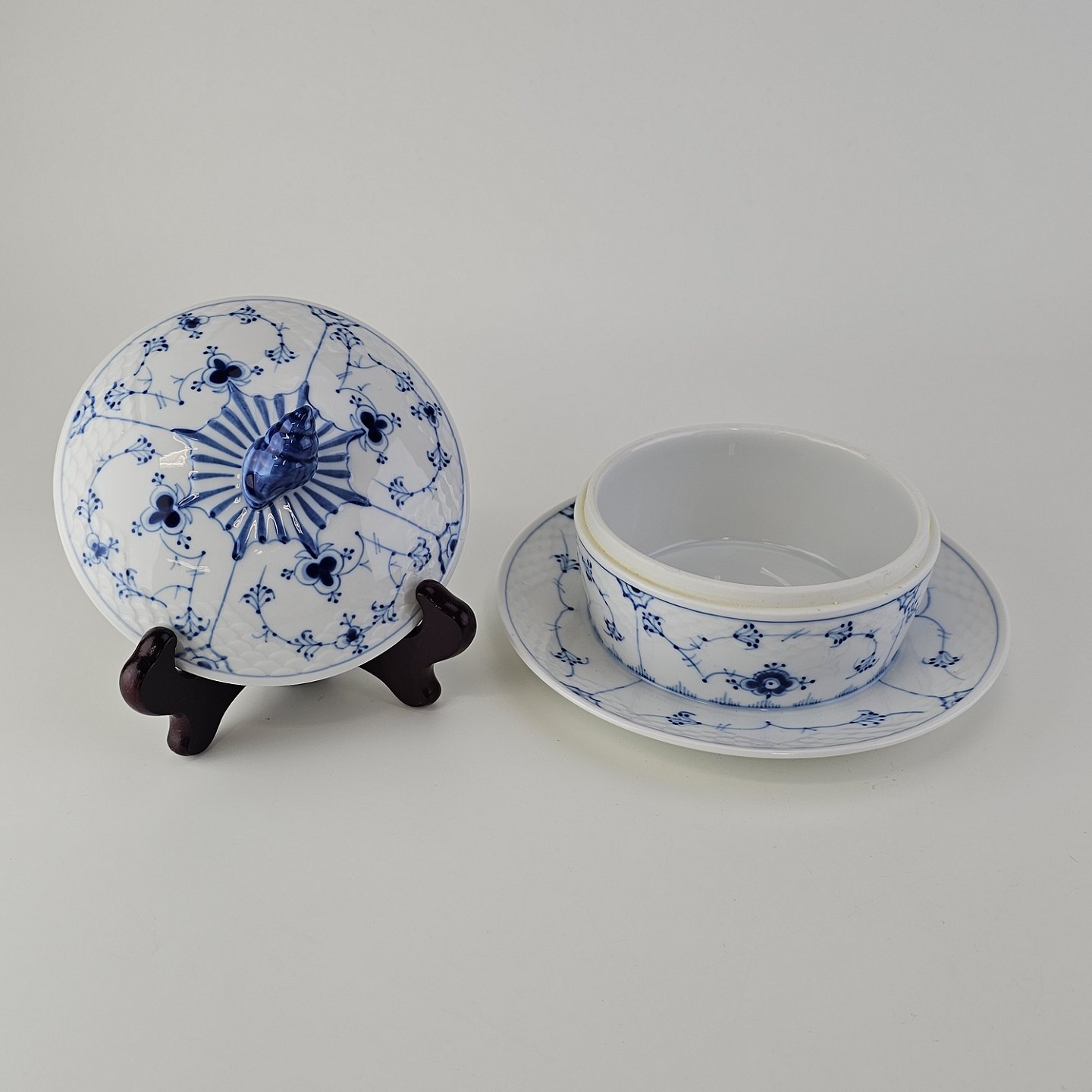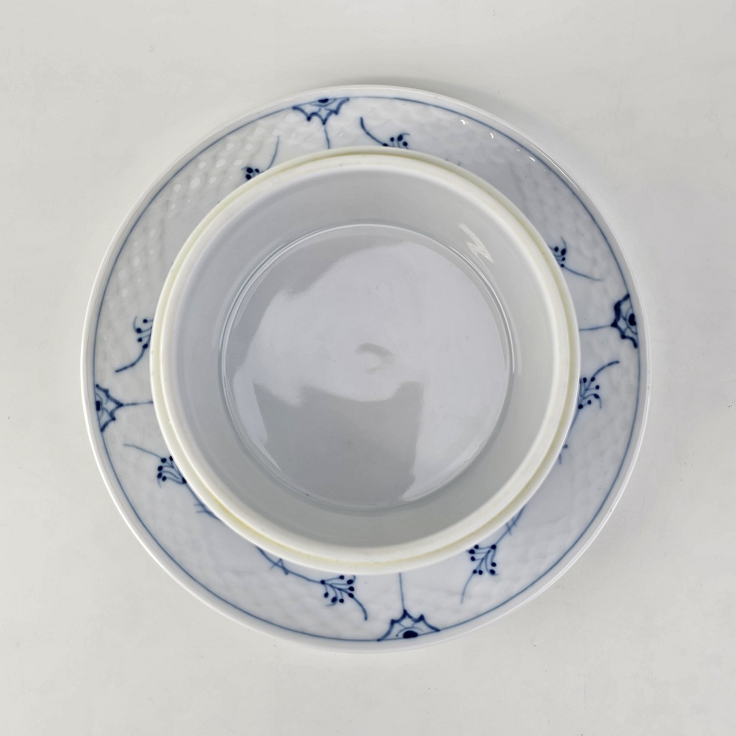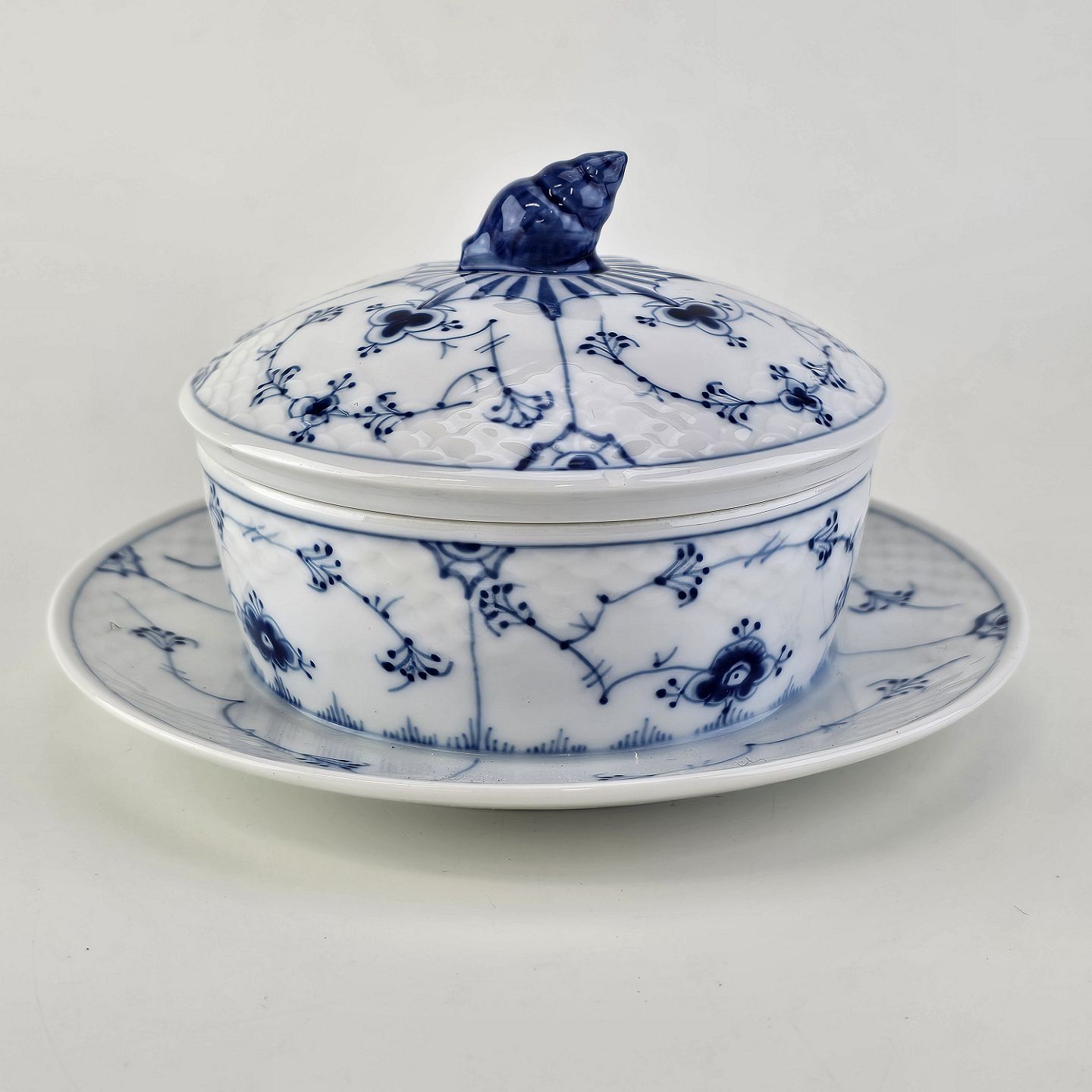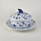 Beskrivelse: Smørkrukke på tallerken i porcelæn fra stellet Blåmalet. Nr. 196