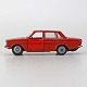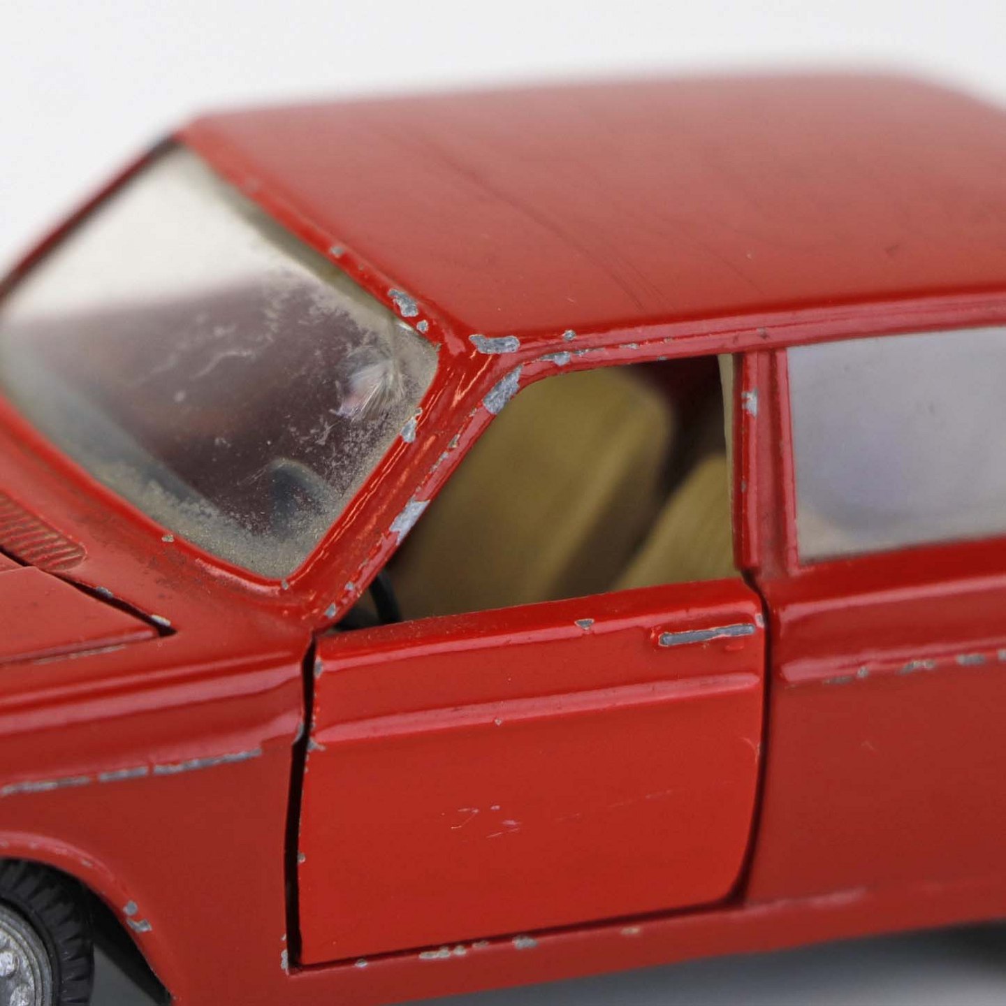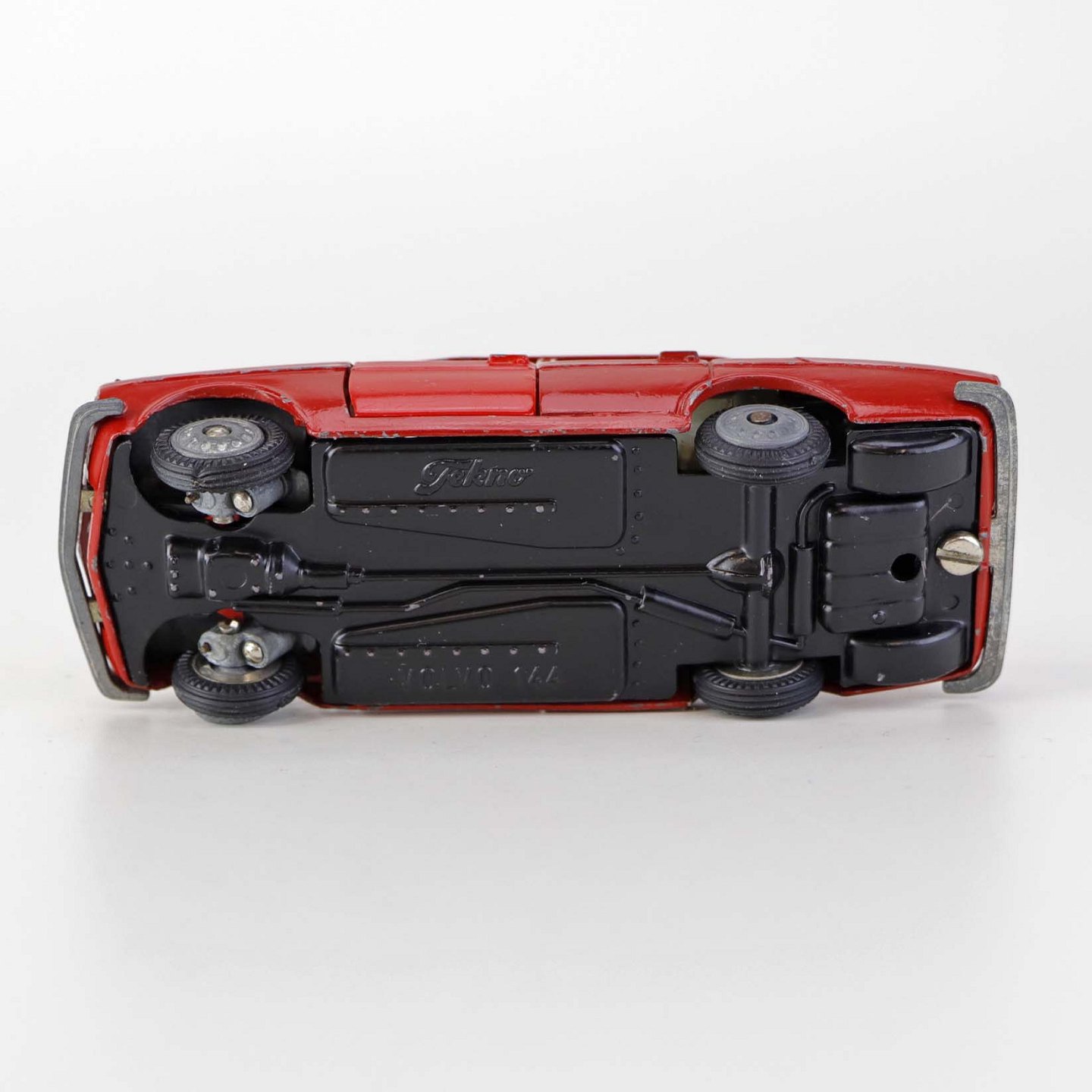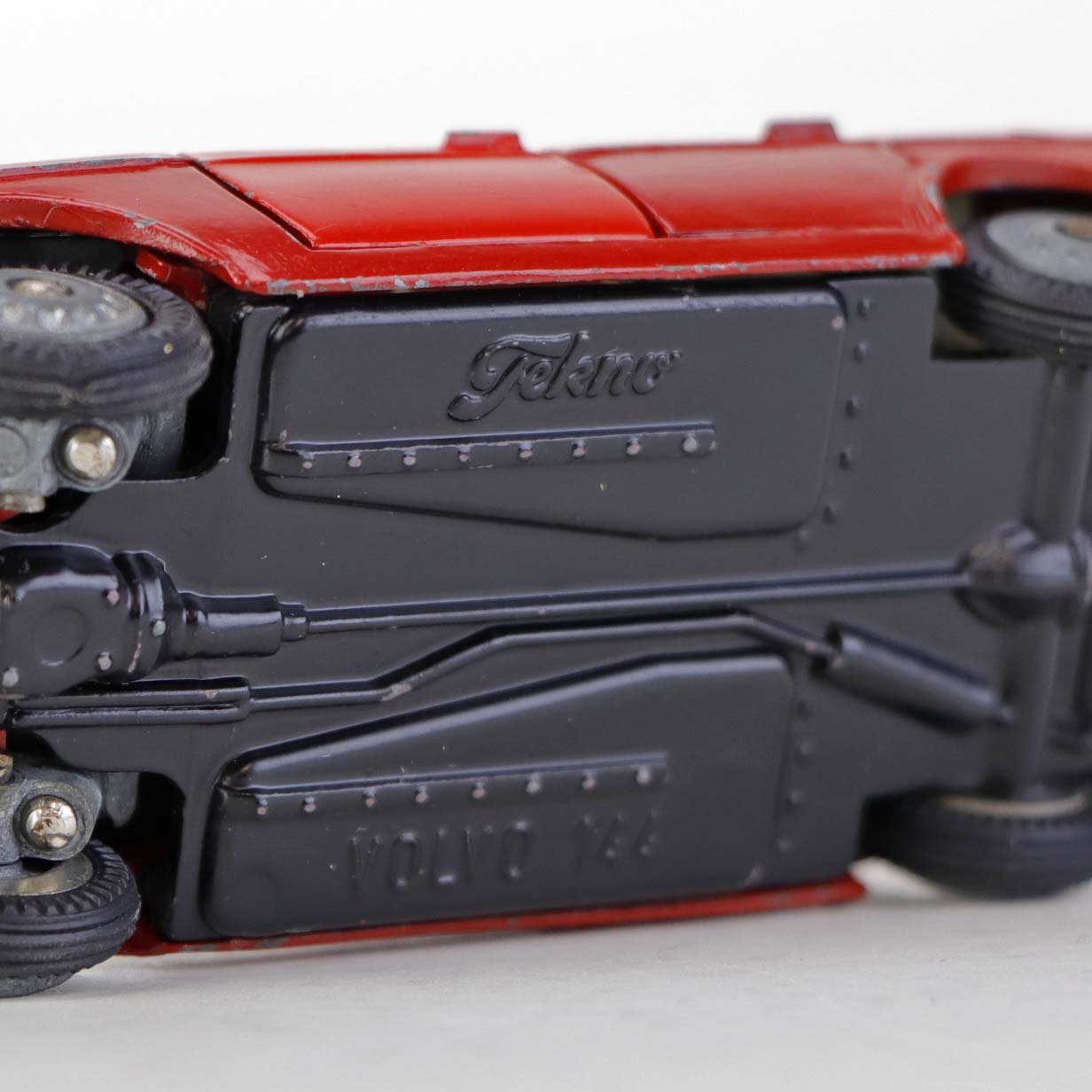 Beskrivelse: Sedan legetøjsbil i rødlakeret metal med gummi hjul. Model Volvo 144