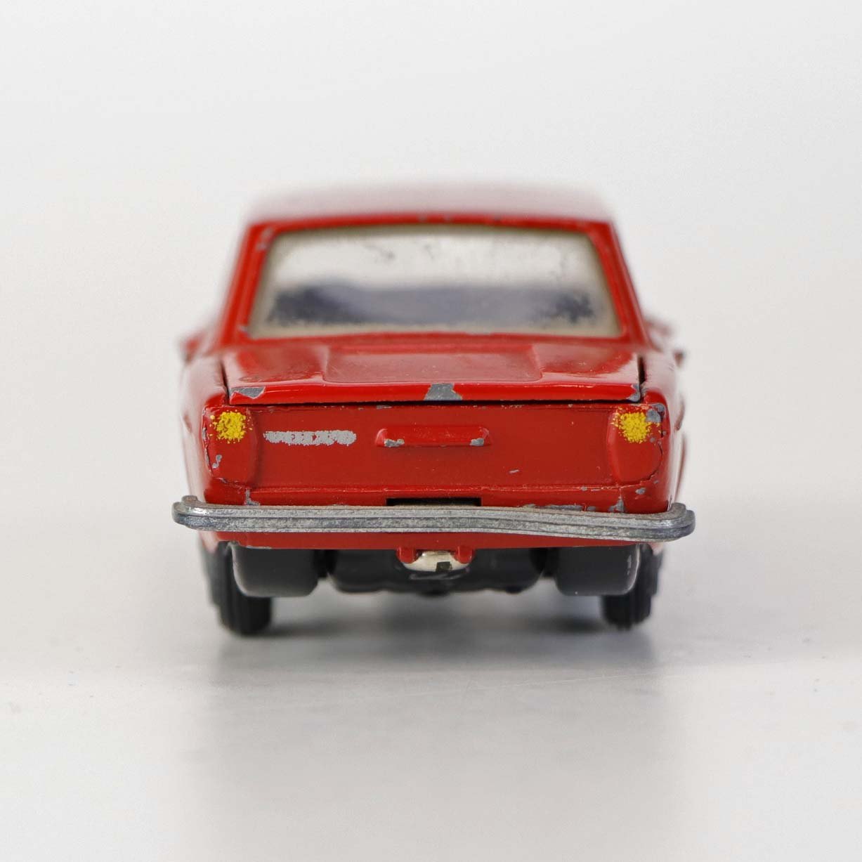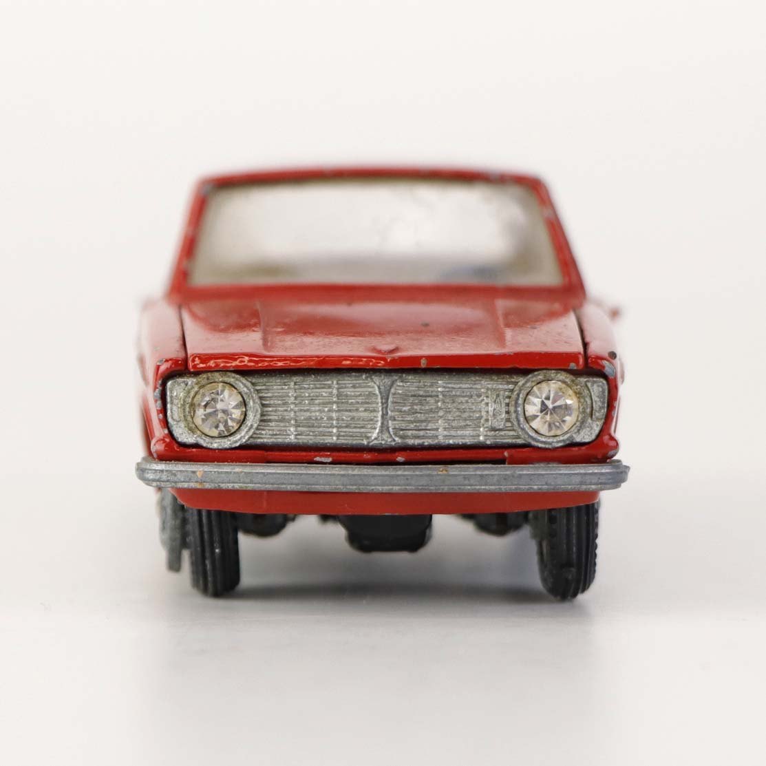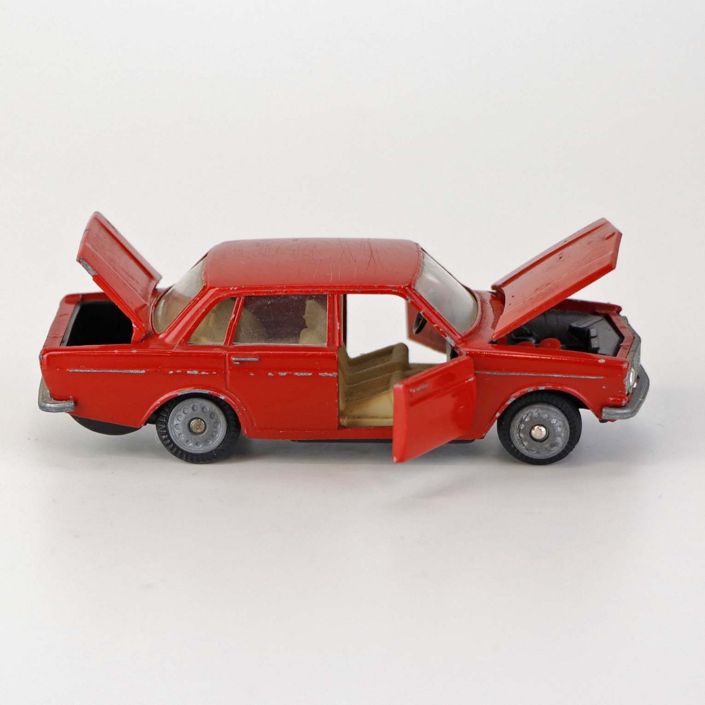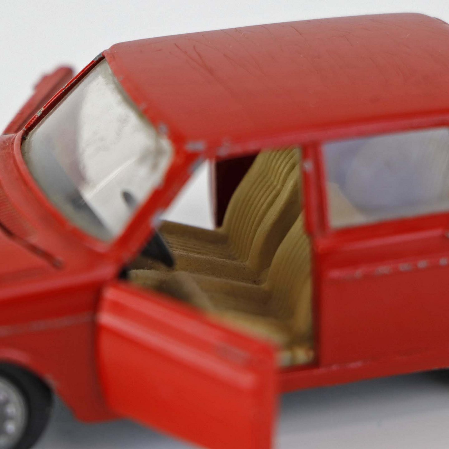 Beskrivelse: Sedan legetøjsbil i rødlakeret metal med gummi hjul. Model Volvo 144