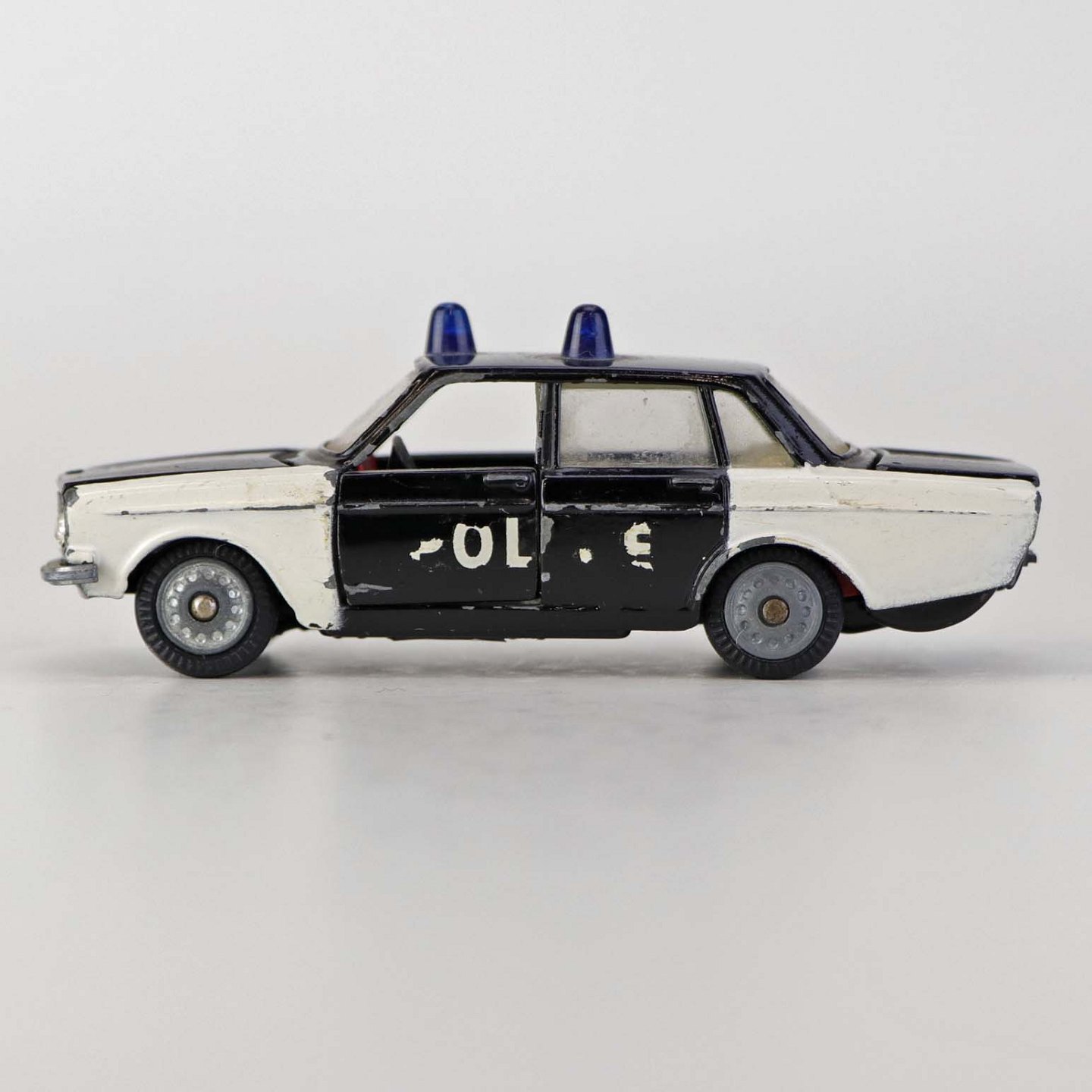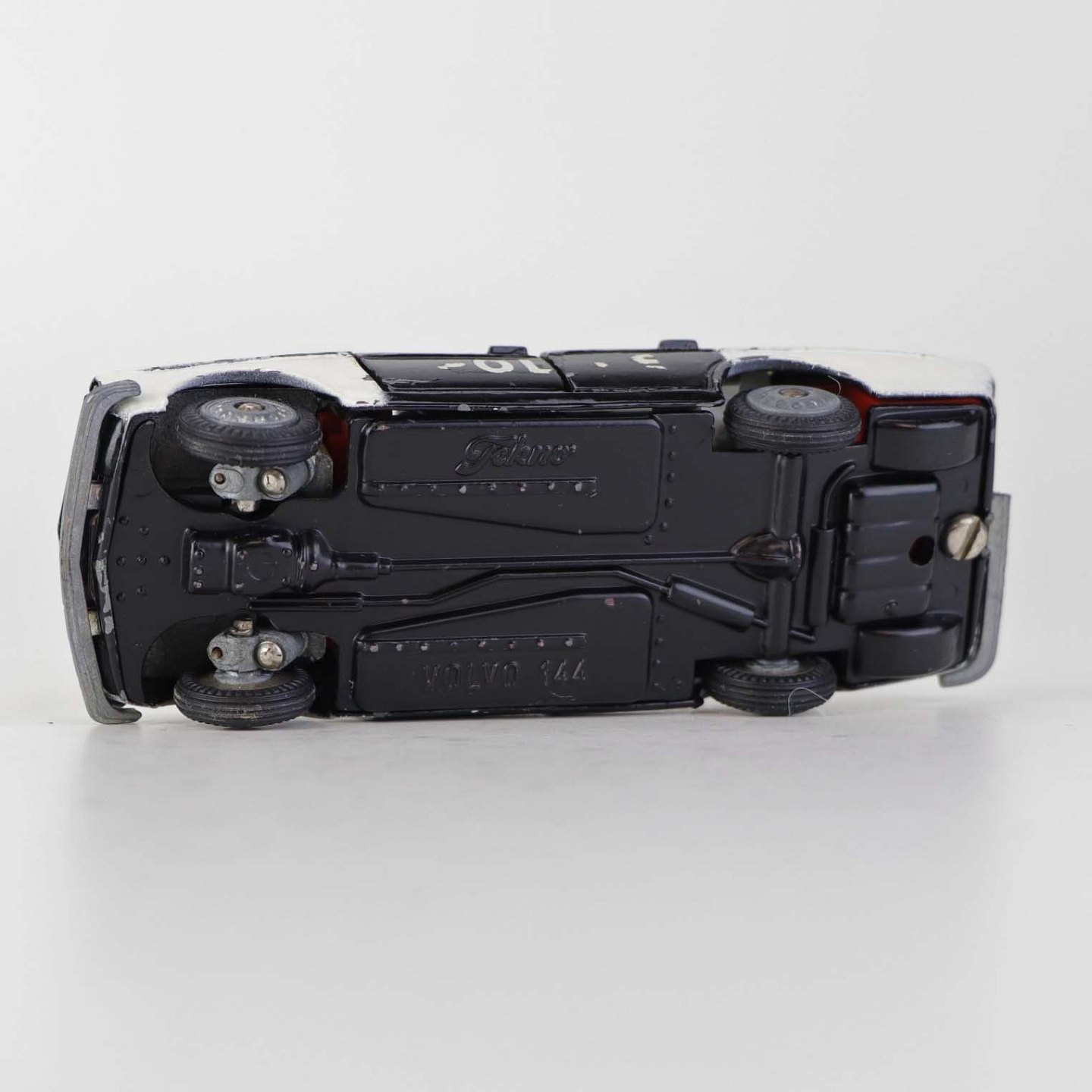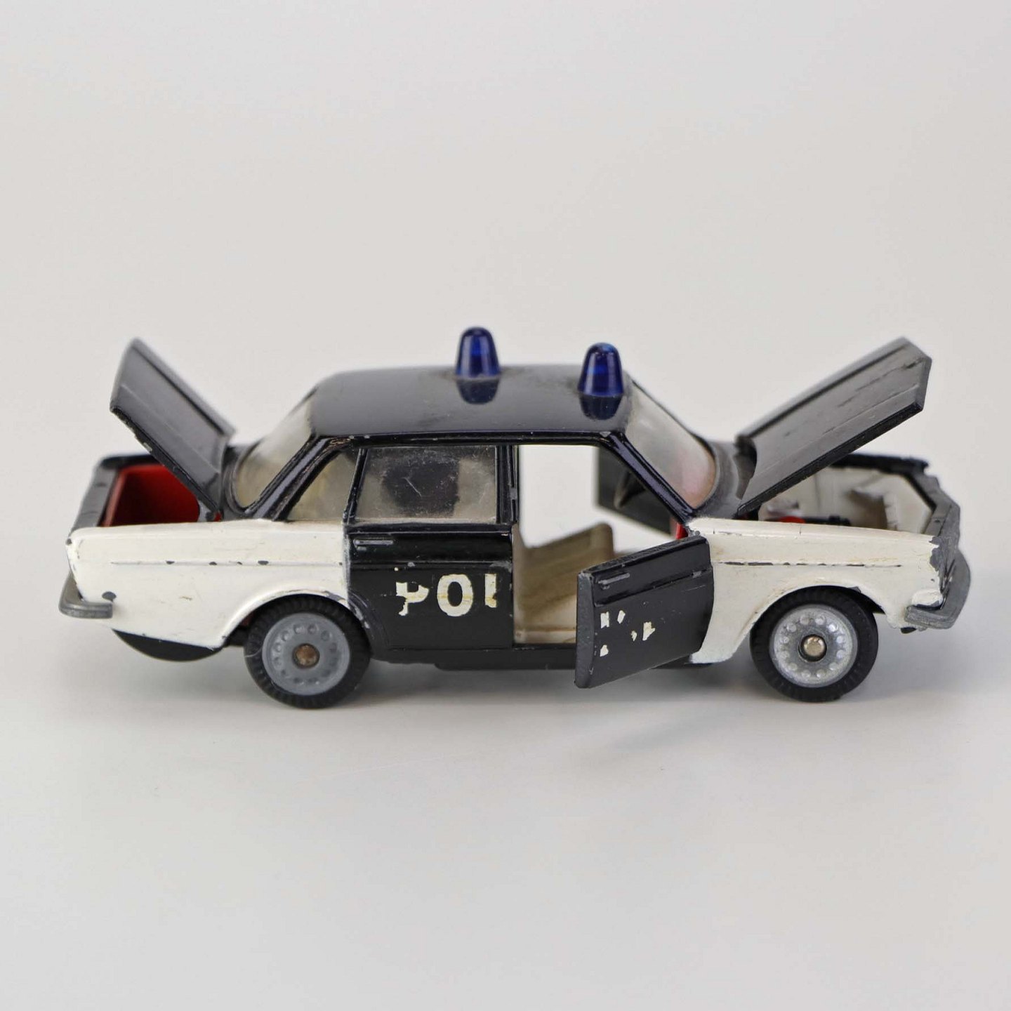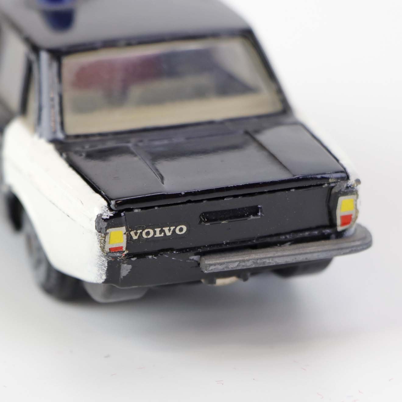 Beskrivelse: Politibil med to blinklys. Legetøjsbil i sortlakeret metal med gummi hjul og blå blinklys. Model Volvo 144