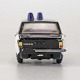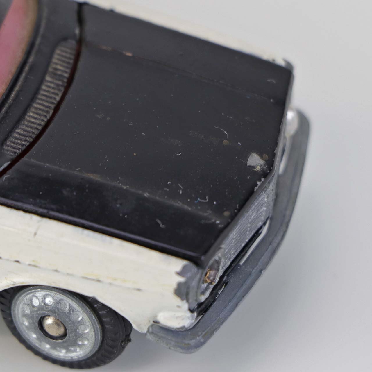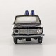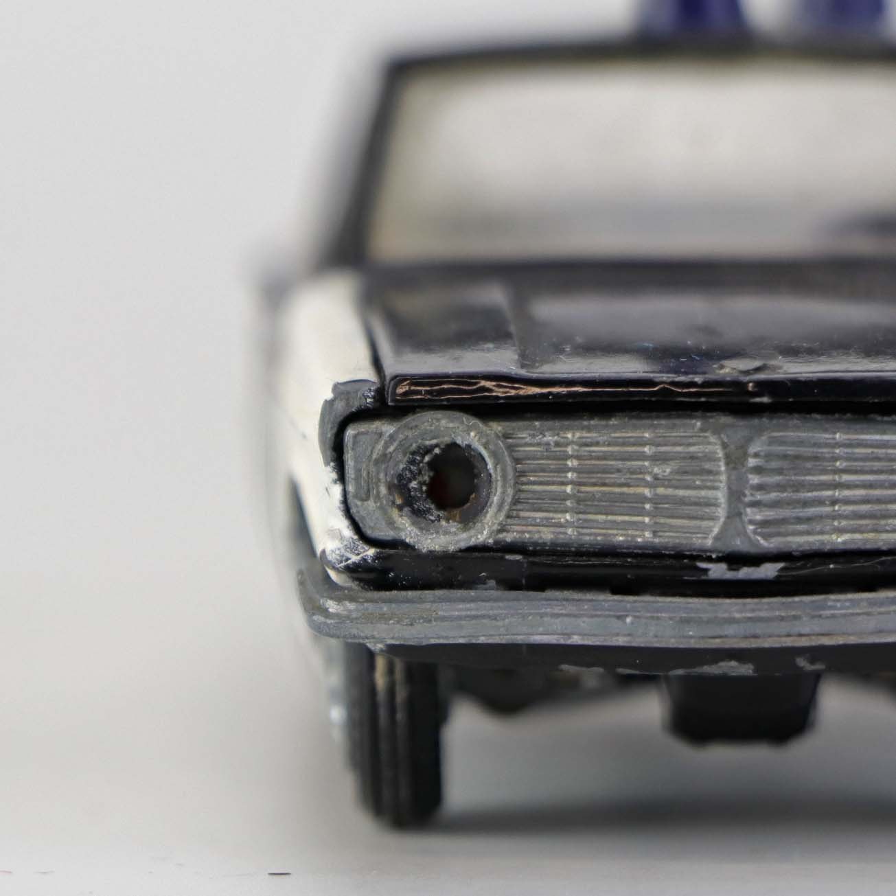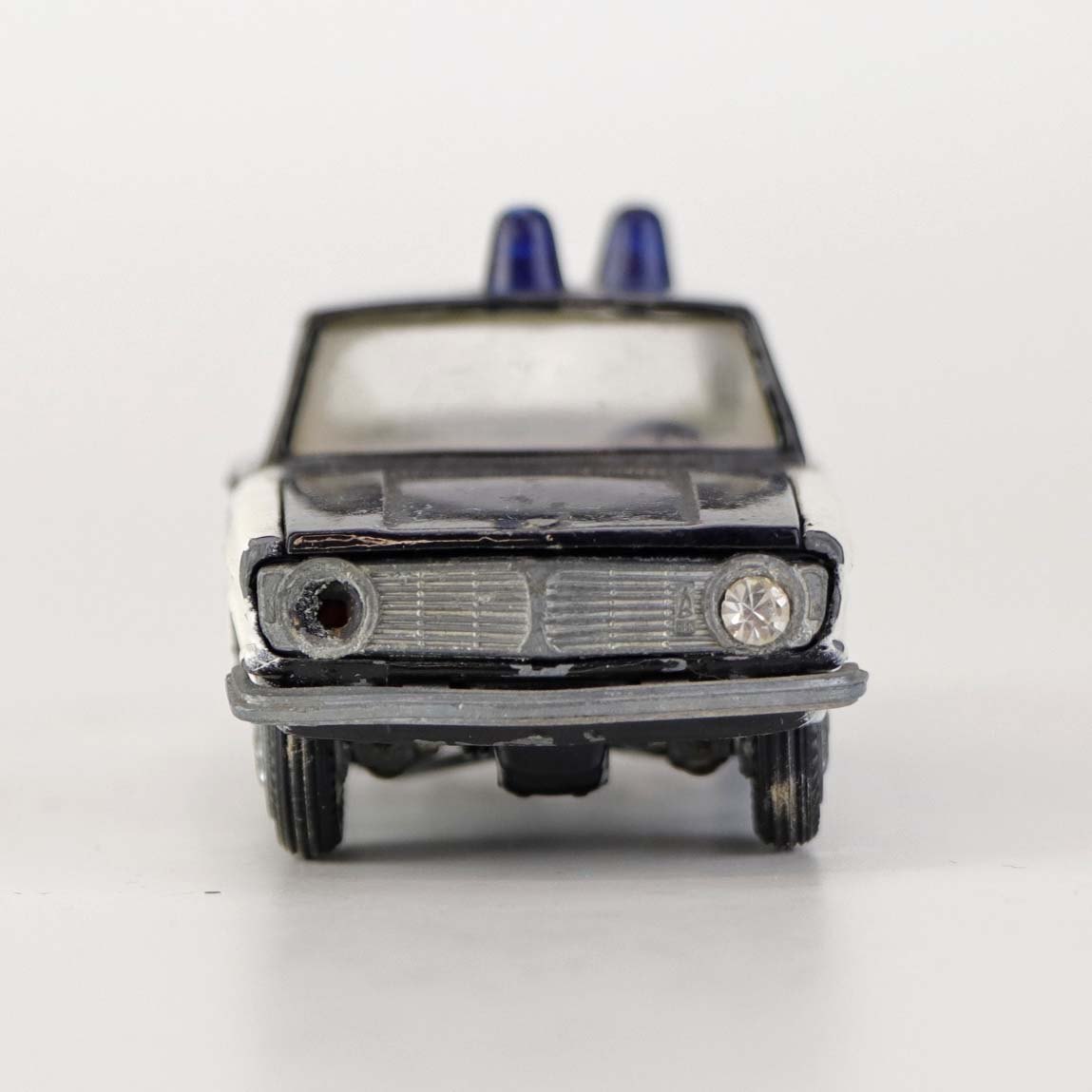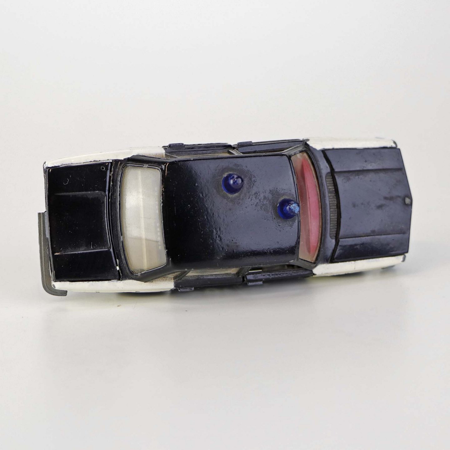 Beskrivelse: Politibil med to blinklys. Legetøjsbil i sortlakeret metal med gummi hjul og blå blinklys. Model Volvo 144