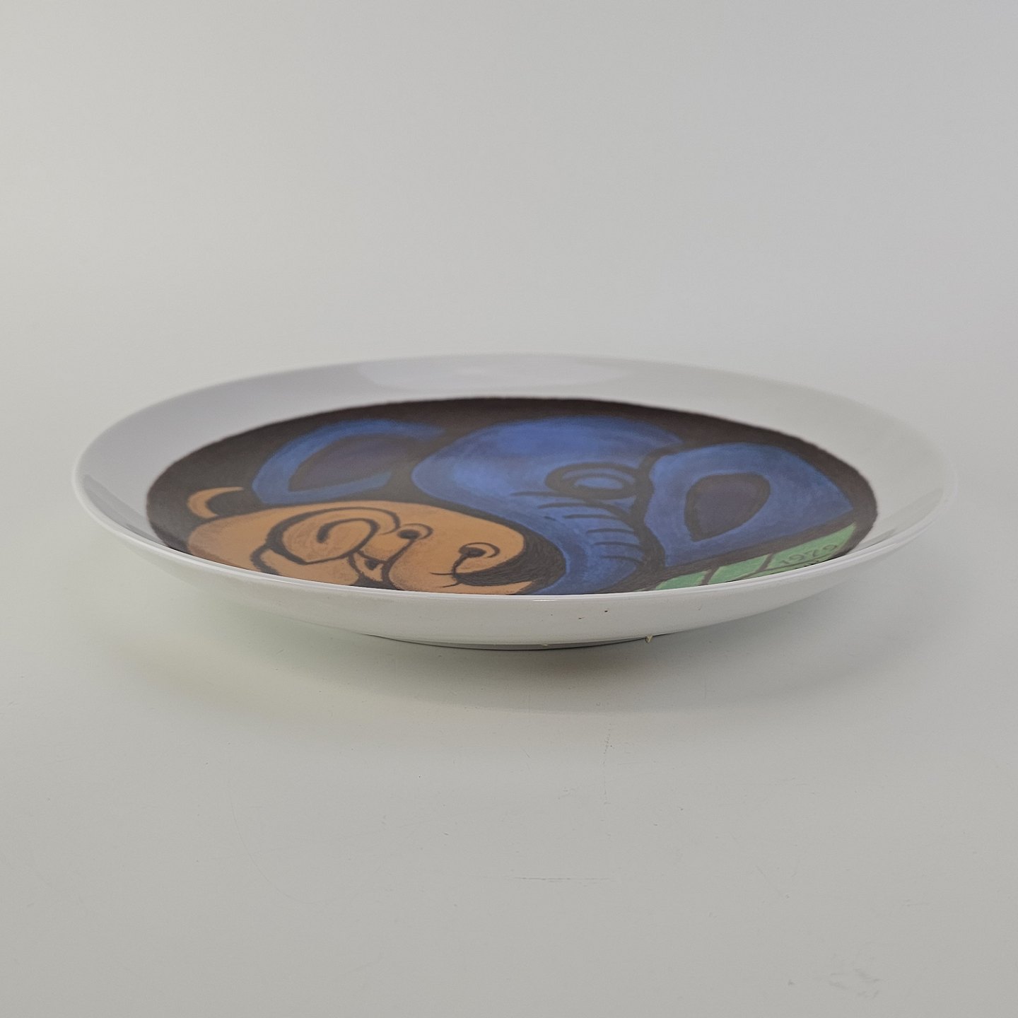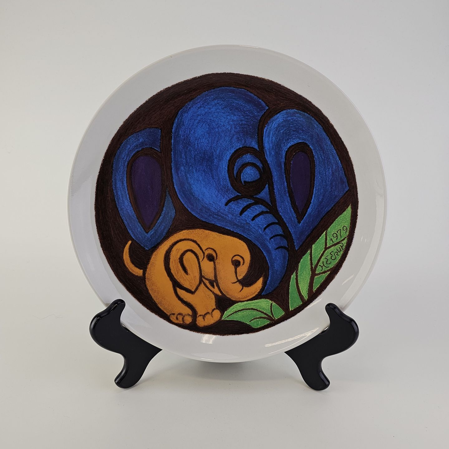 Beskrivelse: Platte af kongeligt porcelæn med motiv af elefanter i blå, orange og grønne farver. Nr. 115/1200