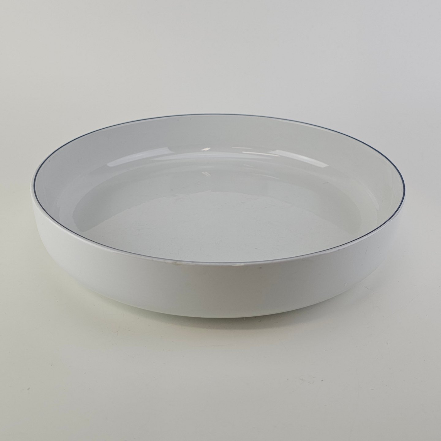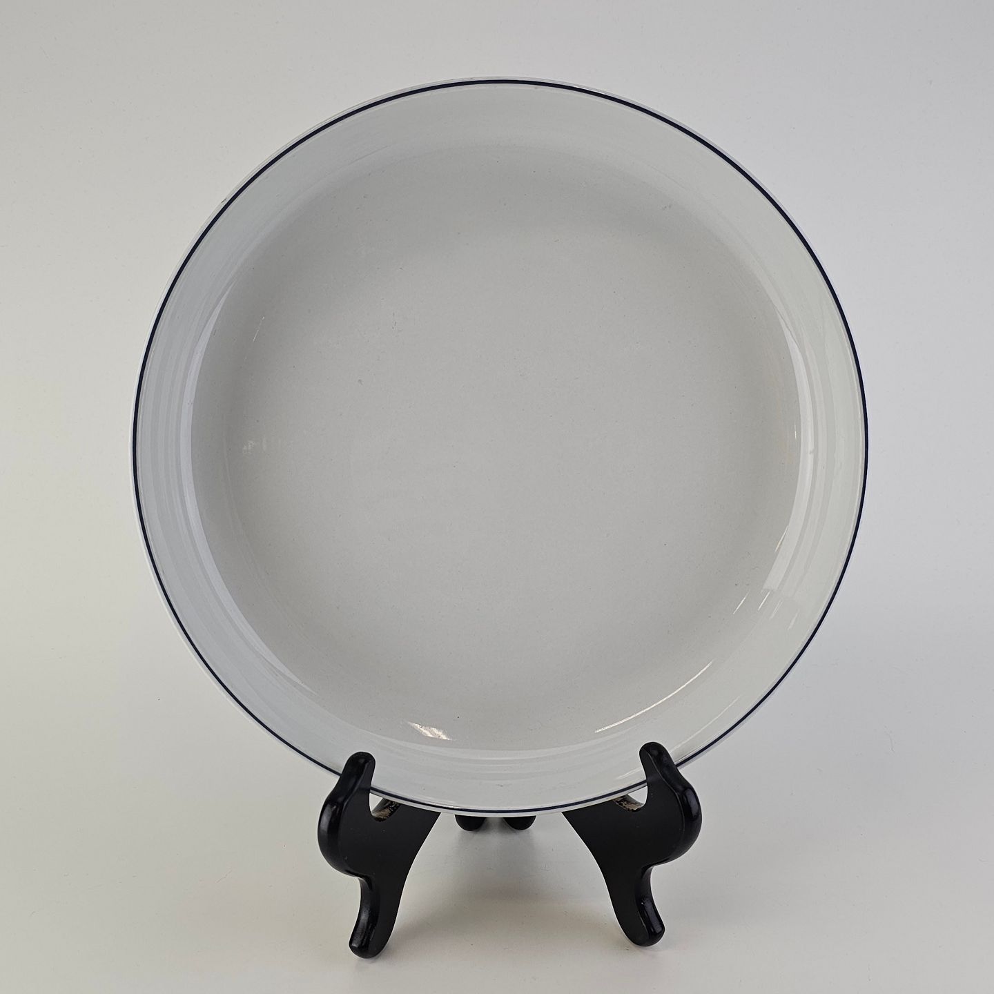 Blåkant er stel i hvid fajance med dekoration af en blå streg på kanten