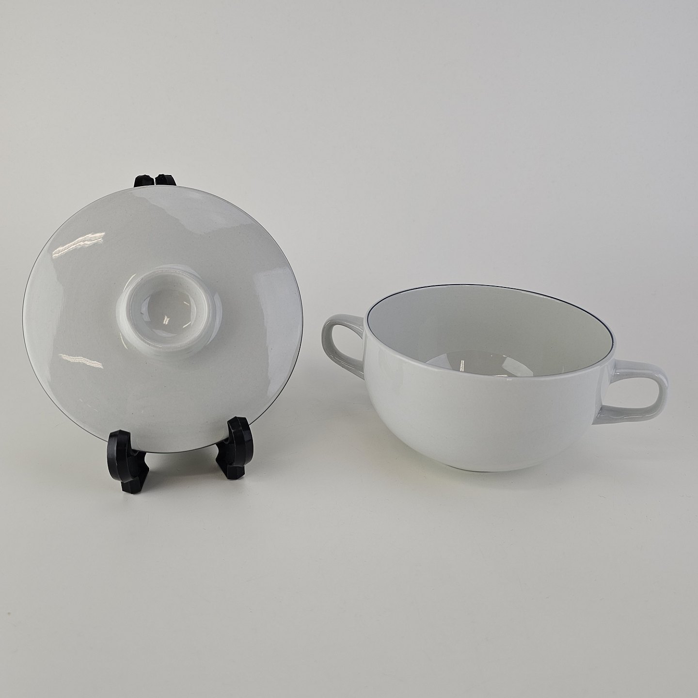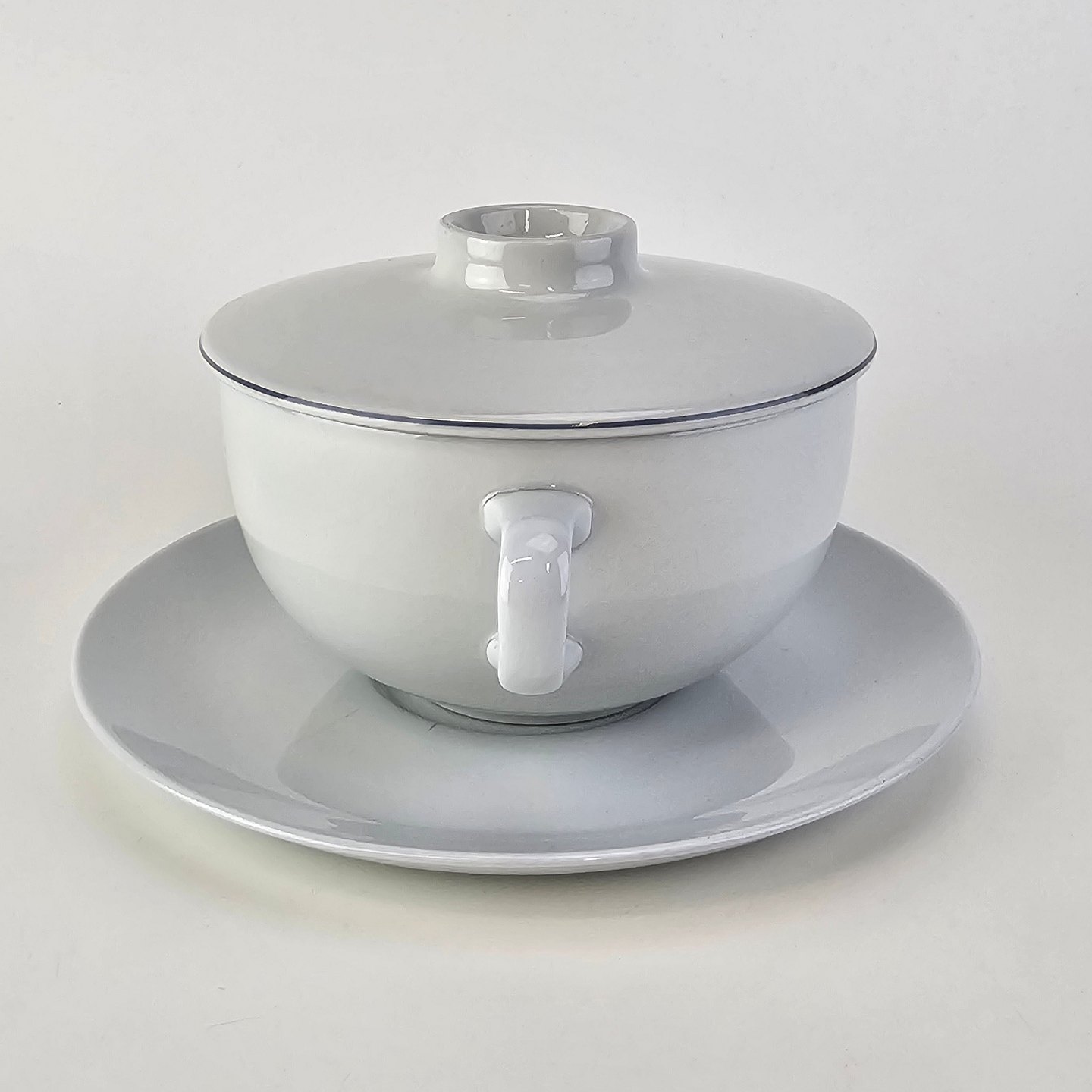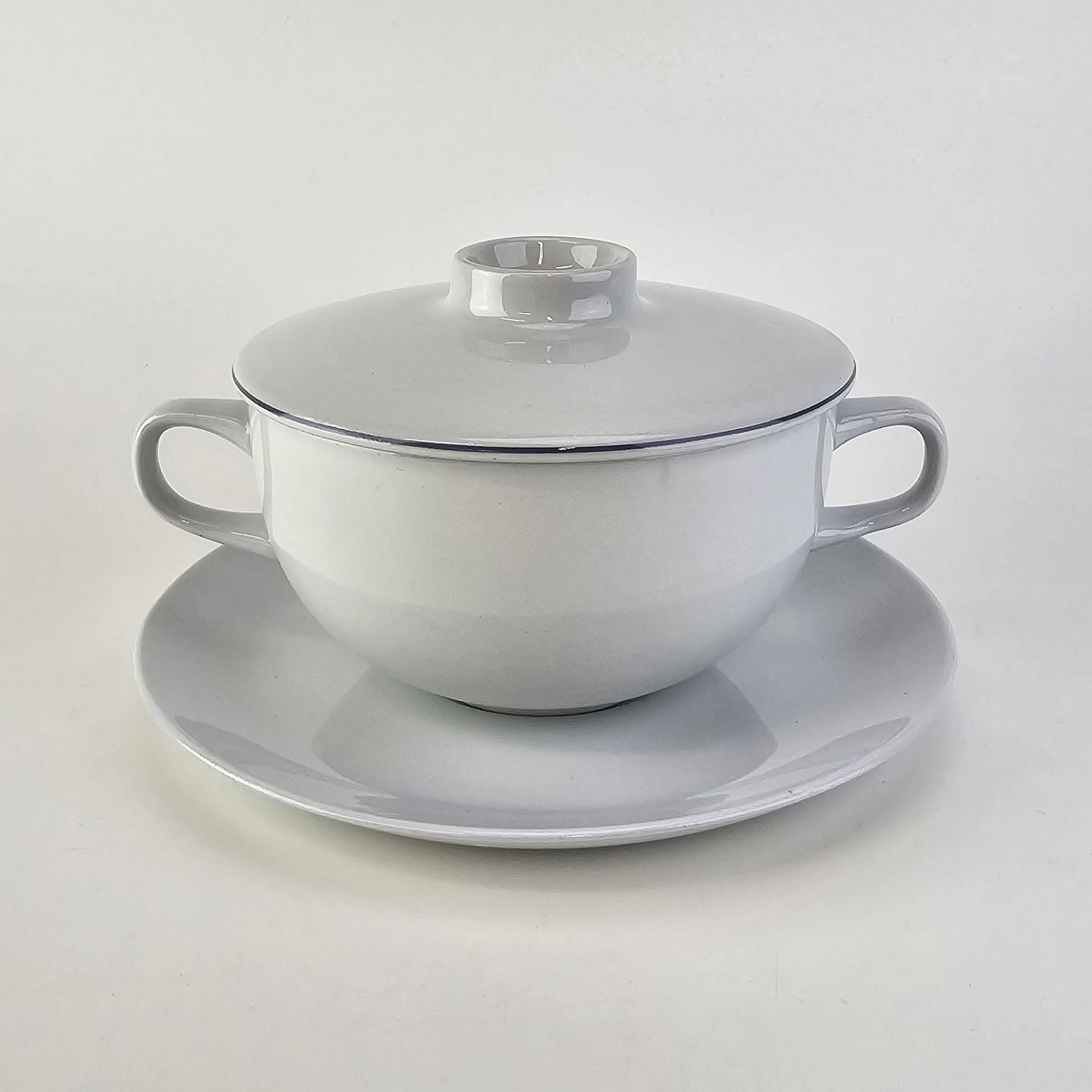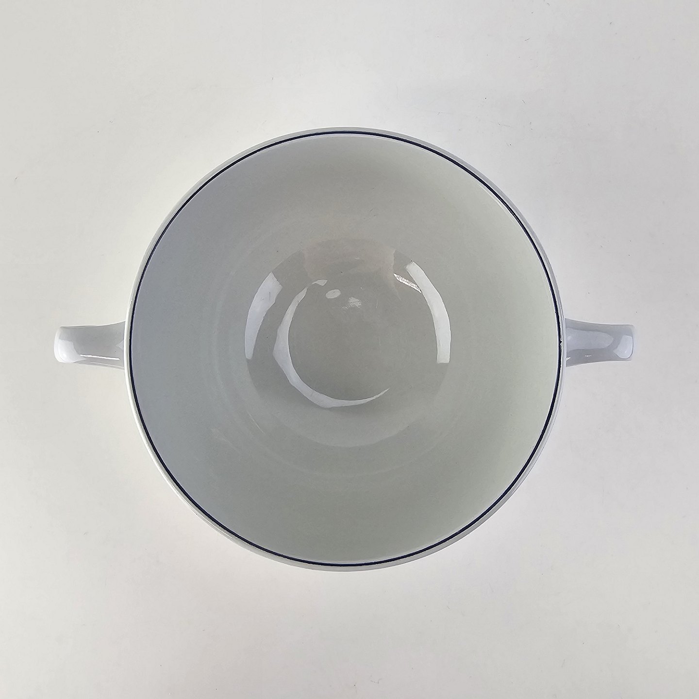 Blåkant er stel i hvid fajance med dekoration af en blå streg på kanten