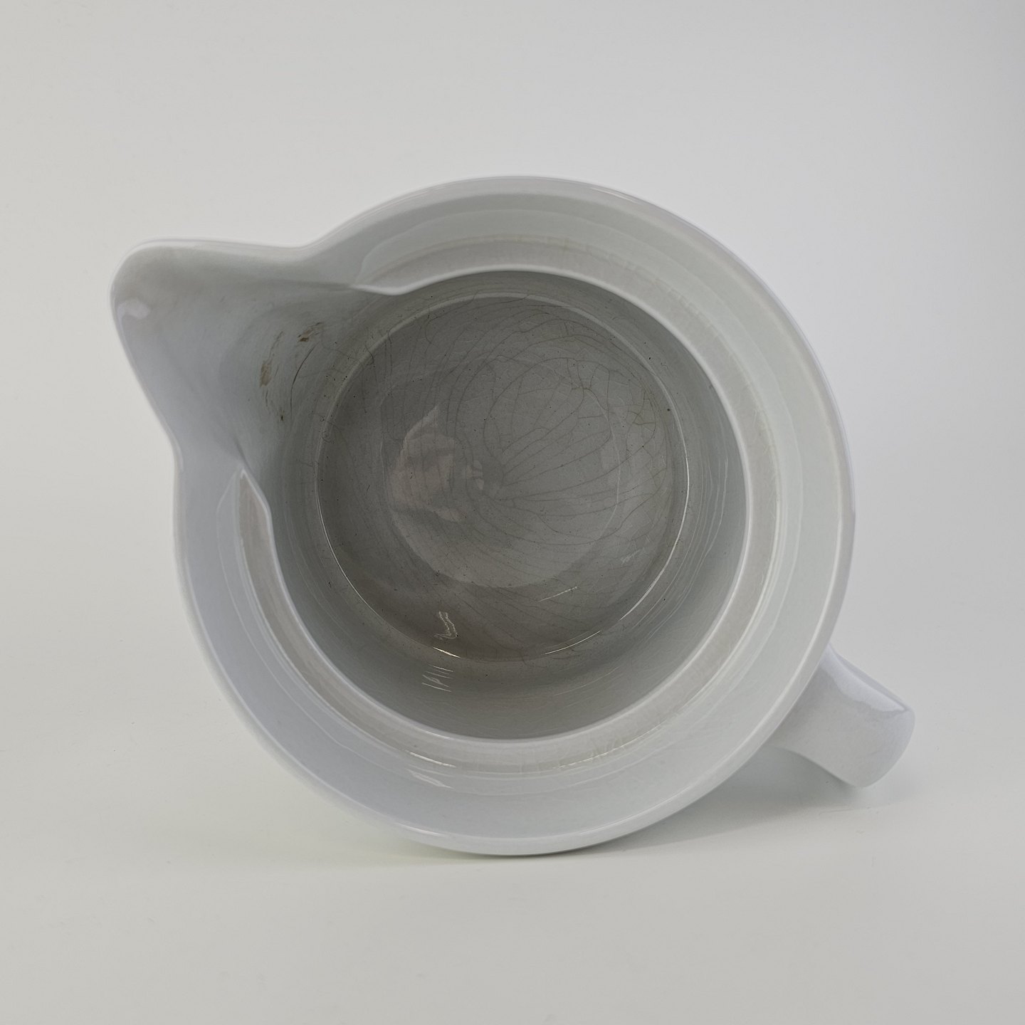 Fremstår med krakeleringer i overfladen og en mærkning på indersiden