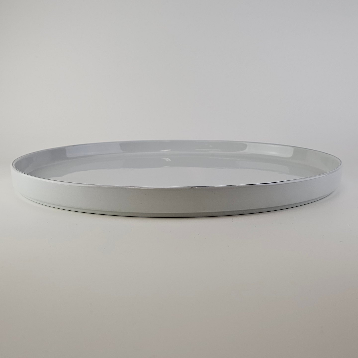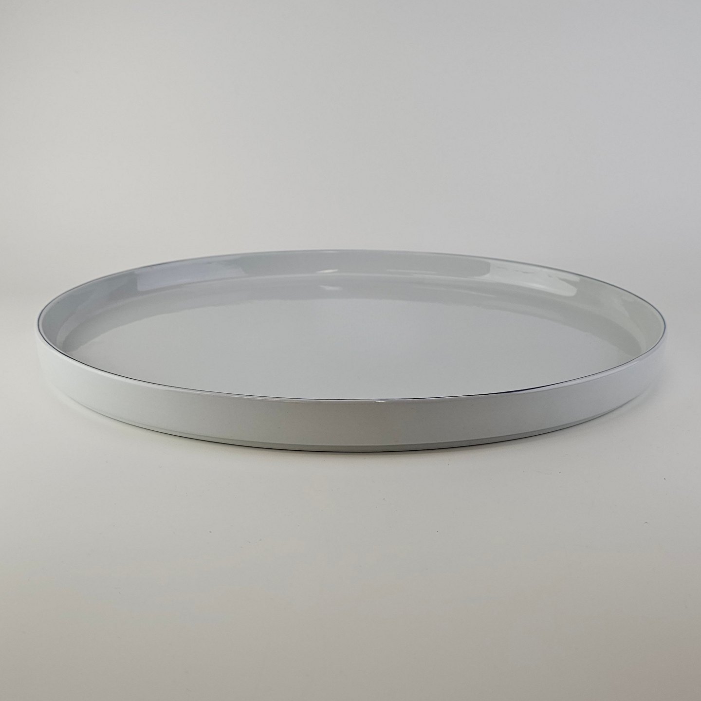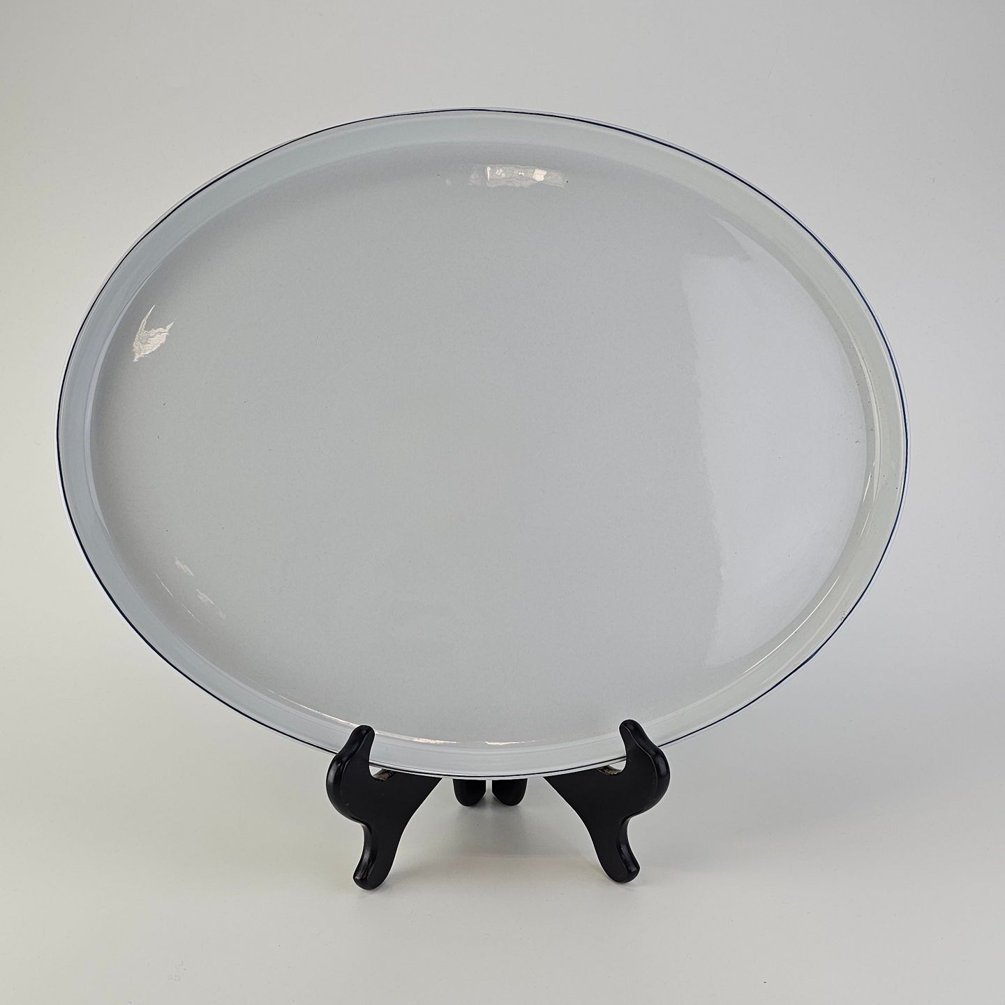 Blåkant er stel i hvid fajance med dekoration af en blå streg på kanten