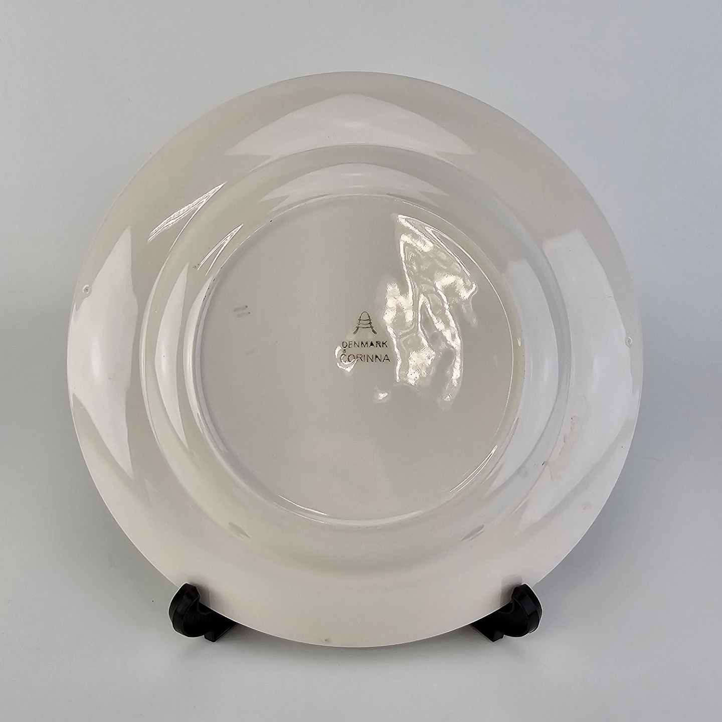 Beskrivelse: Flad tallerken i fajance fra stellet Corinna fremstillet i perioden 1937-1966