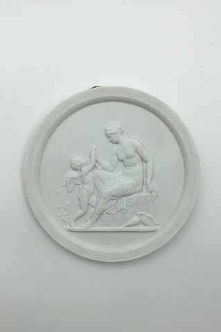 Description: Royal Copenhagen Biscuit Platte Amor complains to Venus about the sting of a beeCopy by O.H.B. Olrik from 1849 after Thorvaldsens original from Rom 1809. Small surface chip in the bottom left side Measures 14 cm (5.51 inches).