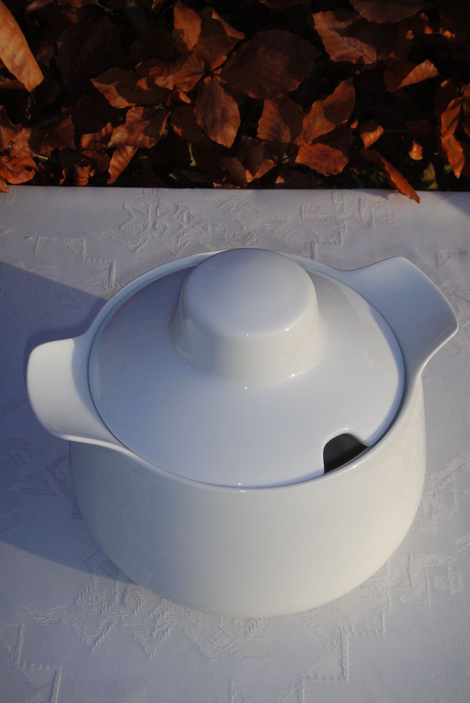 Beskrivelse: Koppel hvid, spise kaffestel fra Bing & Grøndahl, B&G porcelæn. B&G Hvid Koppel, lille terrin / lågfad nr. 5. højde uden låg 12,5cm. med låg højde 18cm. Diameter 18cm. Bredde 23cm. 1. Sortering fin hel stand.