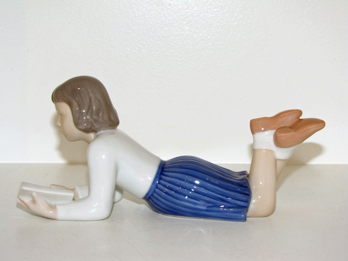 Beskrivelse: Bing & Grøndahl Figur, Liggende pige, der læser i bog - kaldet Merete.