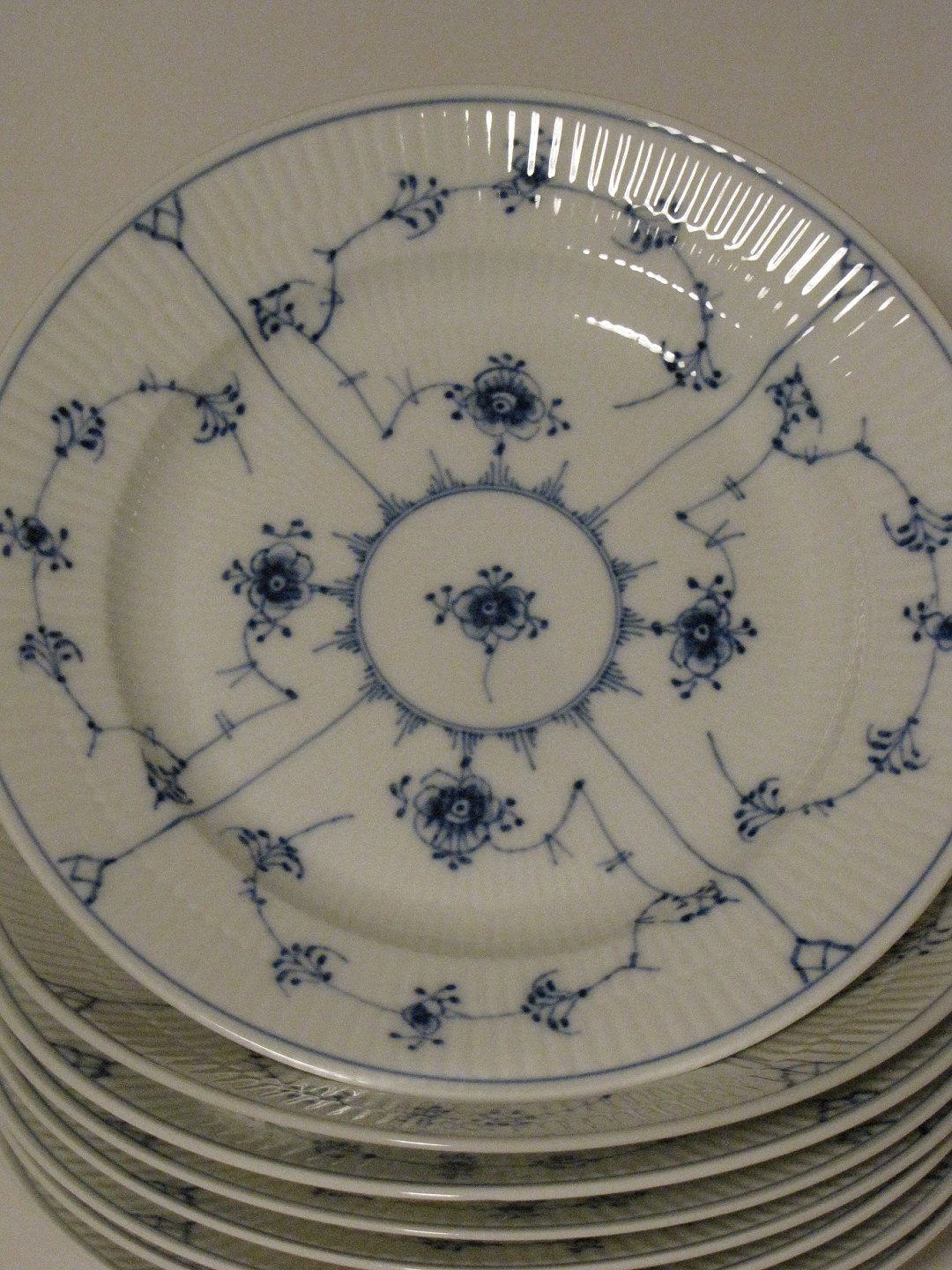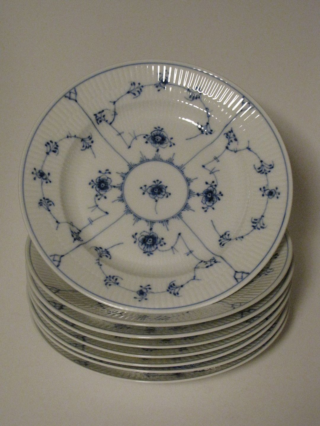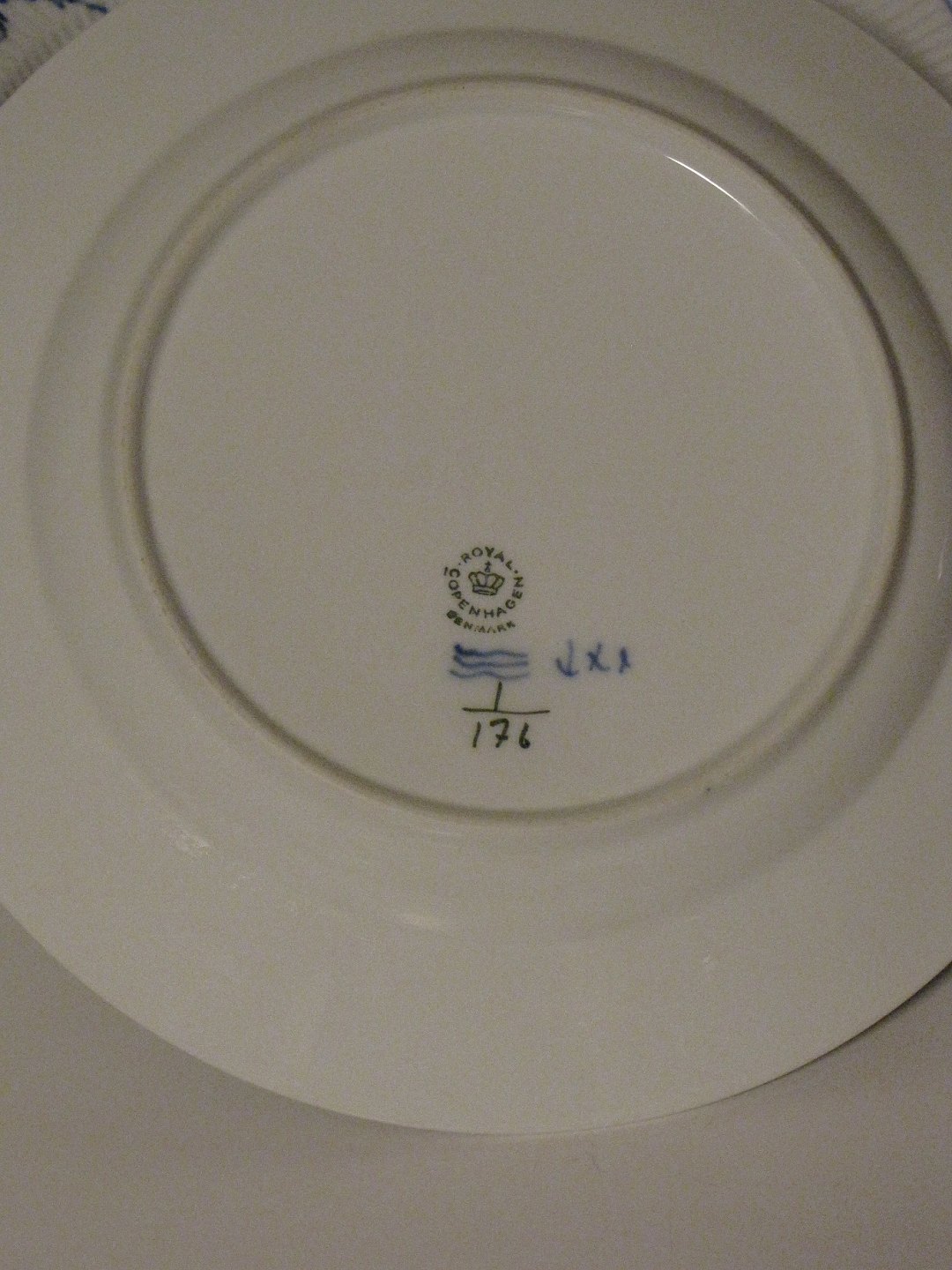 Beskrivelse: Musselmalet Riflet Tallerken fra Royal Copenhagen. Nummer 176, Diameter ca. 23 cm. 1-2. sortering.