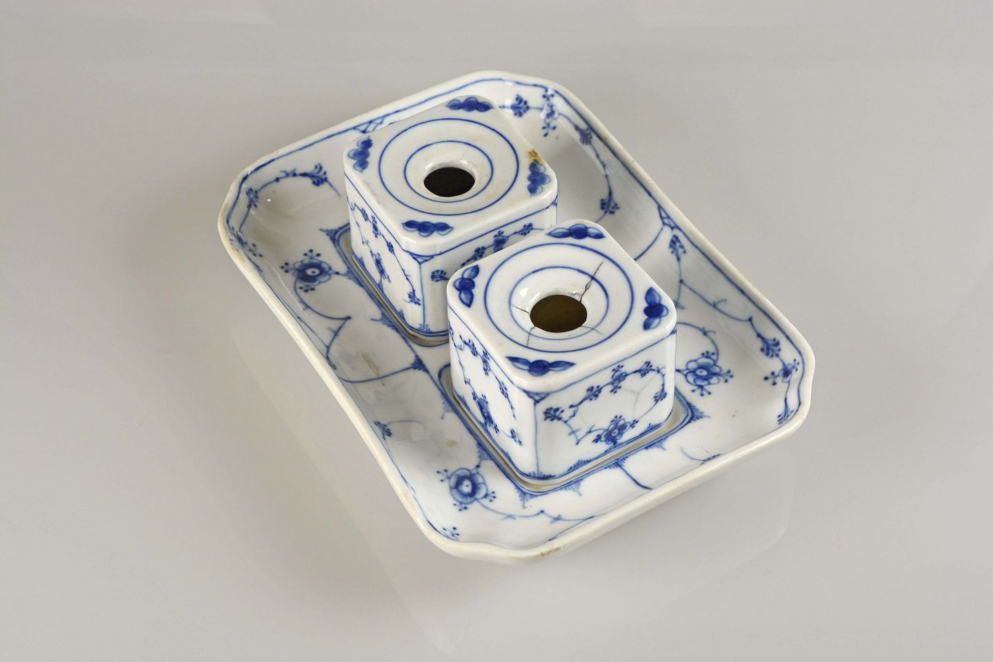 Beskrivelse: Blåmalet Blækhussæt fra perioden år 1853-1895 fra Bing og Grøndahl
