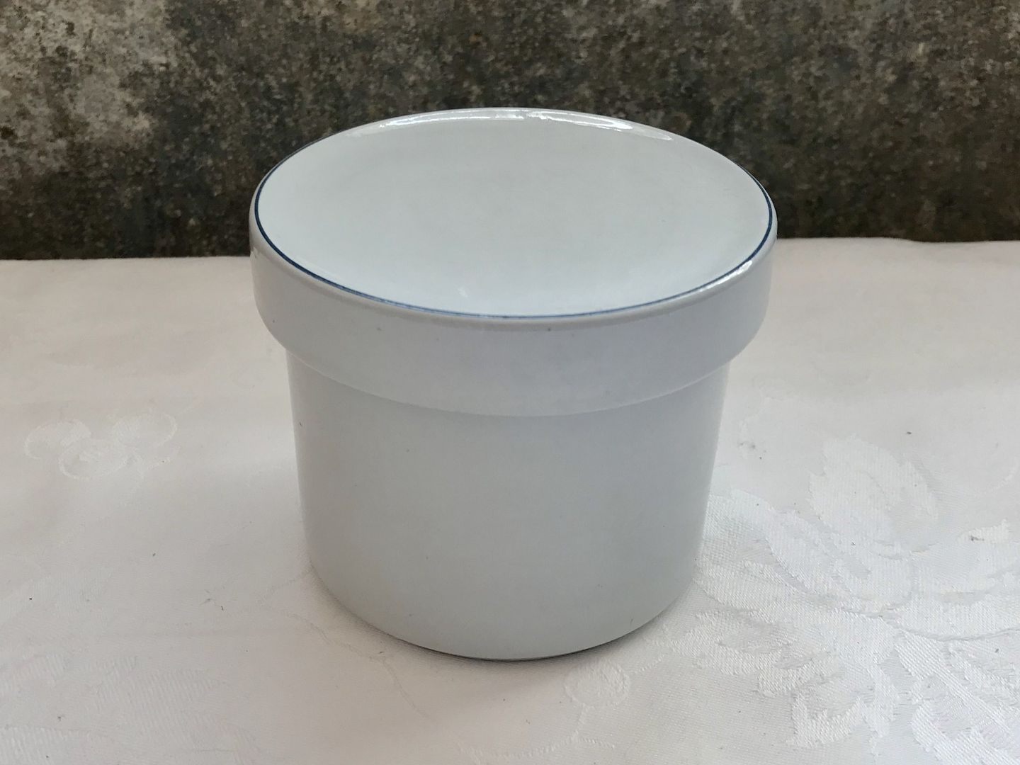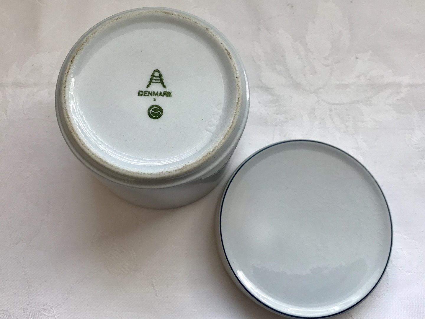 Beskrivelse: Royal Copenhagen, Aluminia, Blå kant, Lågkrukke #3051, 8cm høj, 9cm i diameter, Design Grethe Meyer *pæn brugt stand*