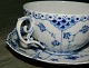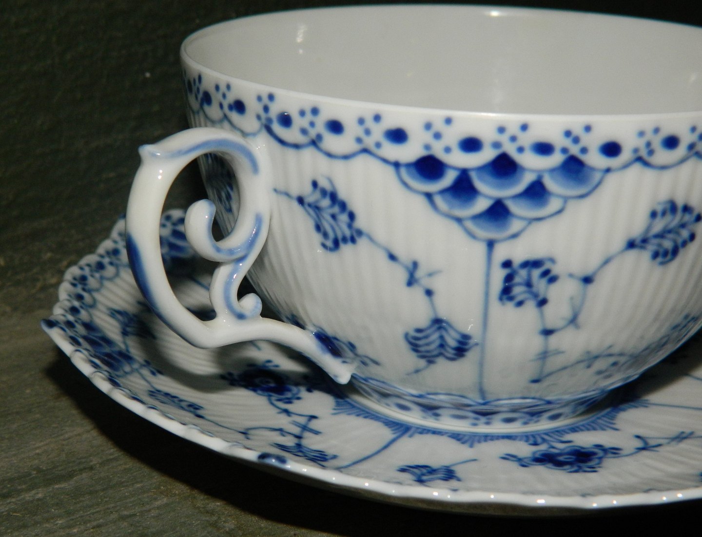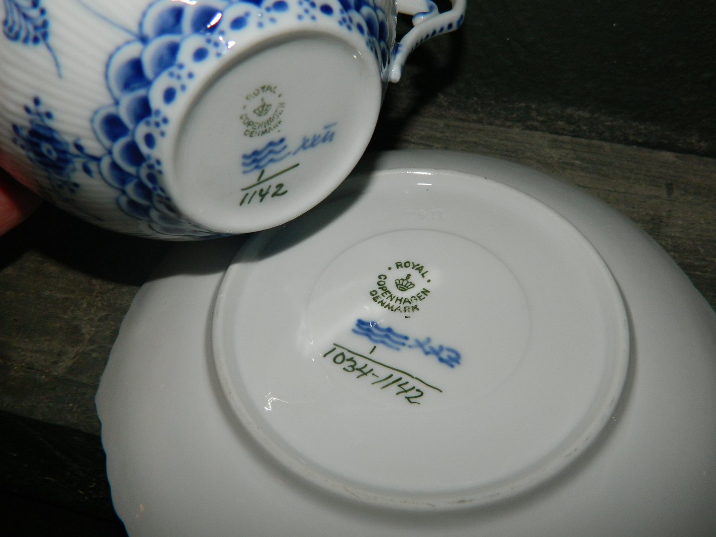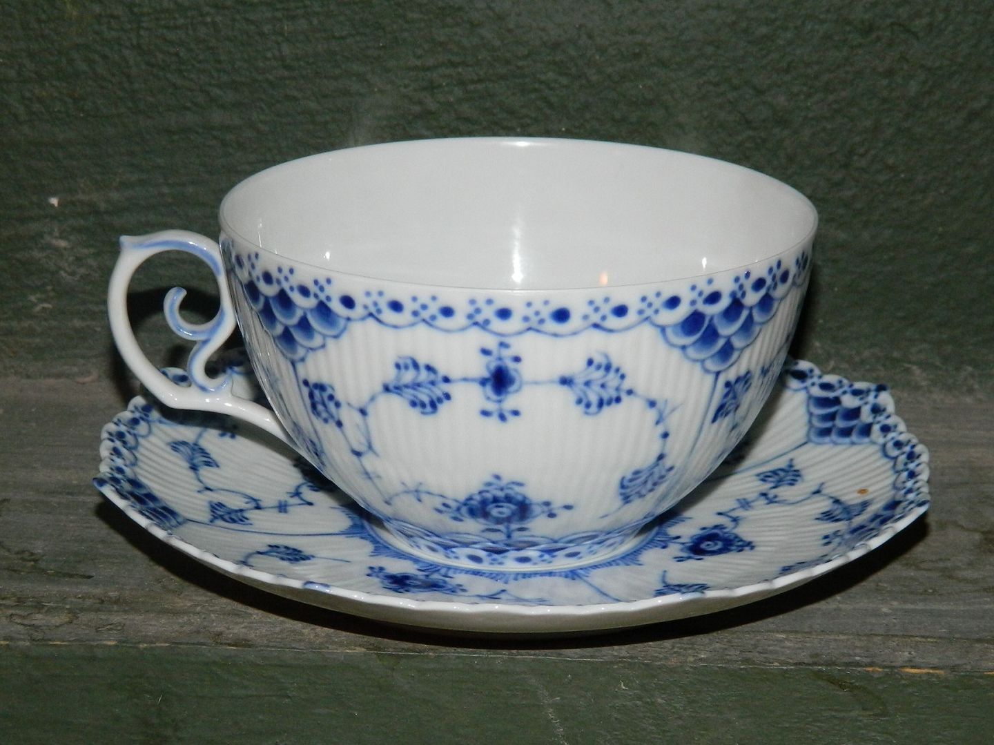Description: Royal Copenhagen Blue Fluted Half Lace Large Teacup / Breakfast Cup. Model number 1142. Factory first production. Dimensions: H. 6½ cm DIA. 11 cm. Saucer dimensions: diaM. 16 cm.