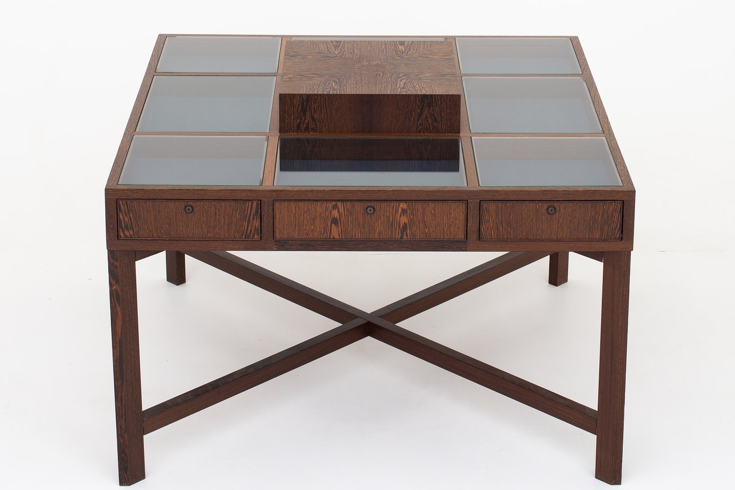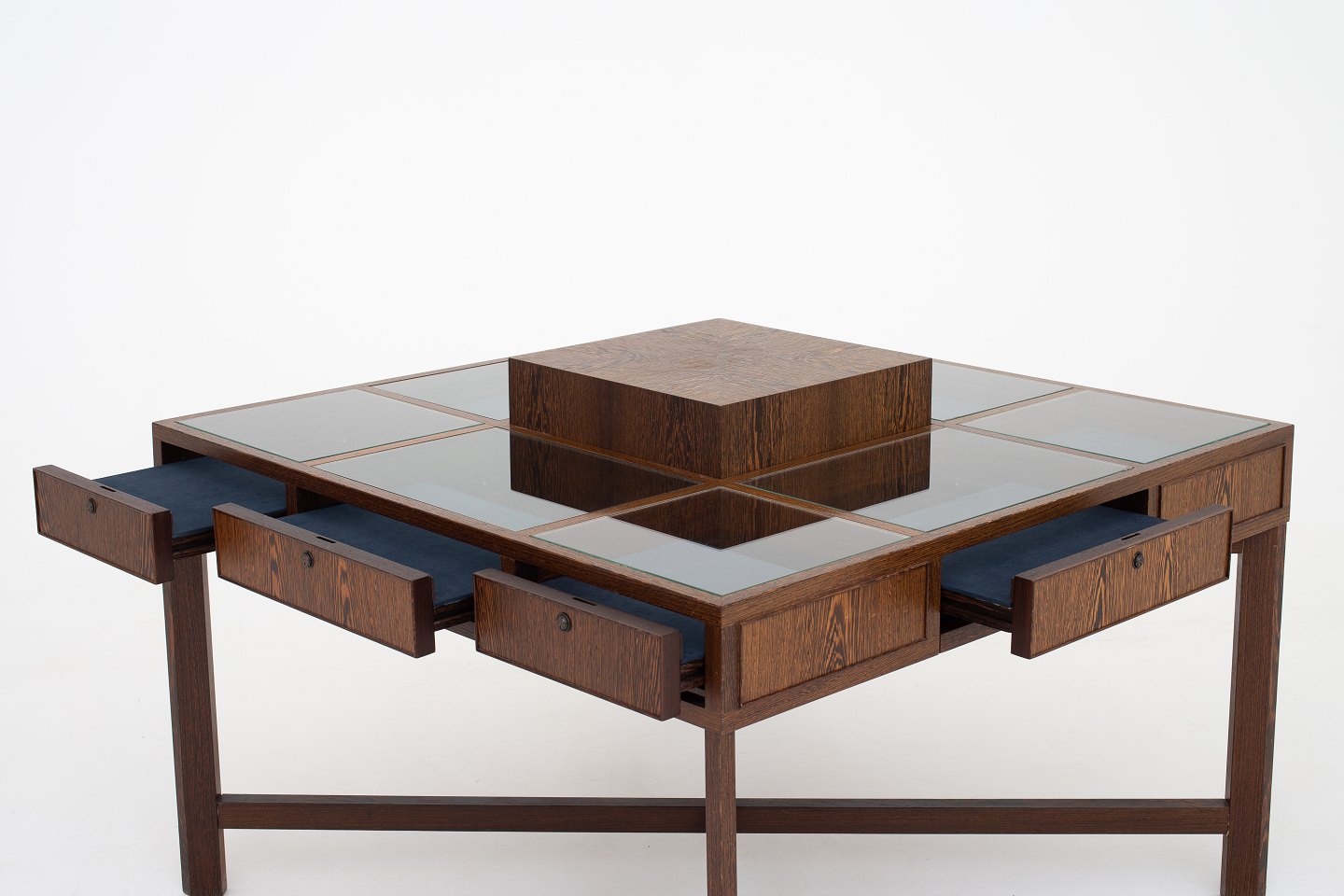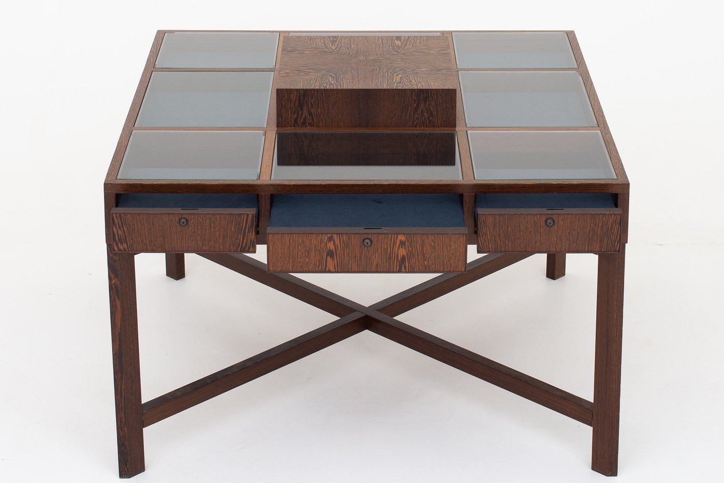 Jewelry disk in wengé made in eight drawer sections w. glass surfaces and blue cotton upholstery, furthermore two extraction plates w. brown leather top. The disk is made for Georg Jensen in the beginning of 1980's.