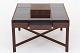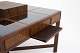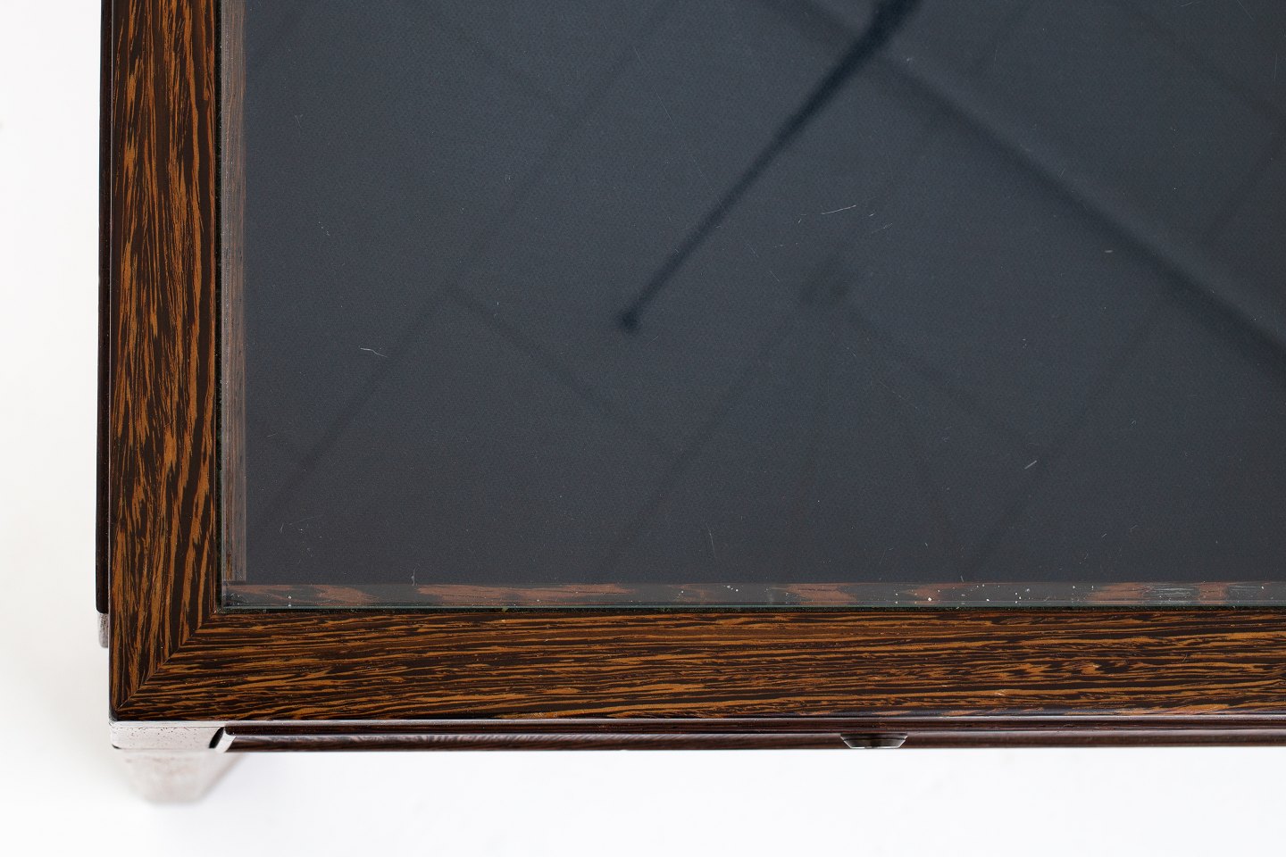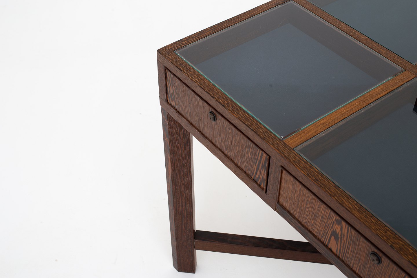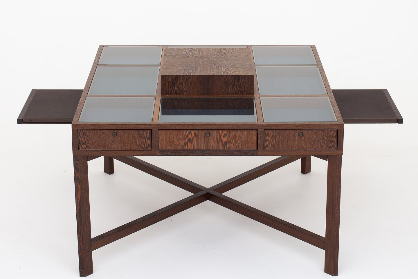 Jewelry disk in wengé made in eight drawer sections w. glass surfaces and blue cotton upholstery, furthermore two extraction plates w. brown leather top. The disk is made for Georg Jensen in the beginning of 1980's.