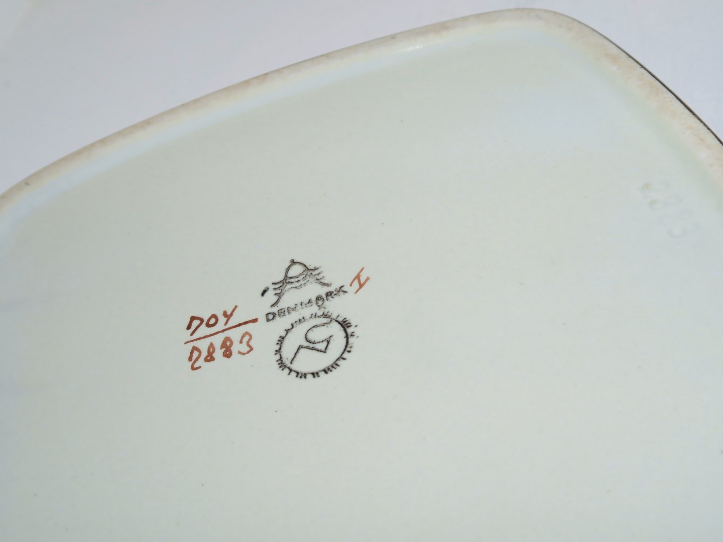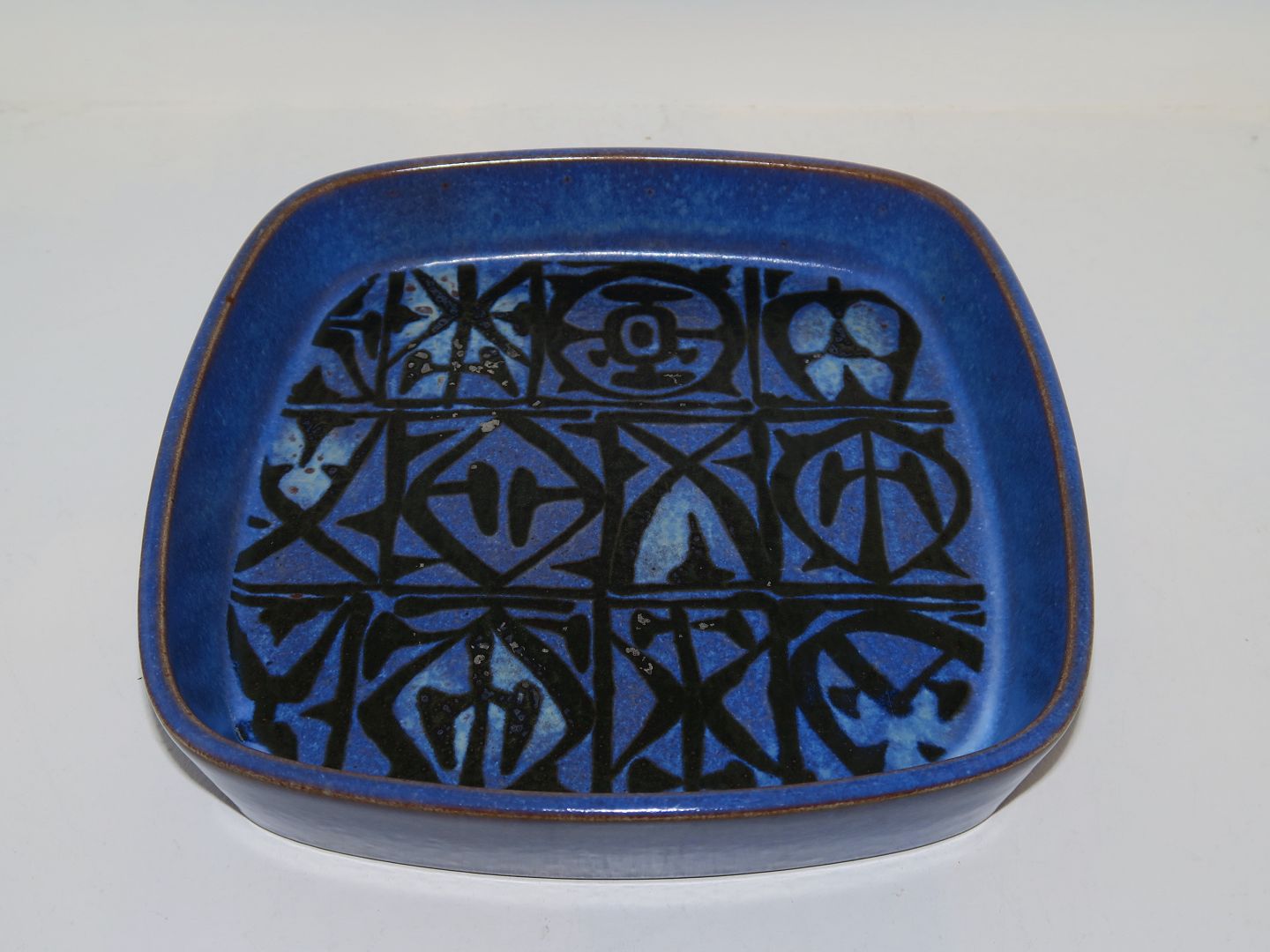 Beskrivelse: Aluminia - Royal Copenhagen Baca, blå firkantet skål.