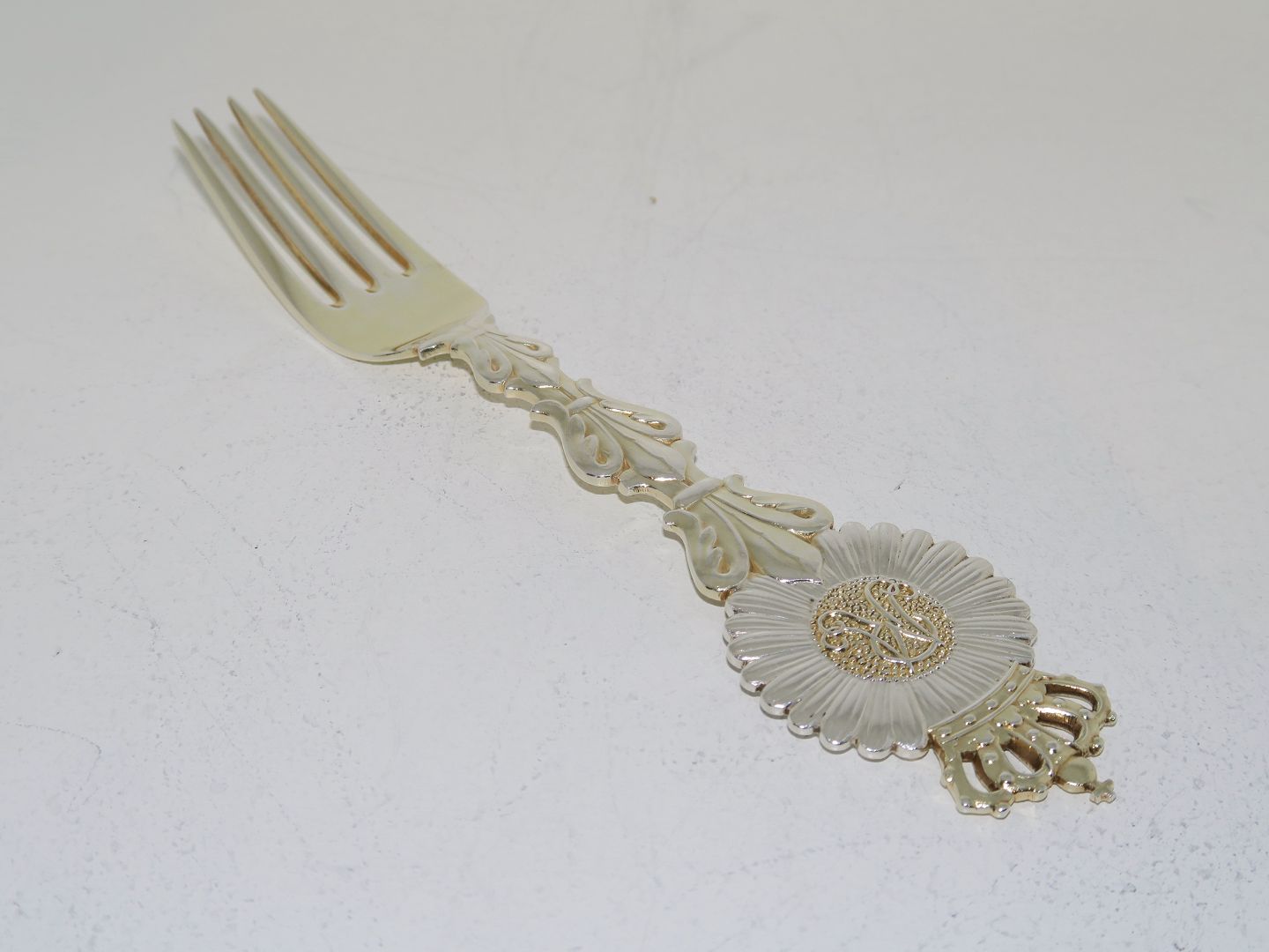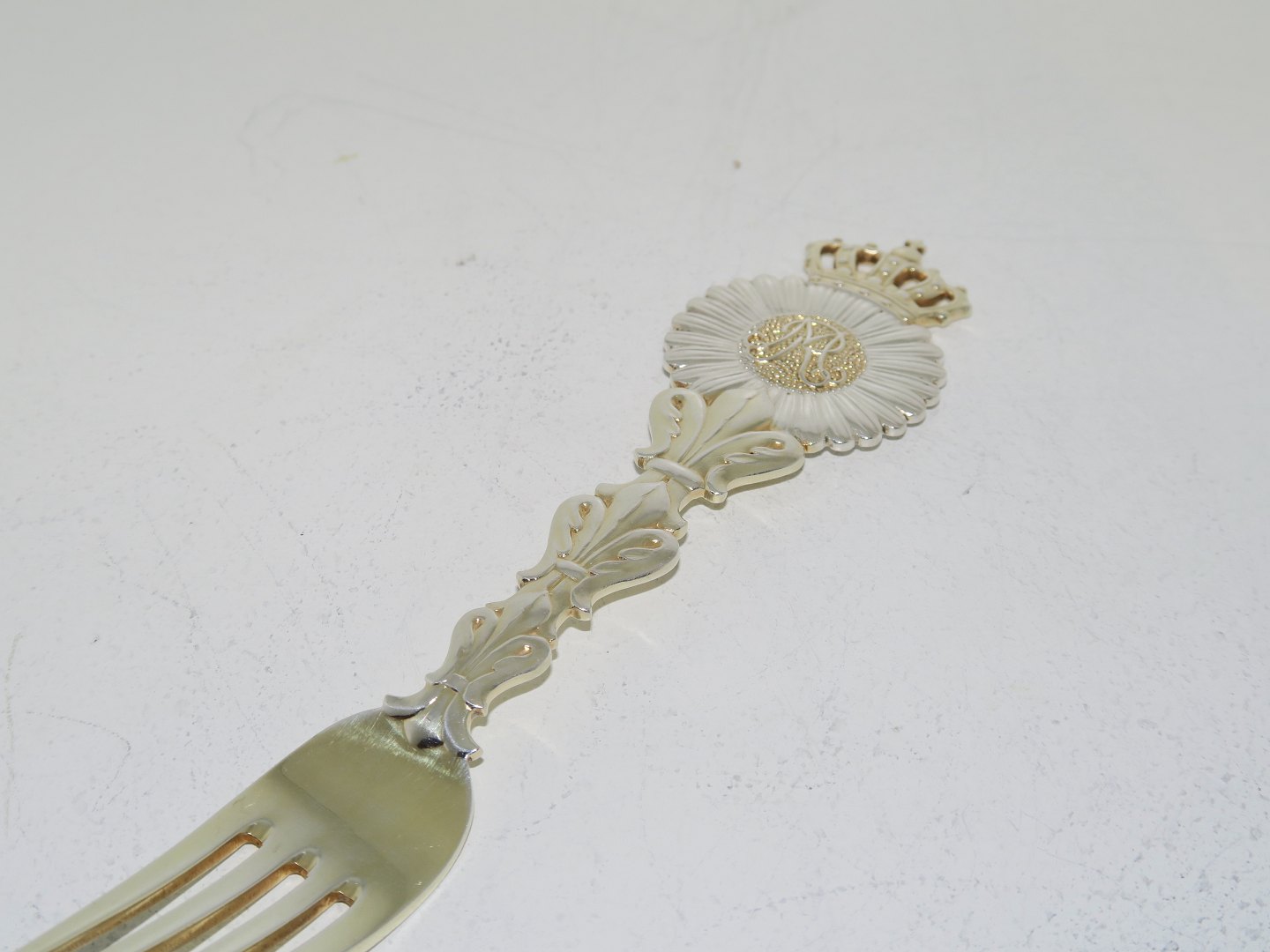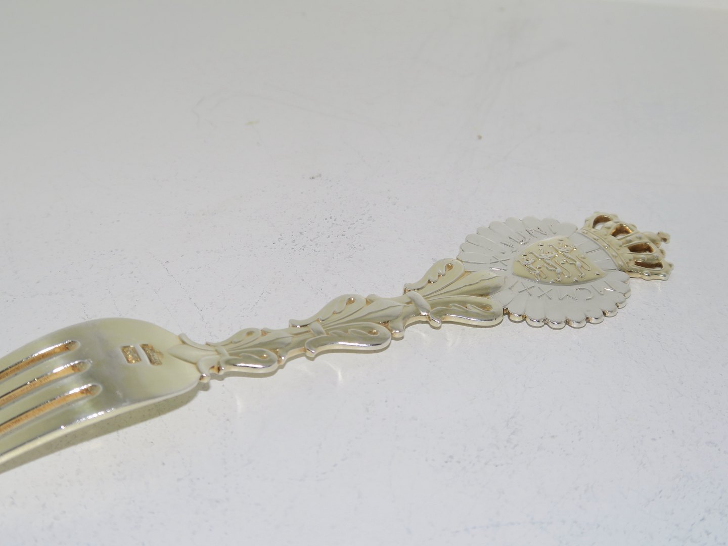 Beskrivelse: Anton Michelsen forgyldt sterlingsølv, mindegaffel fra 1921.