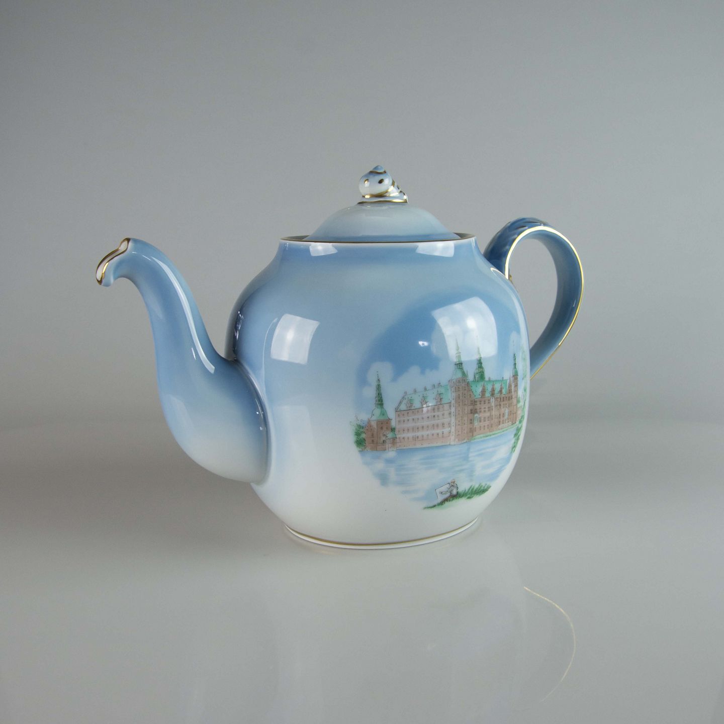 Beskrivelse: Tekande i porcelæn fra Danmarksstellet med guldkant og motiv af Kronborg. Nr. 656/3562
