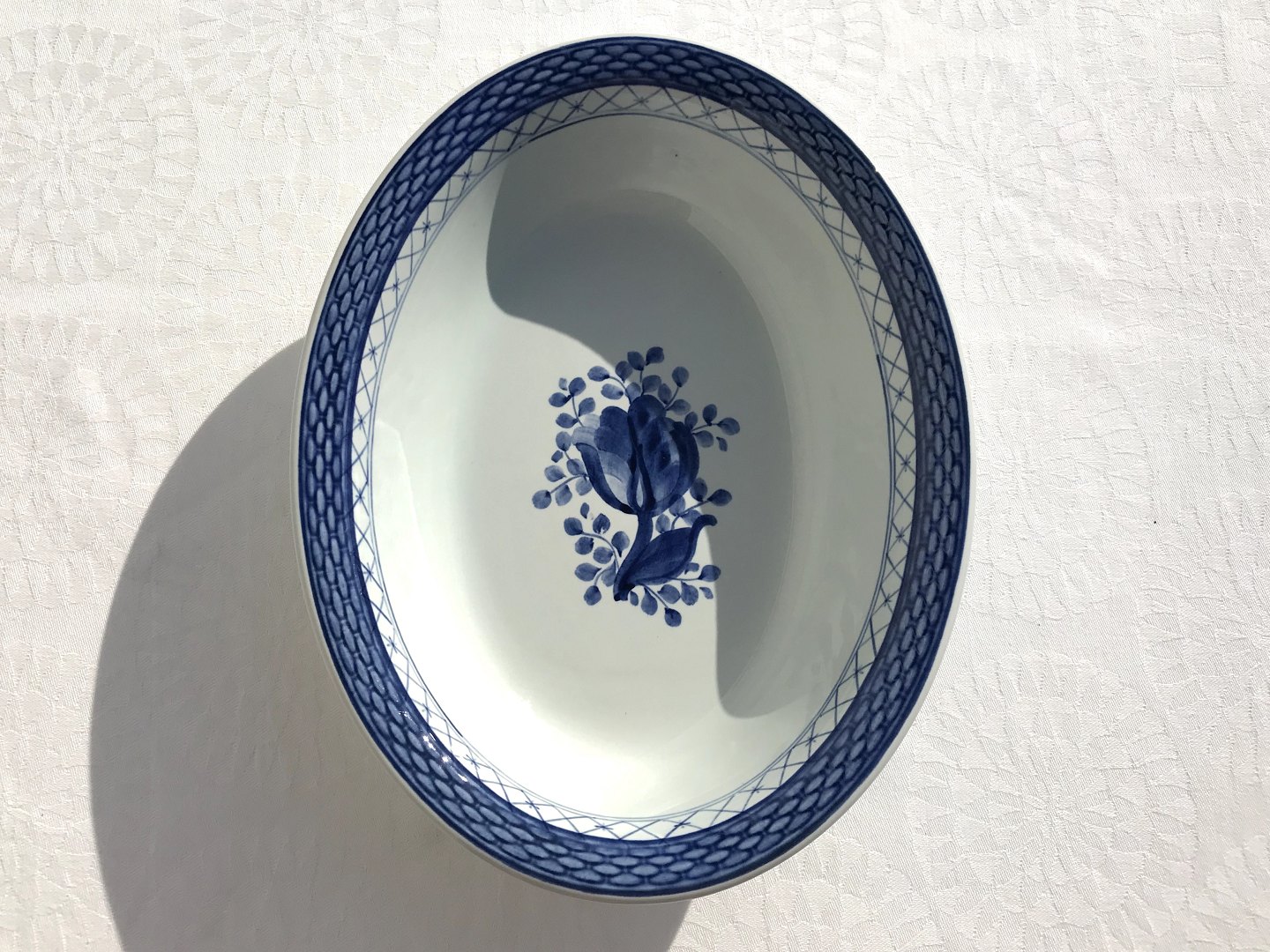 Beskrivelse: Royal Copenhagen, Aluminia, Trankebar, Serveringsskål #11/1410, 24cm bred, 18,5cm dyb,5cm høj, 2. sortering, Design Christian Joachim *pæn stand*