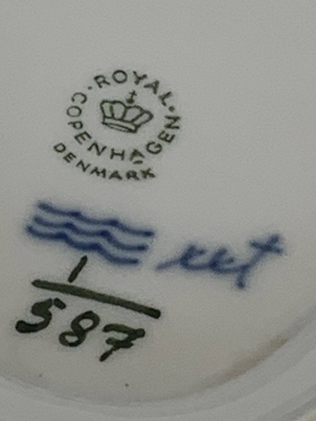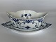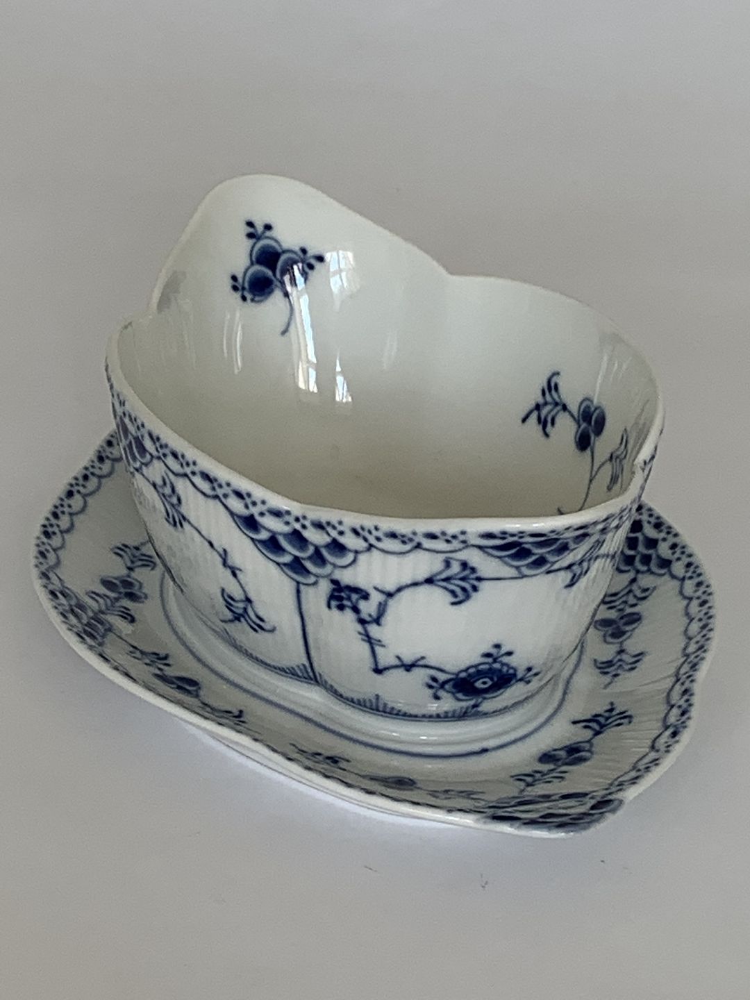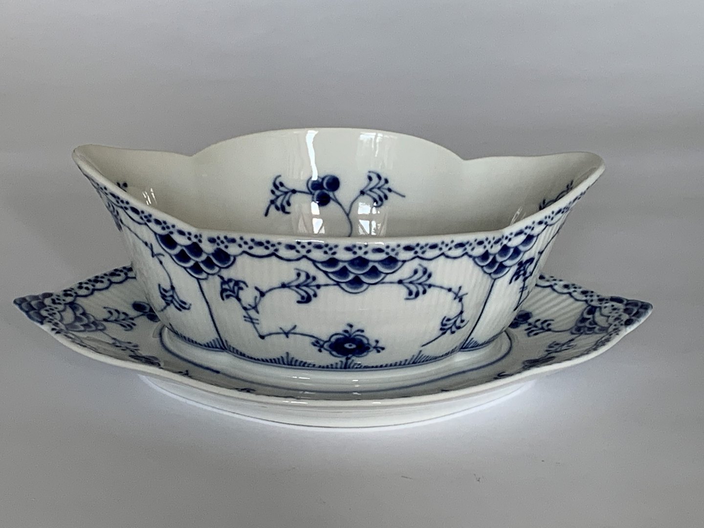 Beskrivelse: Musselmalet Halvblonde sovseskål fra Royal Copenhagen. Længde 24 cm. Nummer 587. 1. sortering