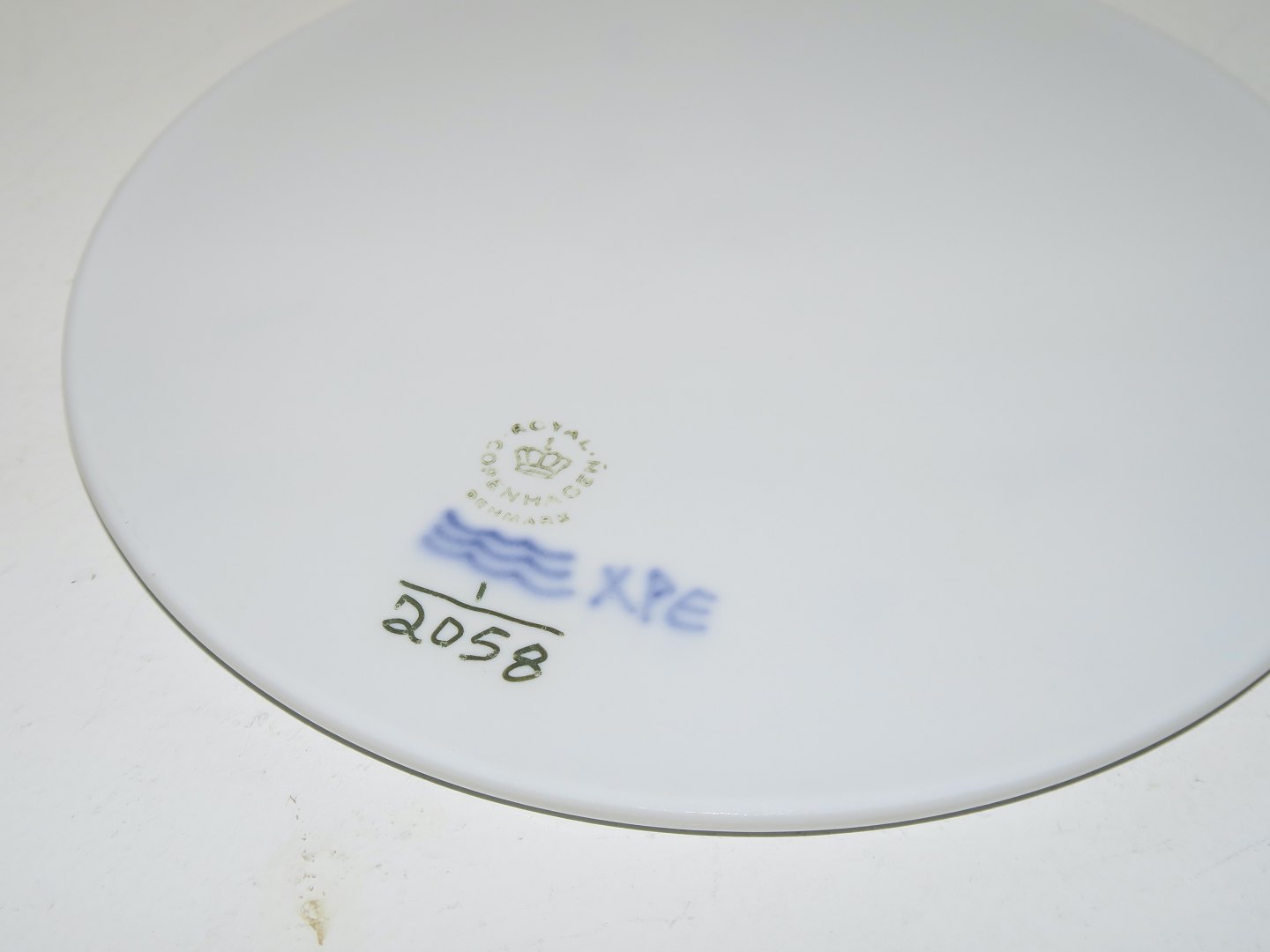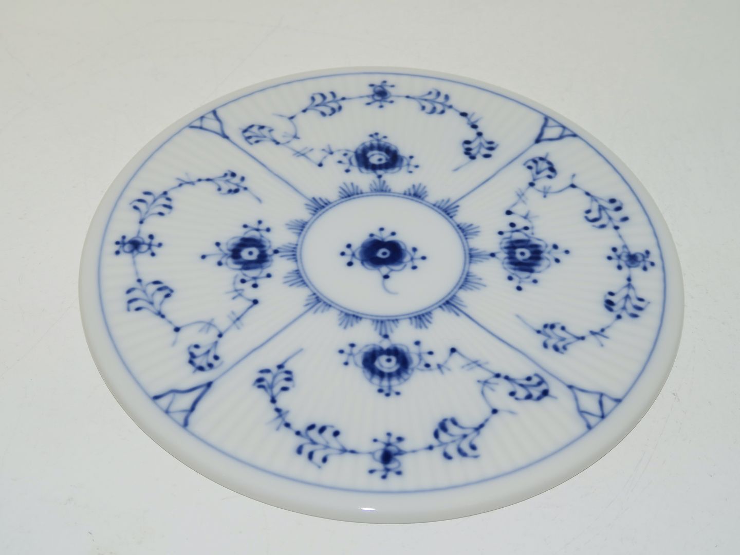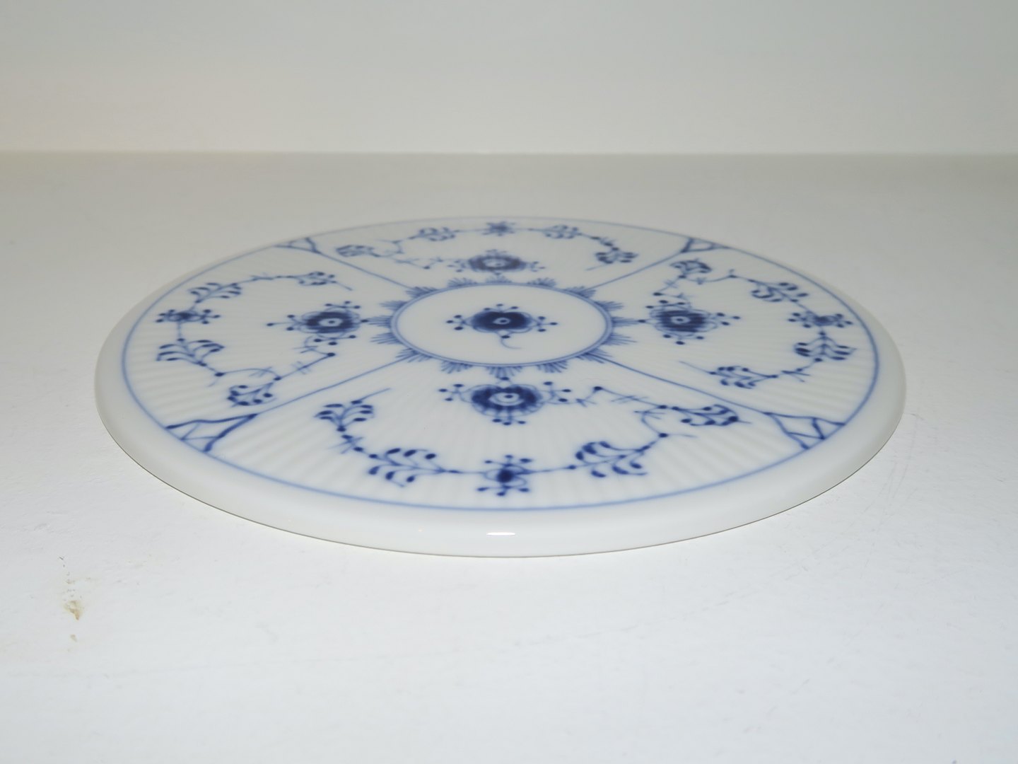 Beskrivelse: Royal Copenhagen Musselmalet Riflet, sjældent rundt smørbræt / varmebrik. Det er helt fladt og vipper ikke.