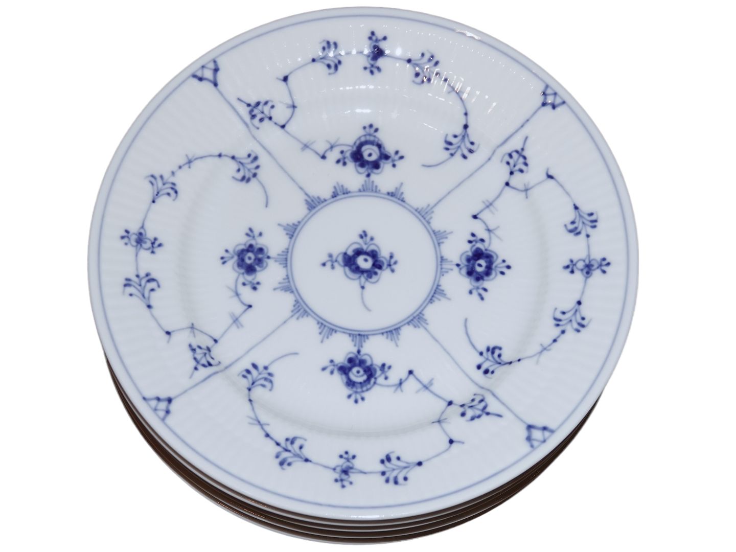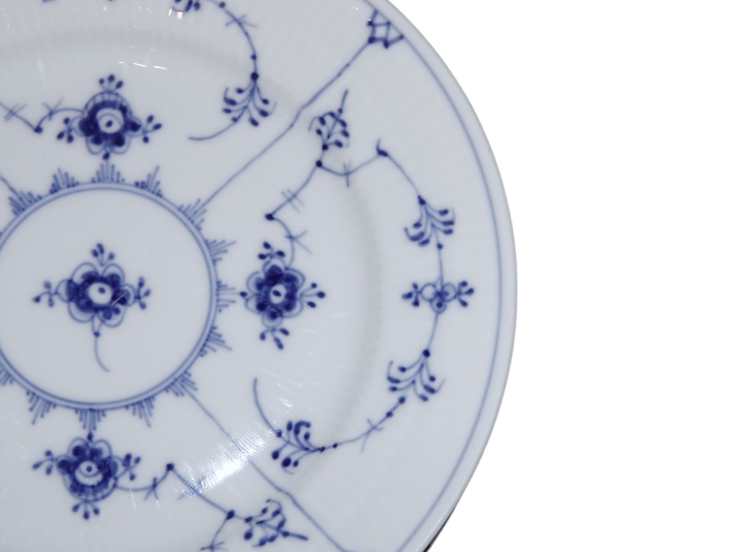 Beskrivelse: Royal Copenhagen Musselmalet Riflet, stor kagetallerken.