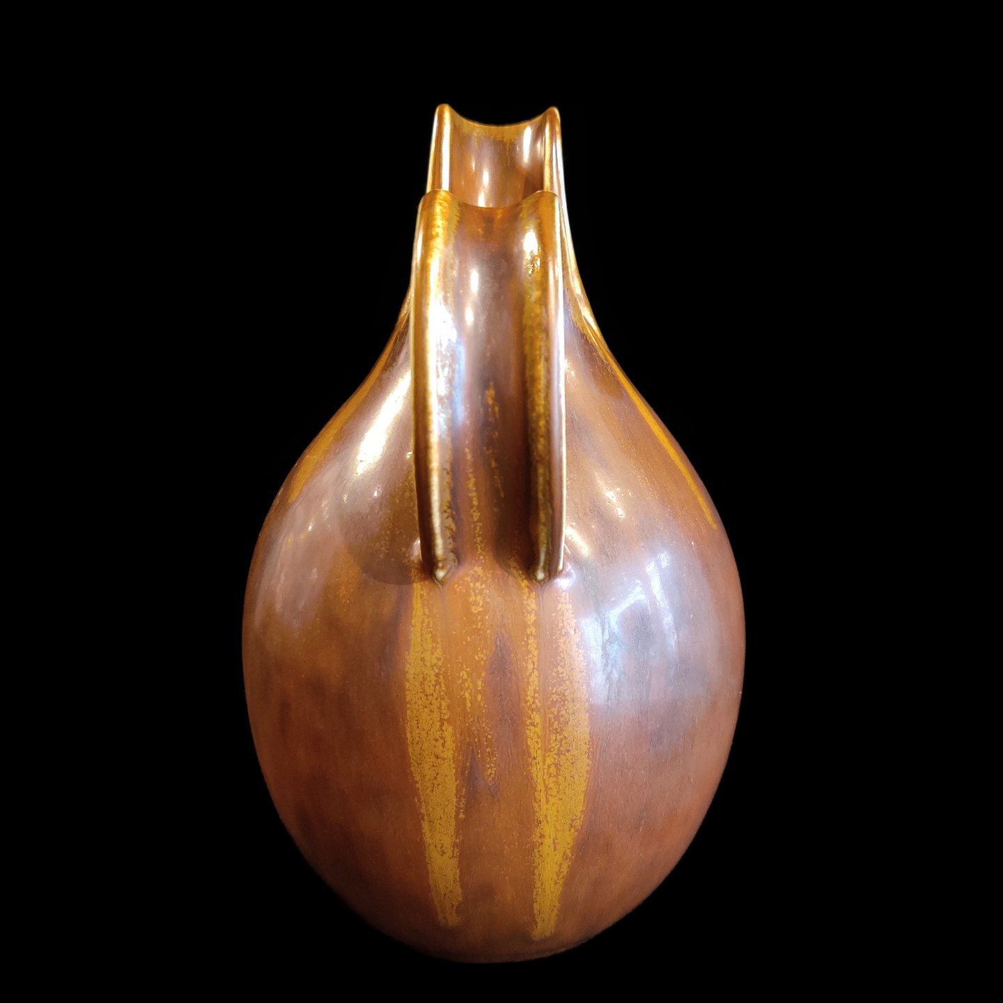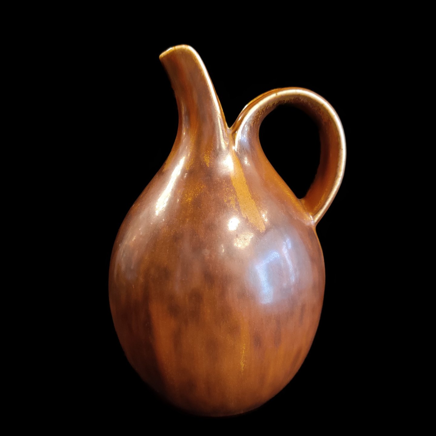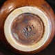 Beskrivelse: Eva Stæhr-Nielsen for Saxbo; Spaltekande i stentøj dekoreret med brun glasur #64. H. 18,5 cm.