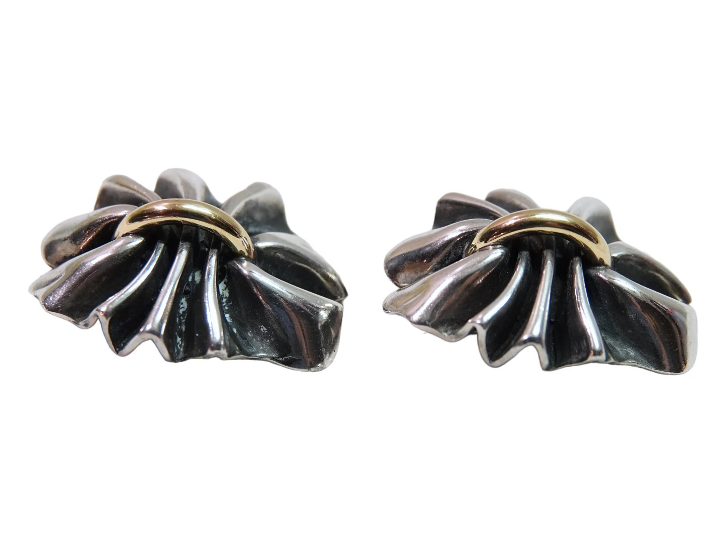 Beskrivelse: Georg Jensen store øreclips i sterlingsølv og 18 karat guld.