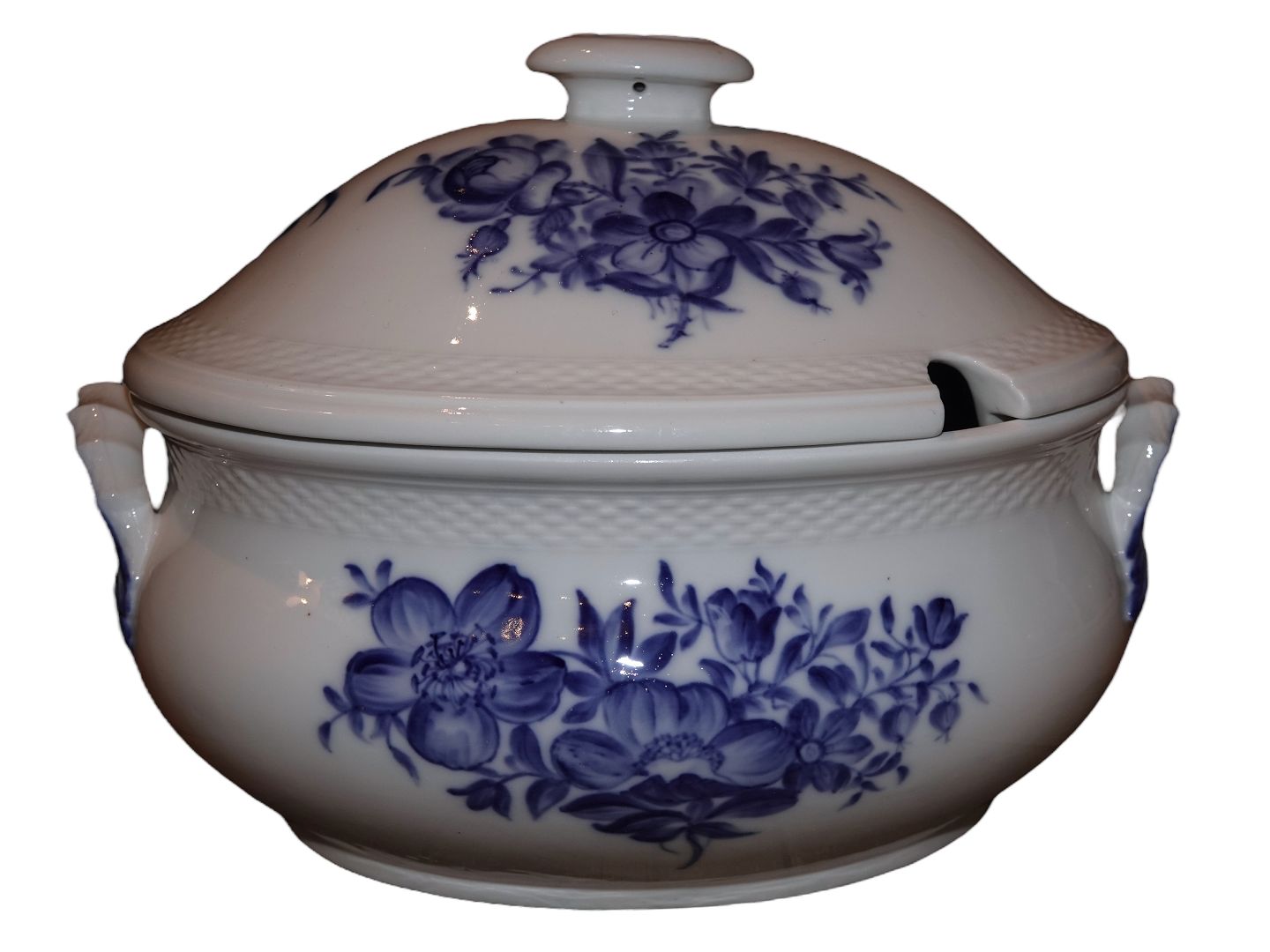 Beskrivelse: Royal Copenhagen Blå Blomst Flettet, stor suppeterrin med sjælden lågknop.