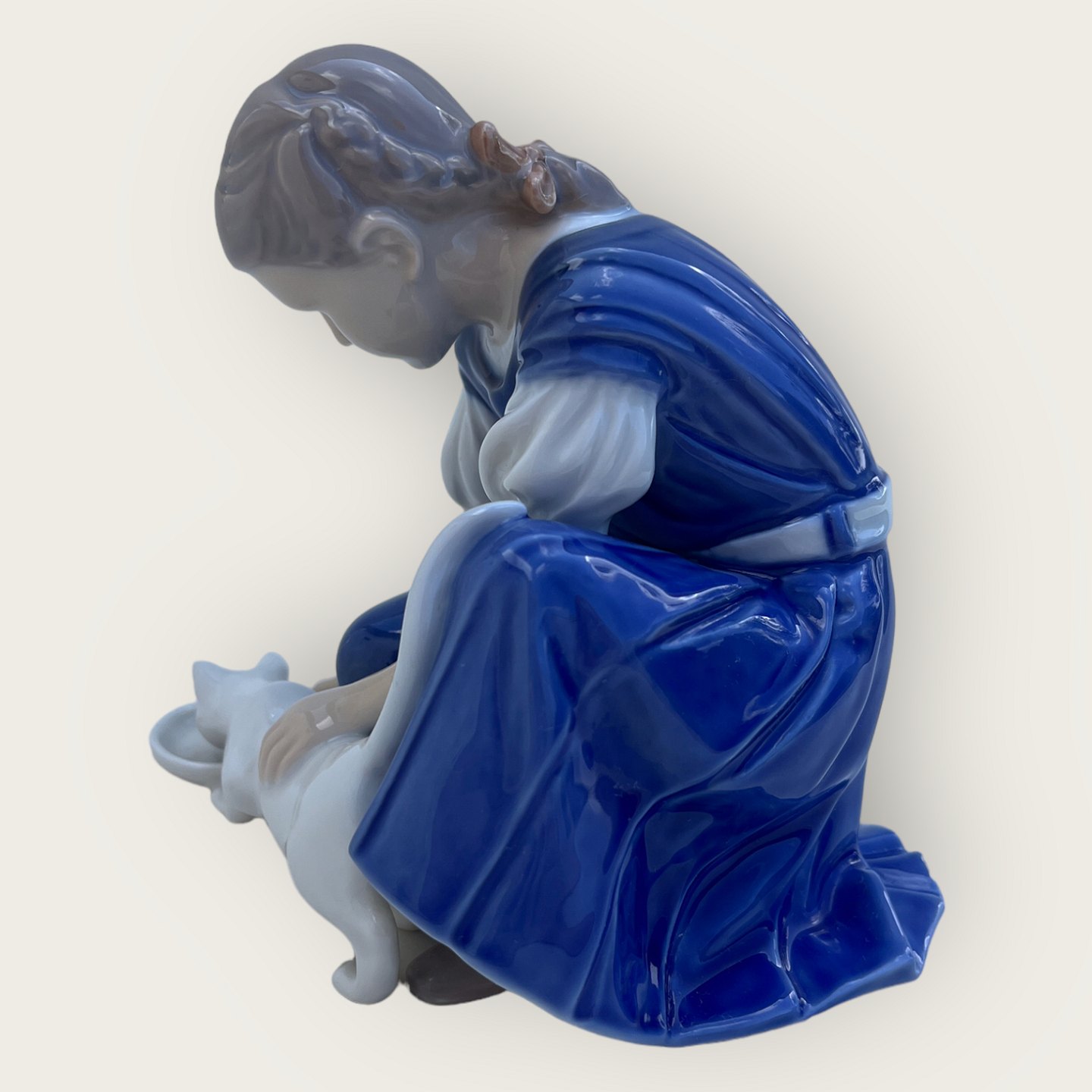 Beskrivelse: Bing & Grøndahl, "Kun en dråbe", Pige med kat #1745, 14,5cm høj, 1.sortering, Design Ingeborg Plockross Irminger *Pæn stand*