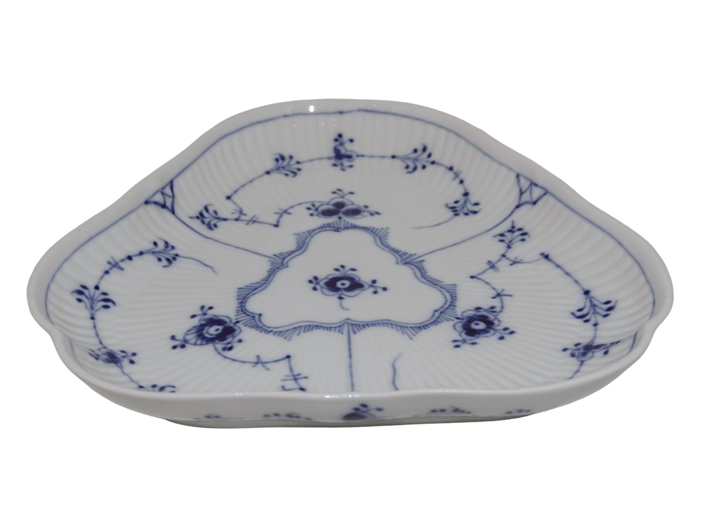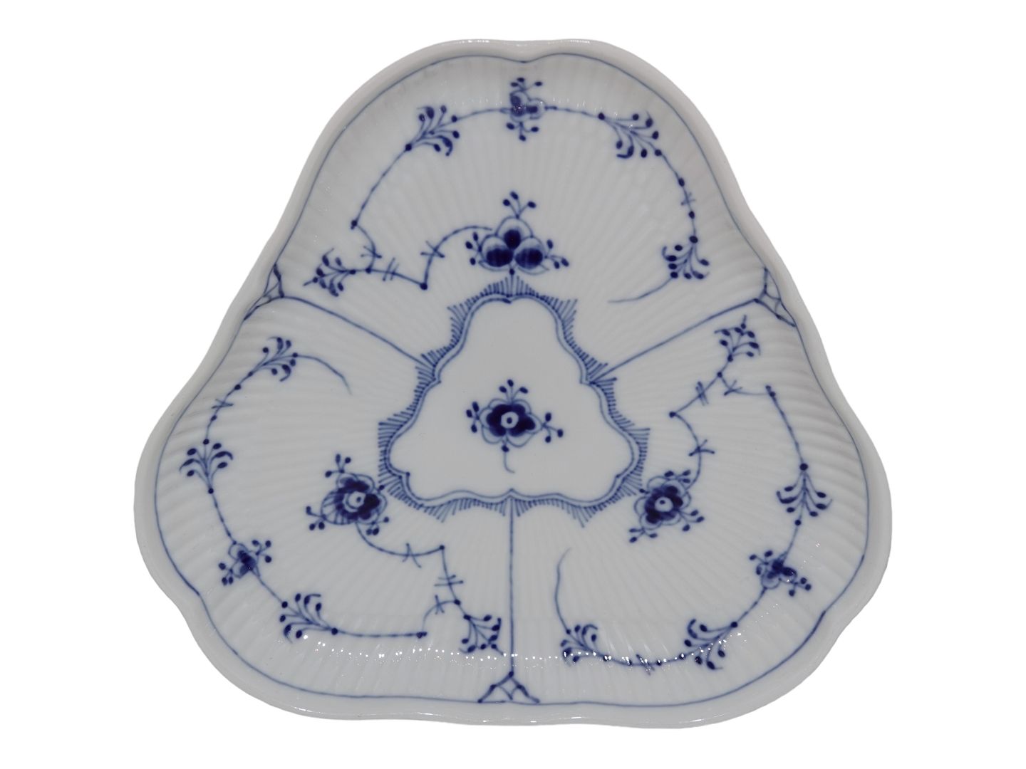 Beskrivelse: Royal Copenhagen Musselmalet Riflet, trekantet fad.