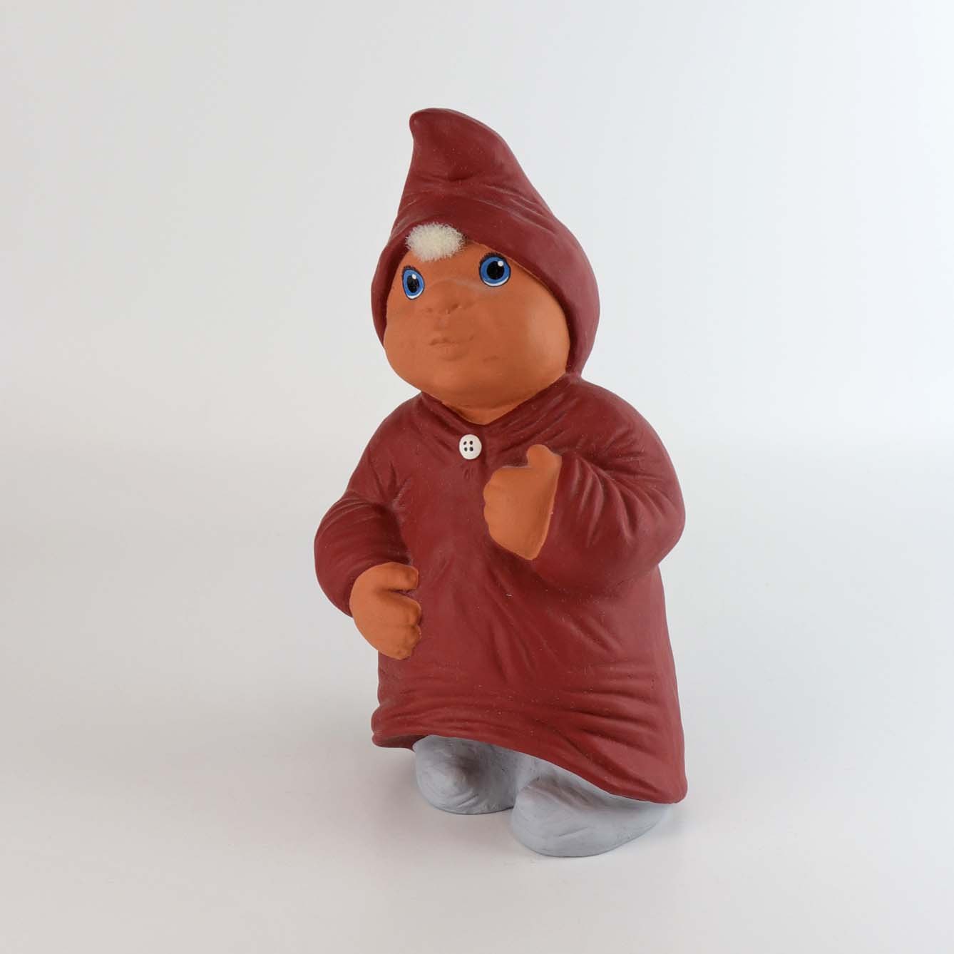 Beskrivelse: Klarborg figur af nissepigen Gine, som er iført rød nissehue og en lang rød natkjole.