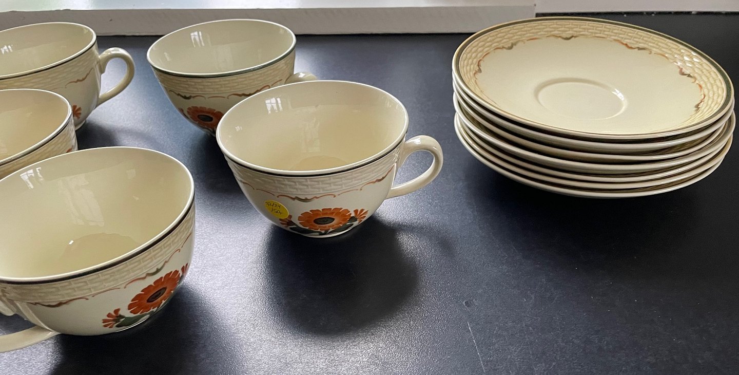 Beskrivelse: Aluminia, Morgenfrue. Designet af Niels Thorsson. Produceret i perioden 1934-1967. Luftmalet. Tekop. Nr. 1782. Højde 5,5 cm. Diameter 9,5 cm. Underkop diameter 15 cm. Flot stand. Pris: 150 kr. stk. Lager: 7