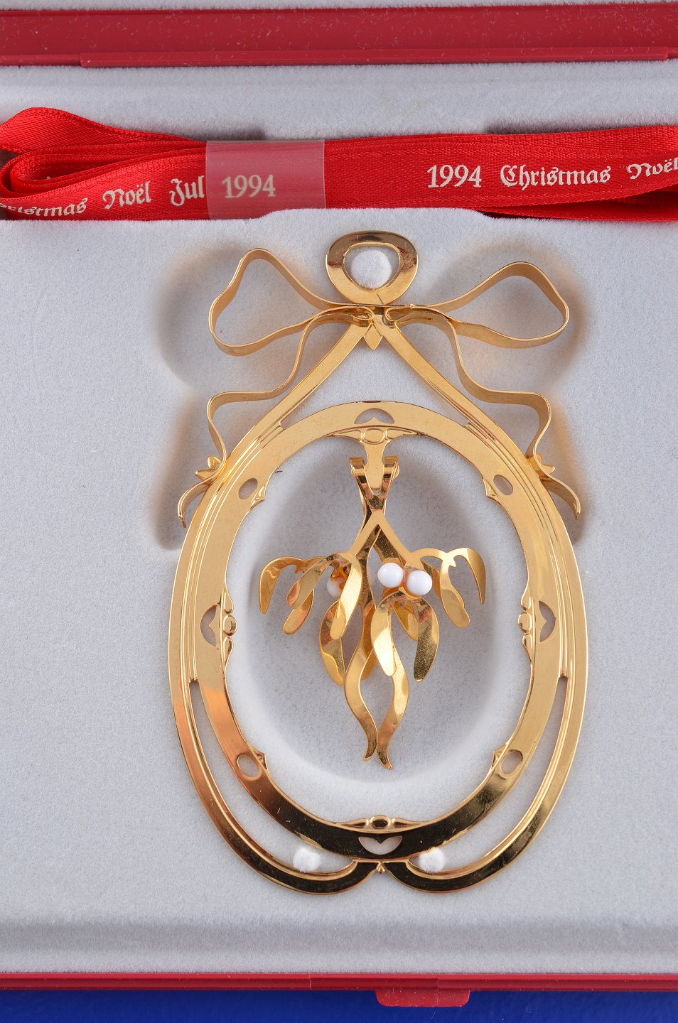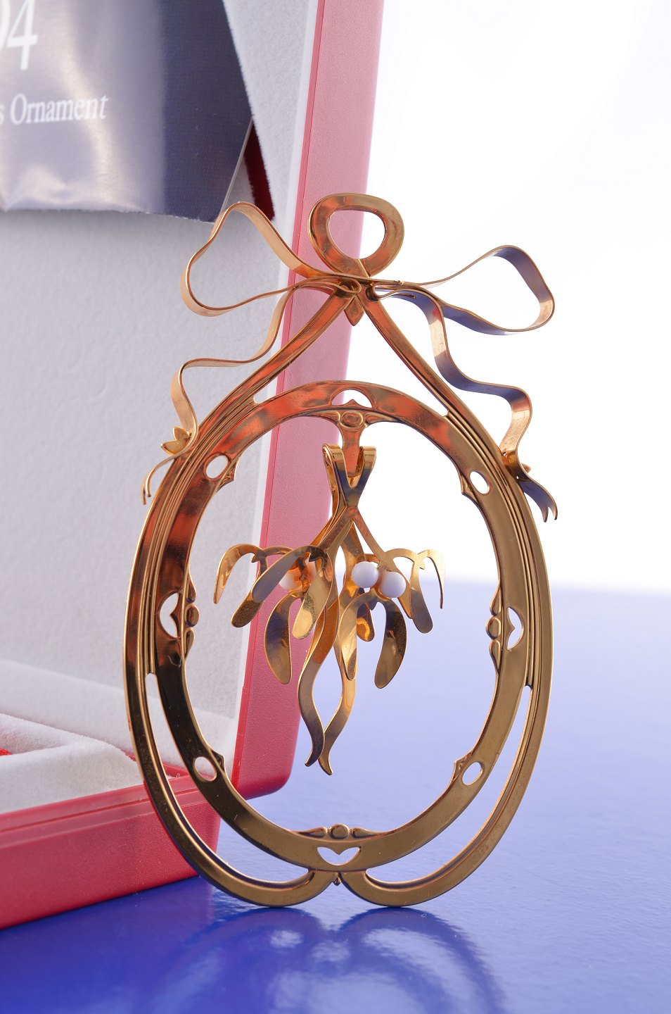 Beskrivelse: Georg Jensen Julepynt. Juleuroen år 1994 med mistelten motiv, forgyldt messing. Designet af kunstneren, Jette Frölicb. Pæn velholdt stand, med æske.
