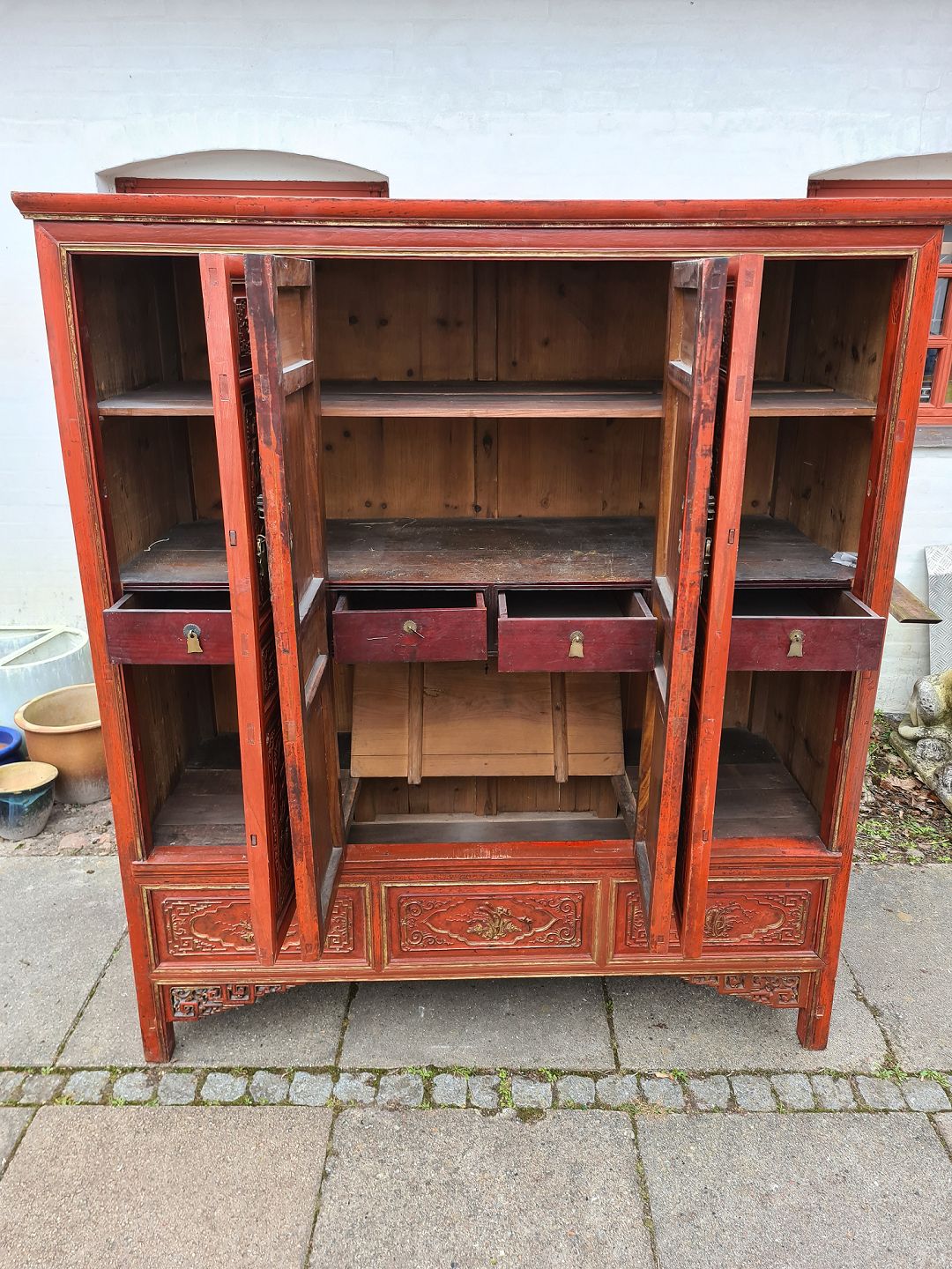 Beskrivelse: Kinesisk dækketøjsskab i original rød bemalet træ.