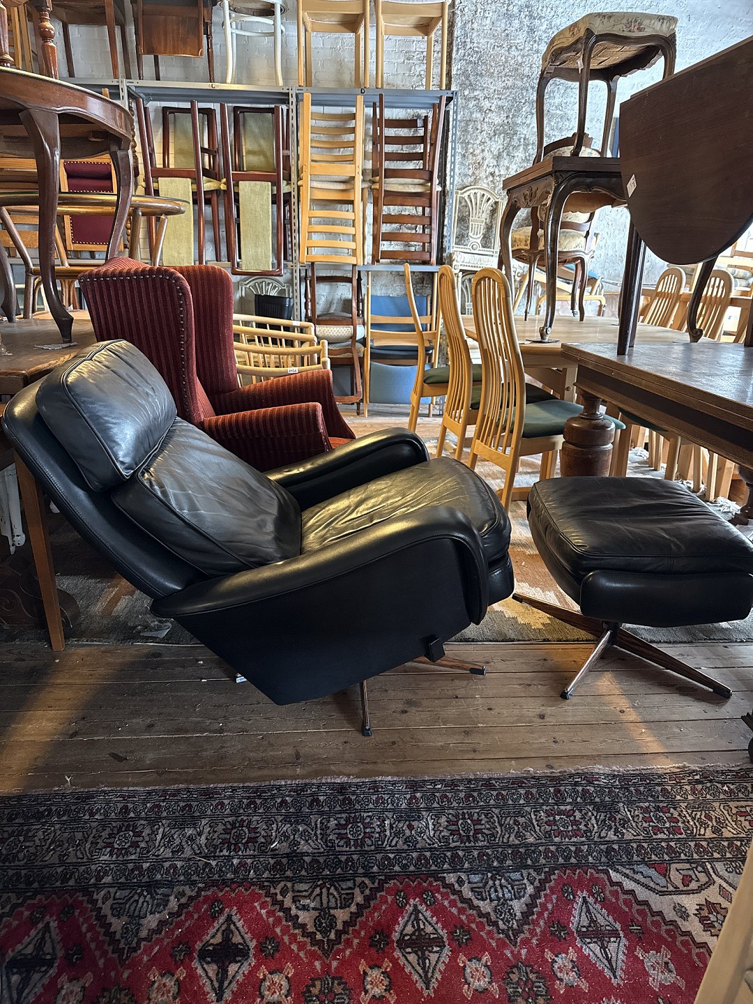 Beskrivelse: Læder lænestol med fodskammel, fra 1990erne.