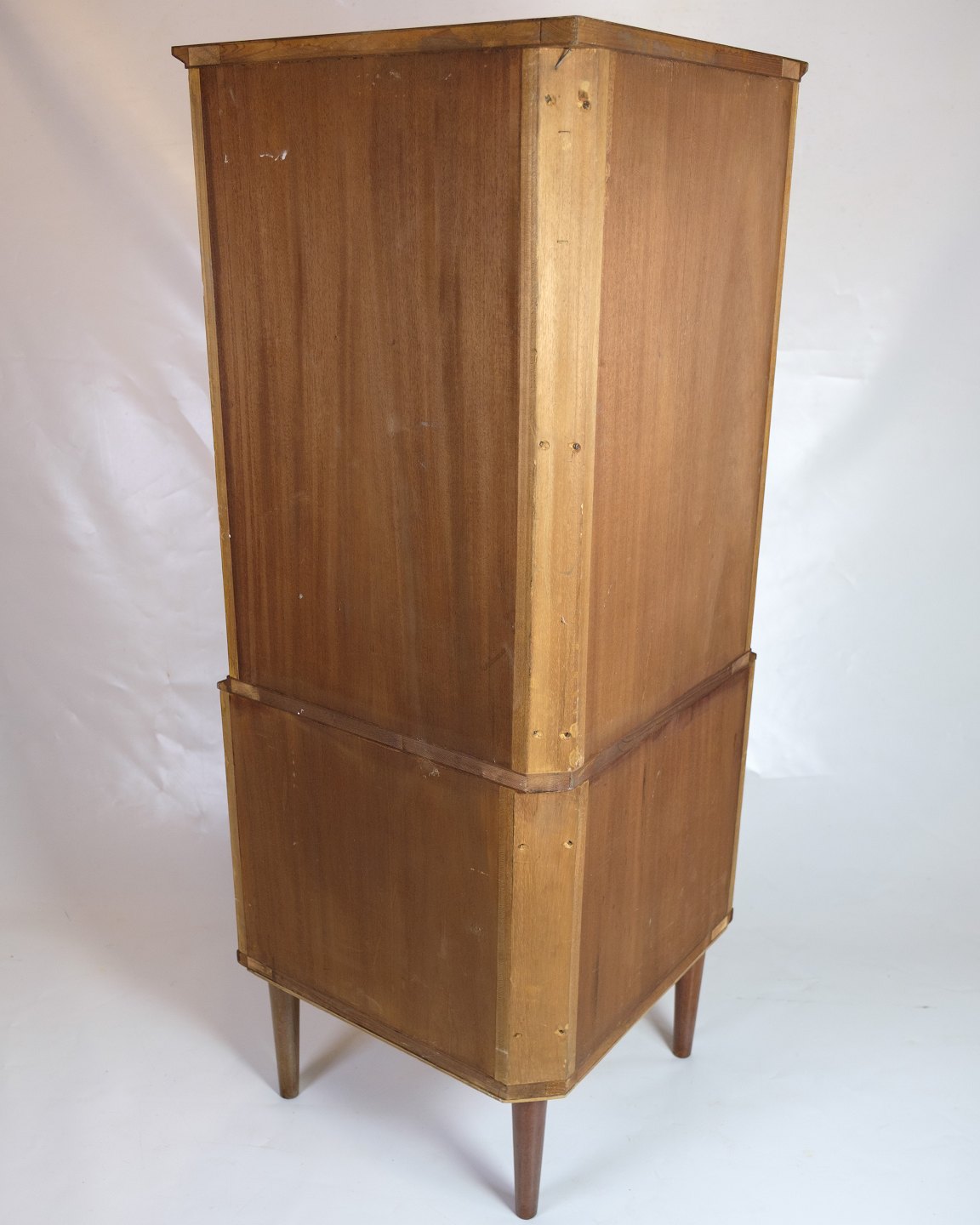 Beskrivelse: Hjørneskab i teaktræ fra 1960’erne, fremstillet af Petersons Midtjydske Møbelfabrik. Skabet er udformet med dobbelte fyldningslåger foroven og forneden, der giver adgang til rummelige opbevaringssektioner.