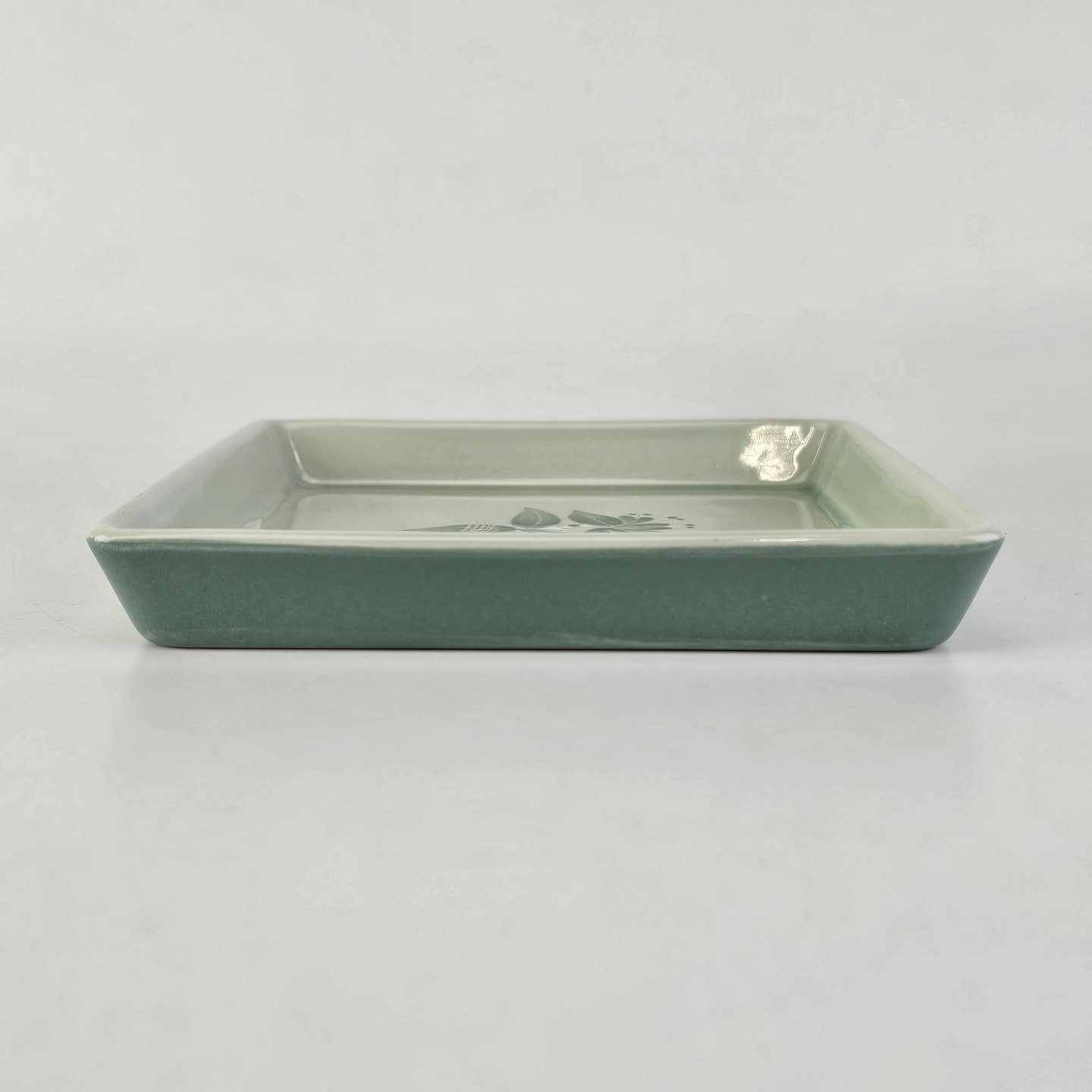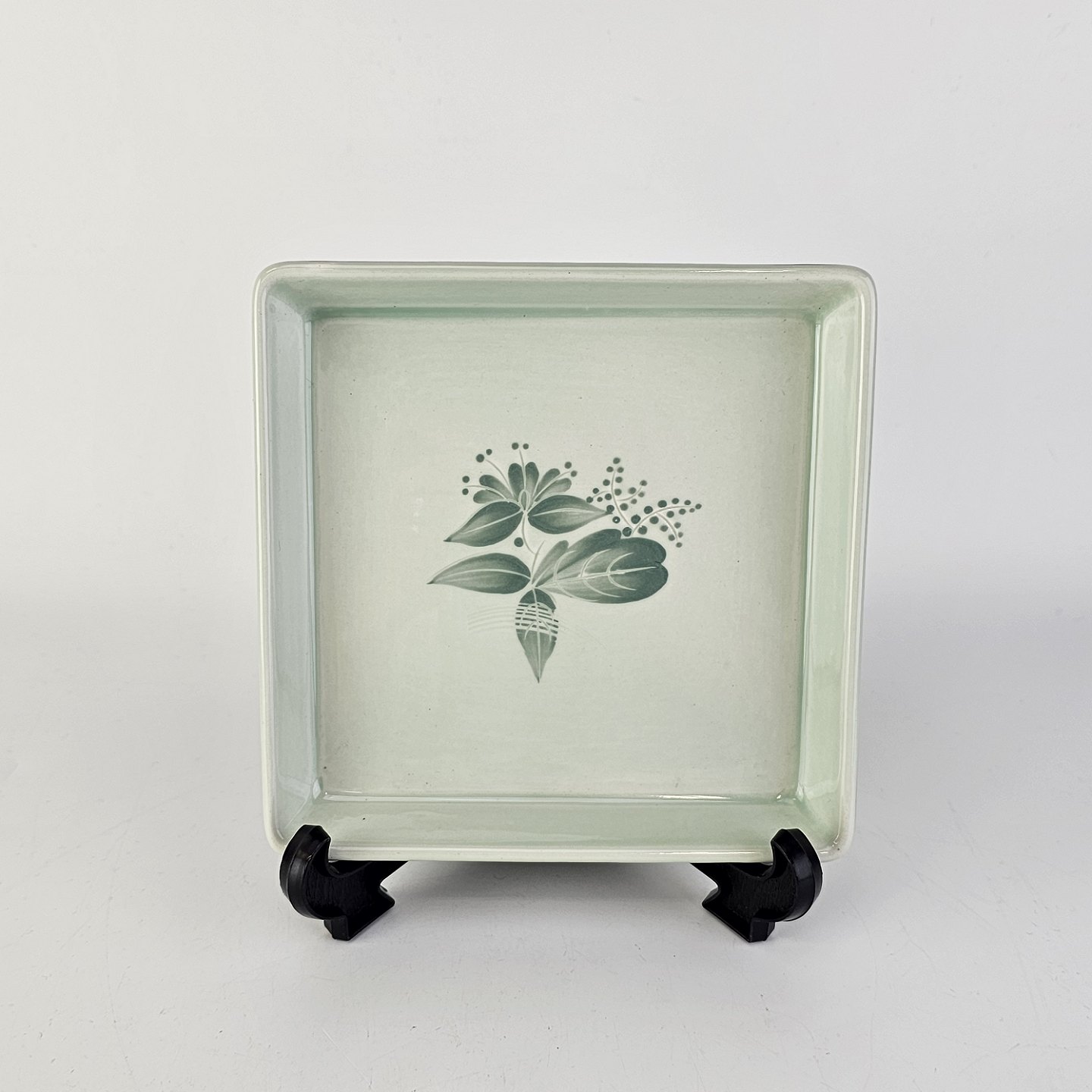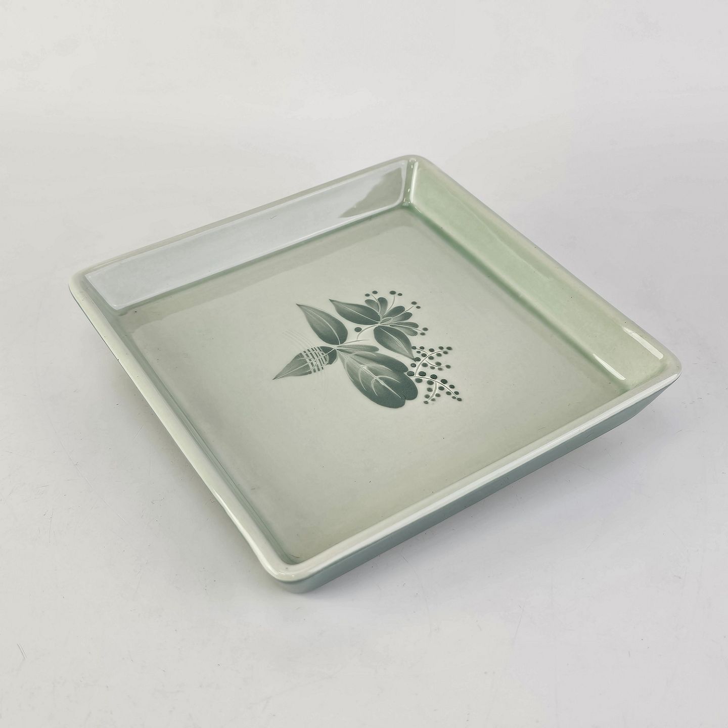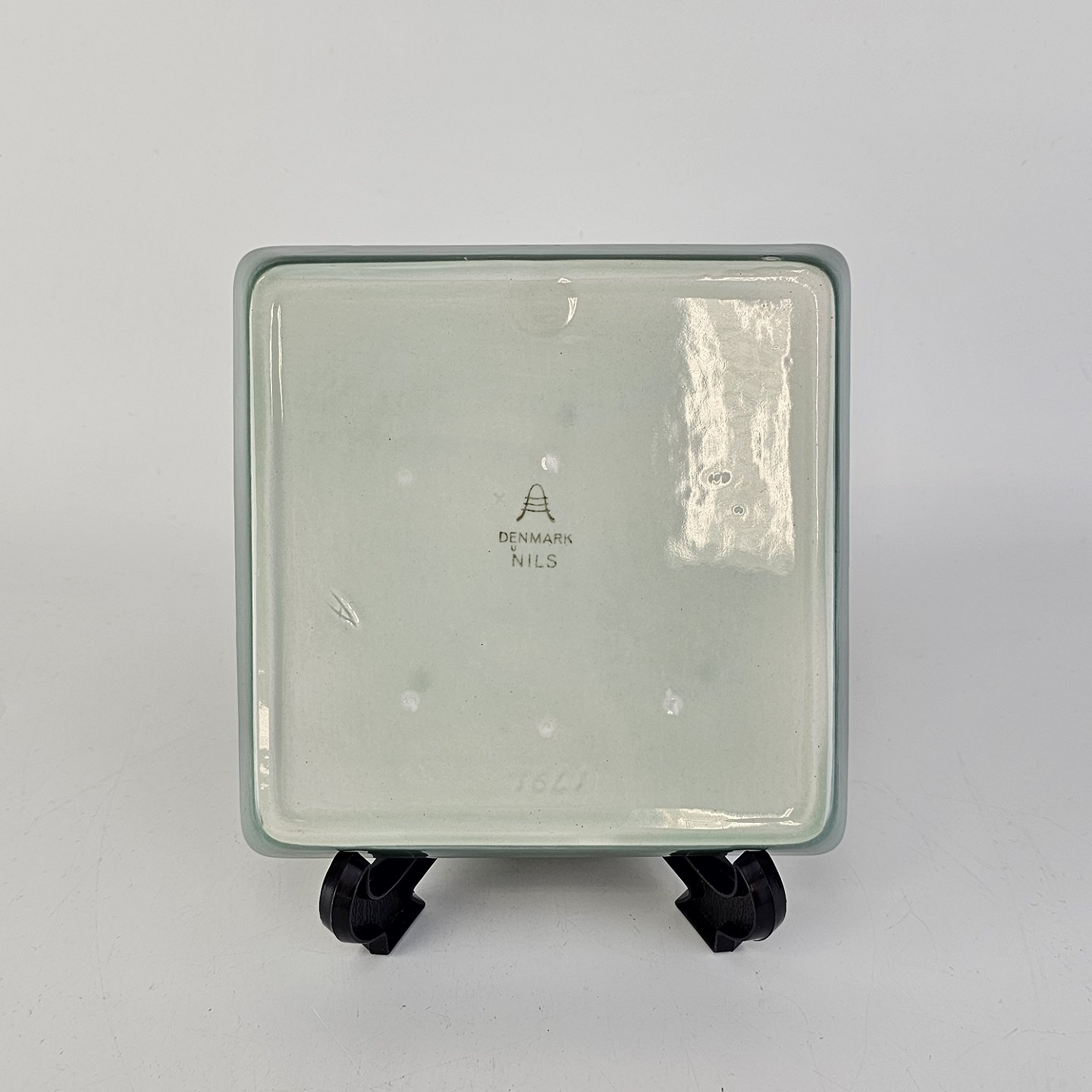 Beskrivelse: Lille firkantet fad i fajance fra stellet Nils