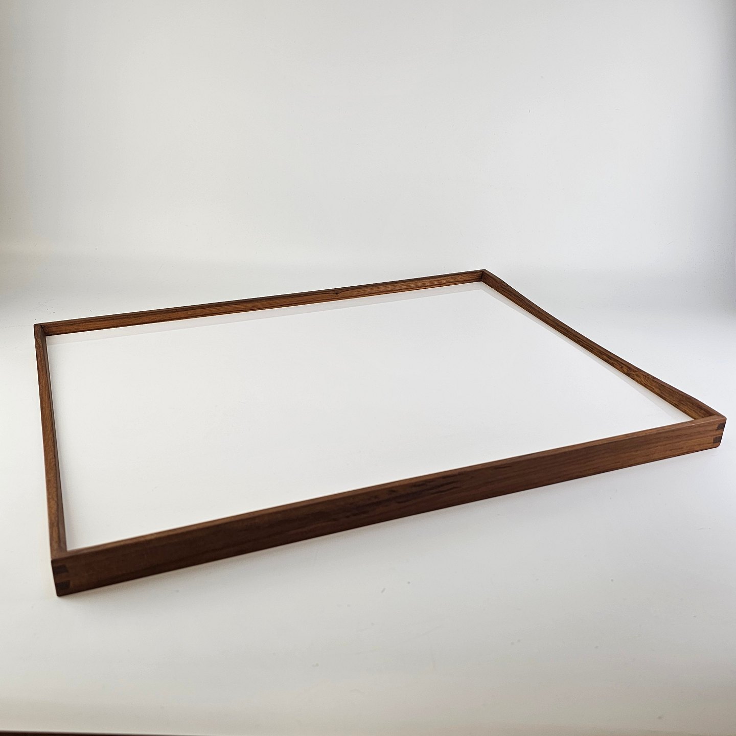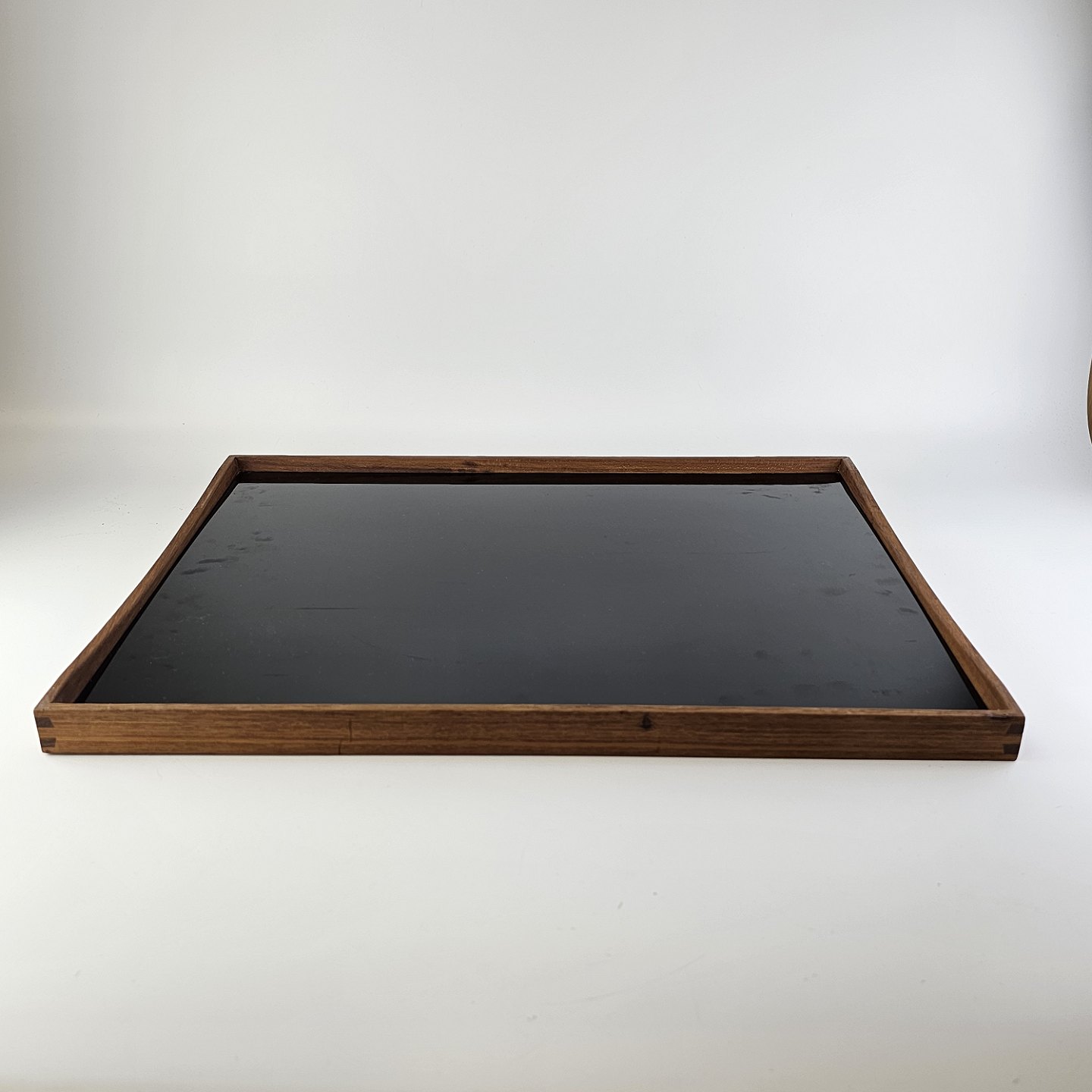 Beskrivelse: Vendbar bakke i teak tre og højglans laminat, sort på den ene side og hvid på den anden