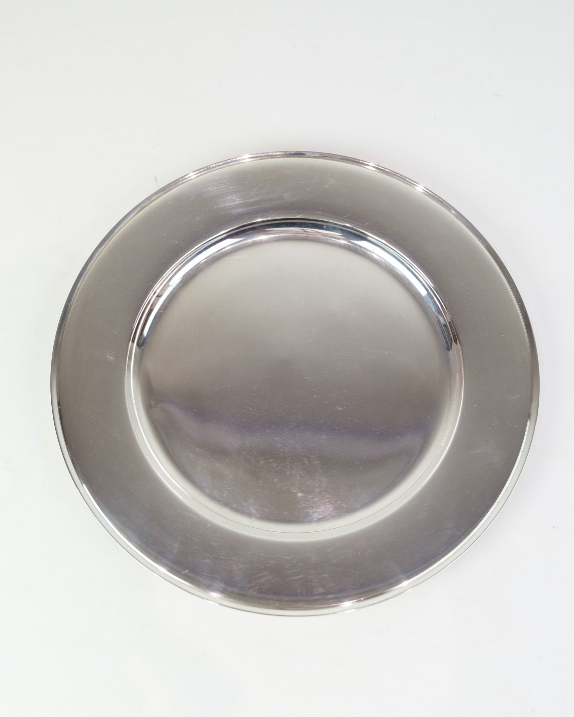 Beskrivelse: Georg Jensen dækketallerken i sterling sølv, Pyramide model No. 600E. Diameter 26 cm, vægt 522 g. Elegant dansk designklassiker.