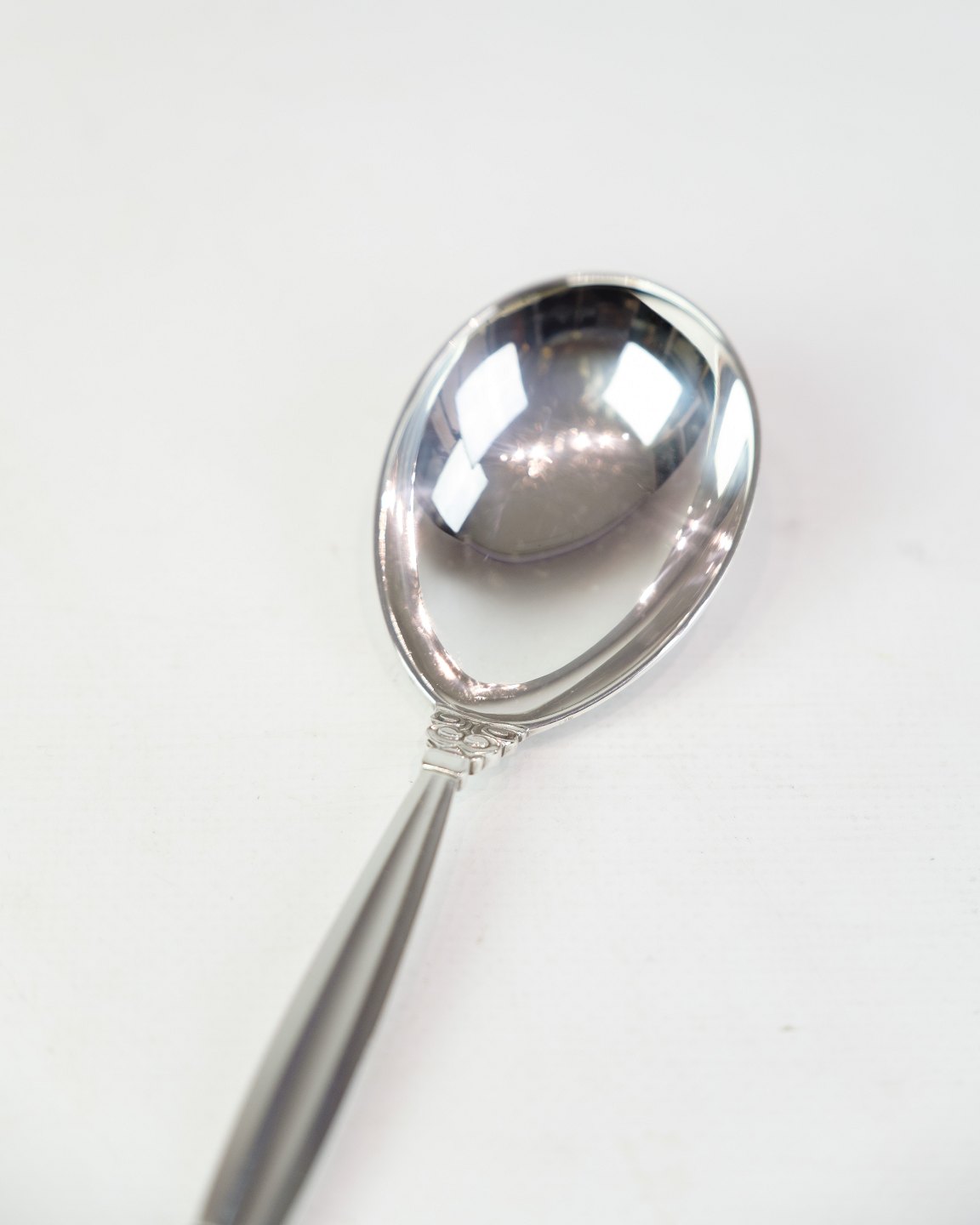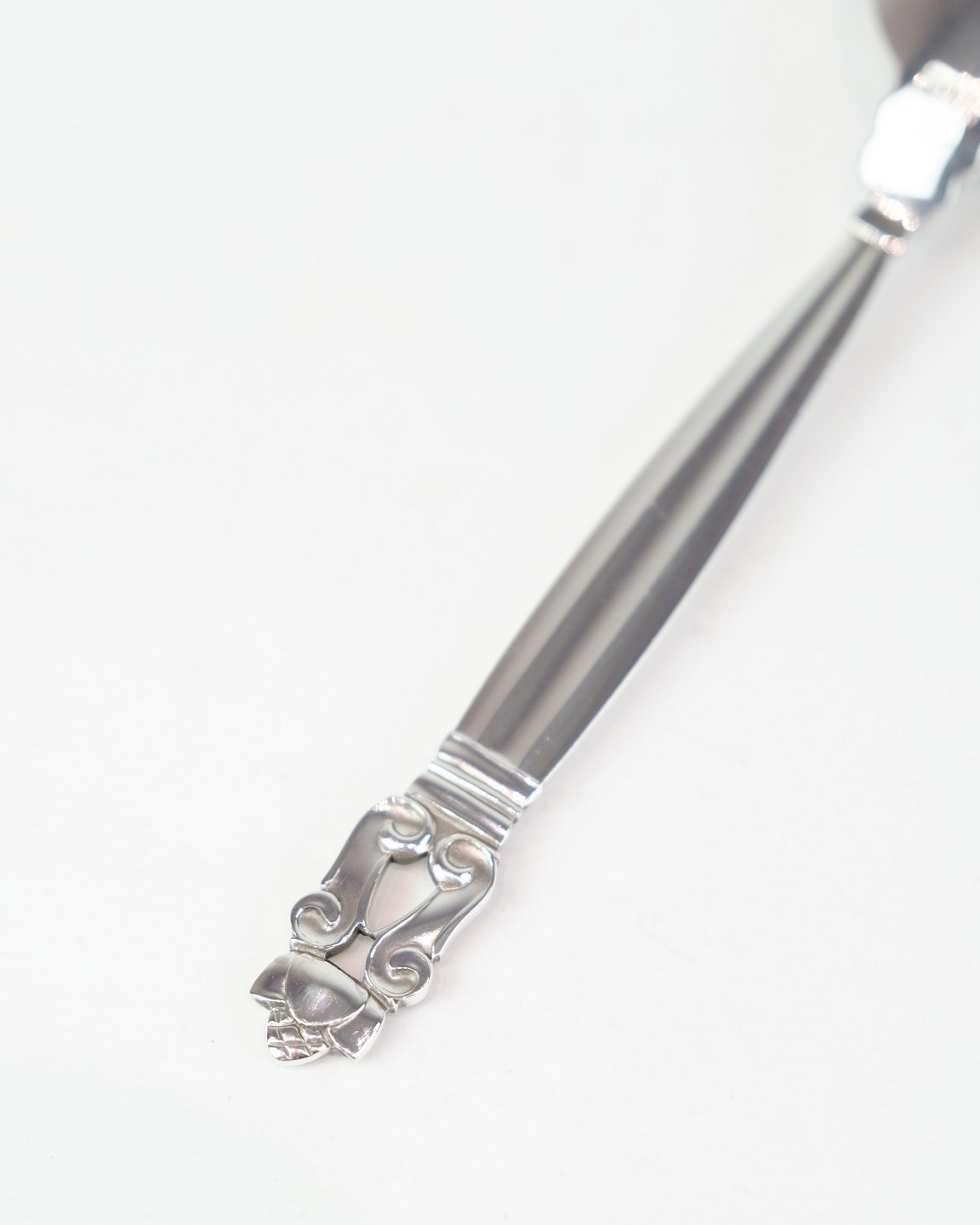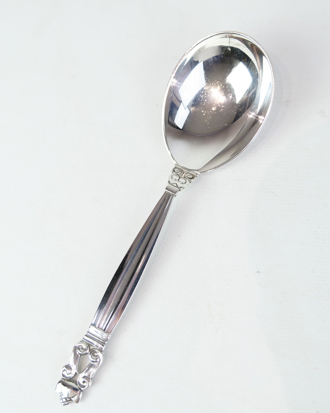 Beskrivelse: Georg Jensen Marmeladeske i sølv, mønster Konge. Designet af Johan Rohde i 1915. Længde 16cm. Klassisk dansk sølvarbejde.