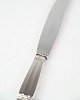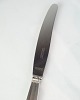 Beskrivelse: Georg Jensen middagskniv i Konge mønster. Kort skaft, sterling sølv og stål. Design af Johan Rohde 1915. Længde 24,5 cm.