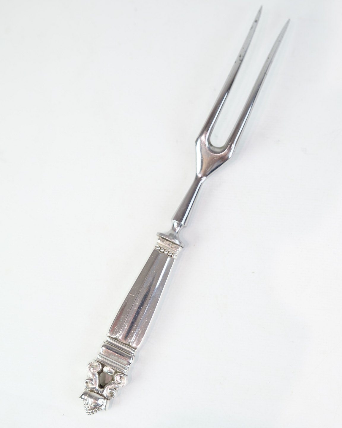 Beskrivelse: Georg Jensen forskærergaffel i sølv, mønster Konge. Designet af Johan Rohde i 1915. Længde 25 cm. Klassisk dansk sølvarbejde.