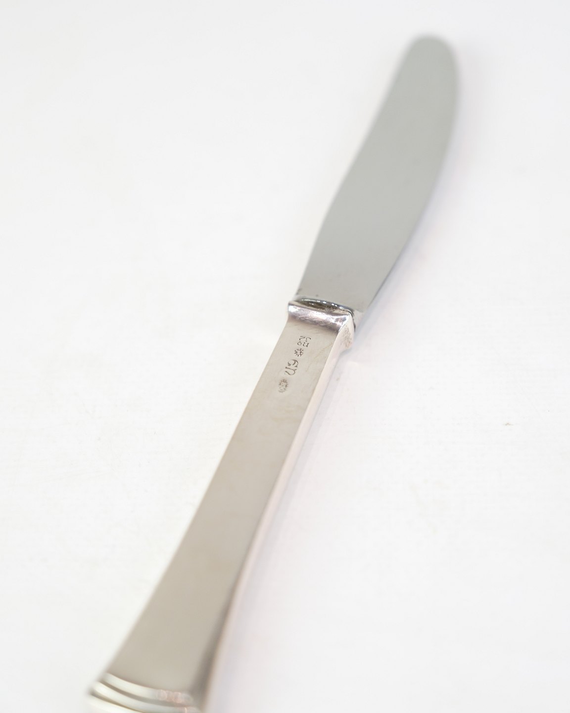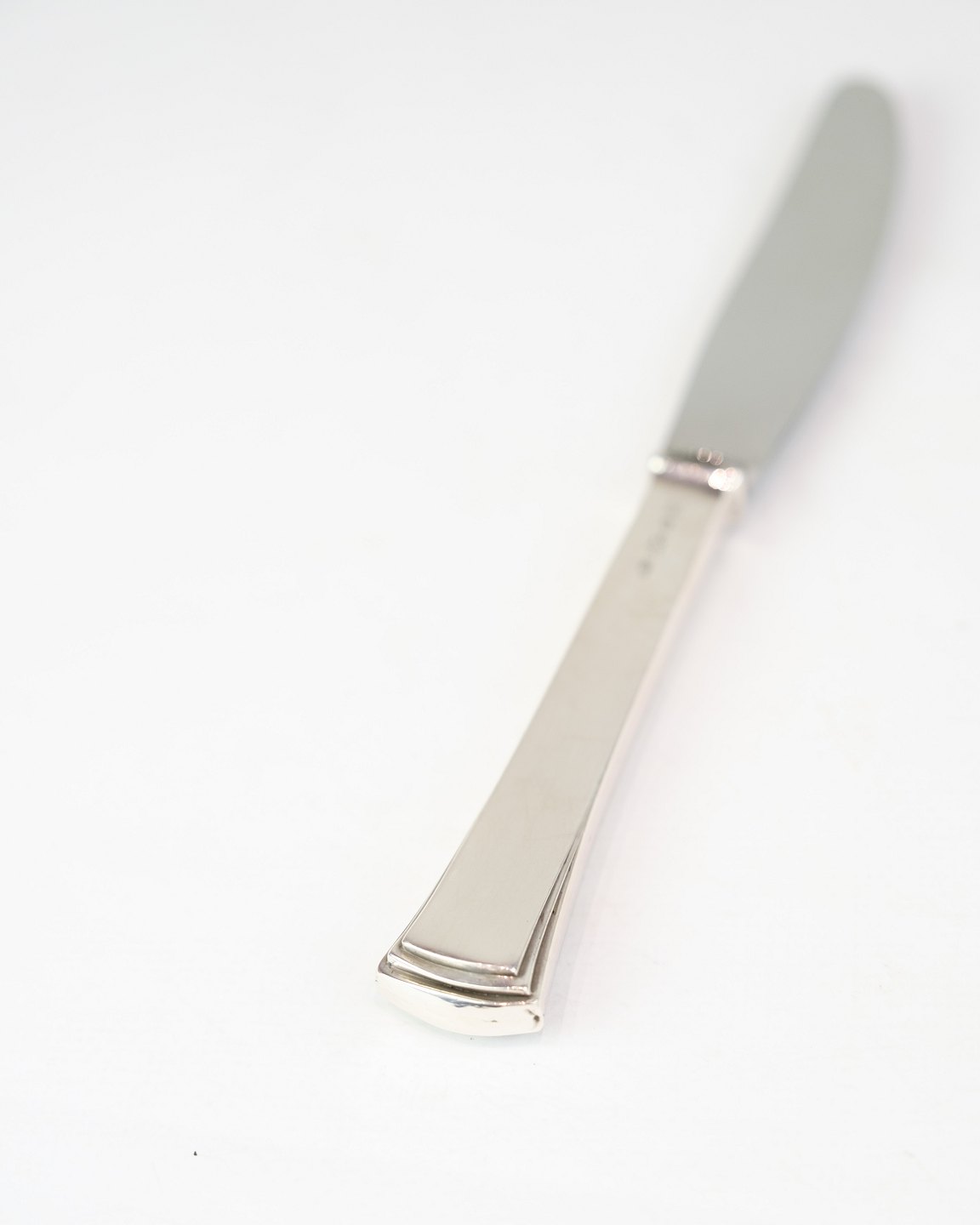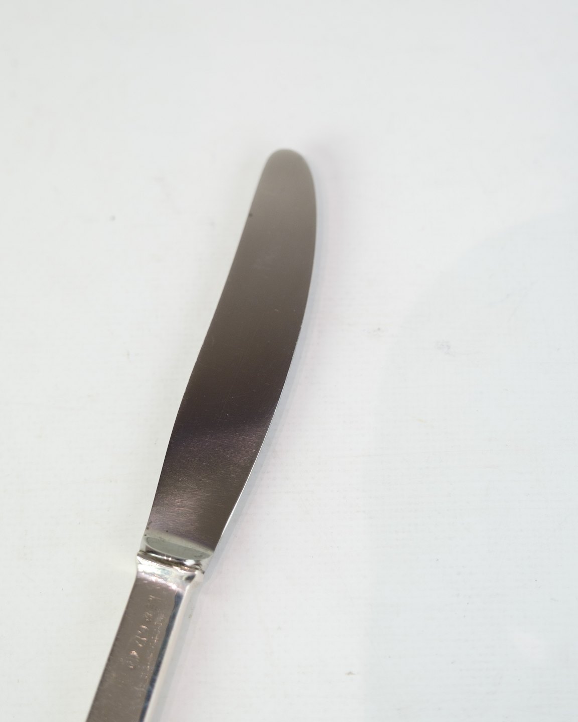 Description: Evald Nielsen dinner knife in real silver. Congo pattern No. 32 with short handle. Length 23 cm. Classic Danish silverwork.