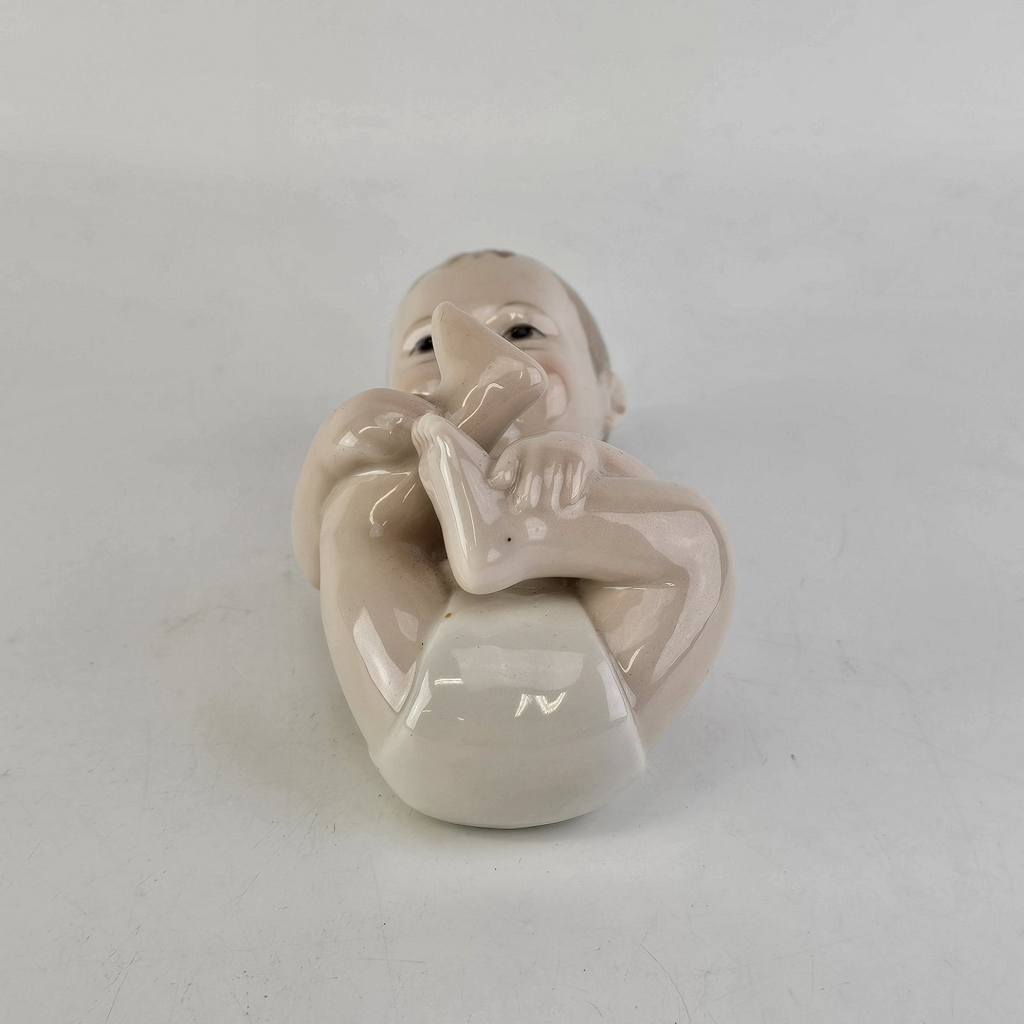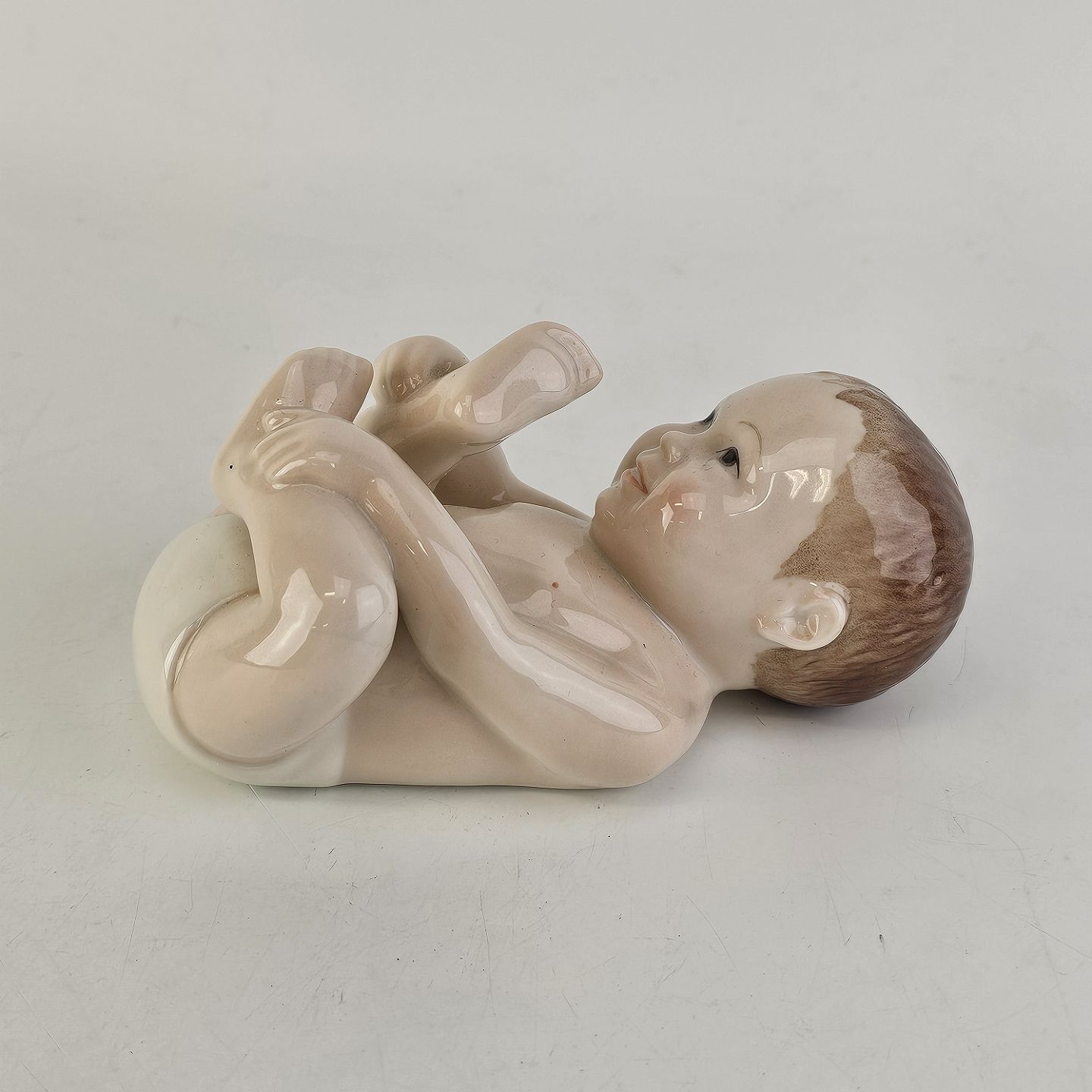 Beskrivelse: Figur i porcelæn med motiv af liggende baby med hvid ble. Nr. 027