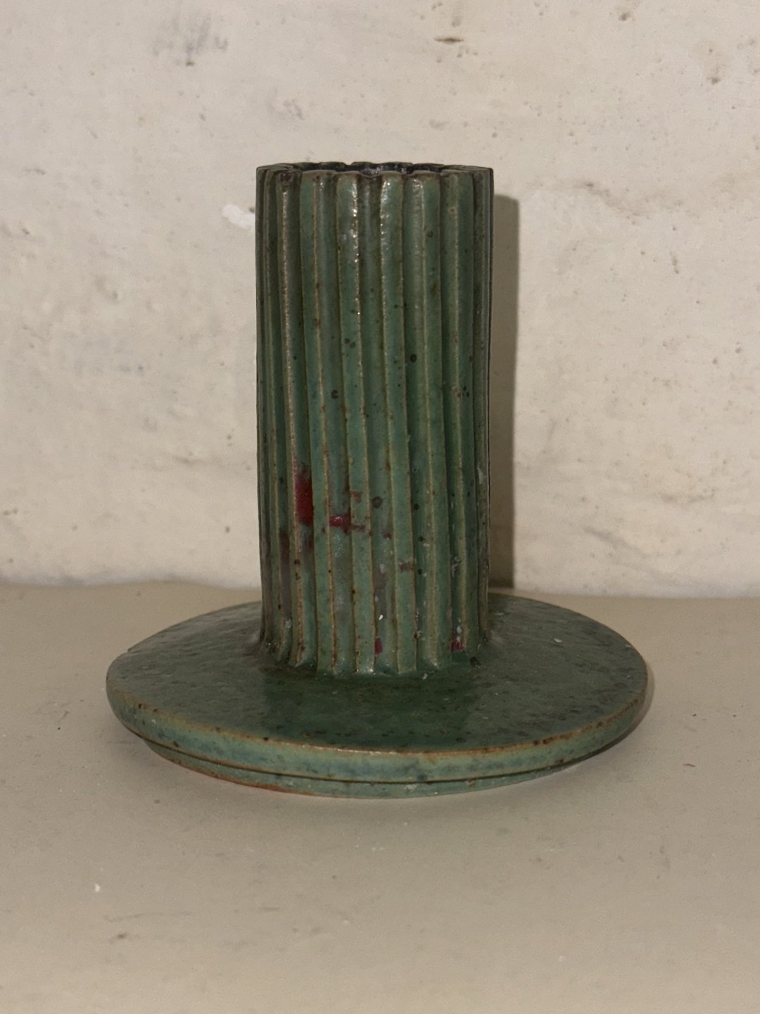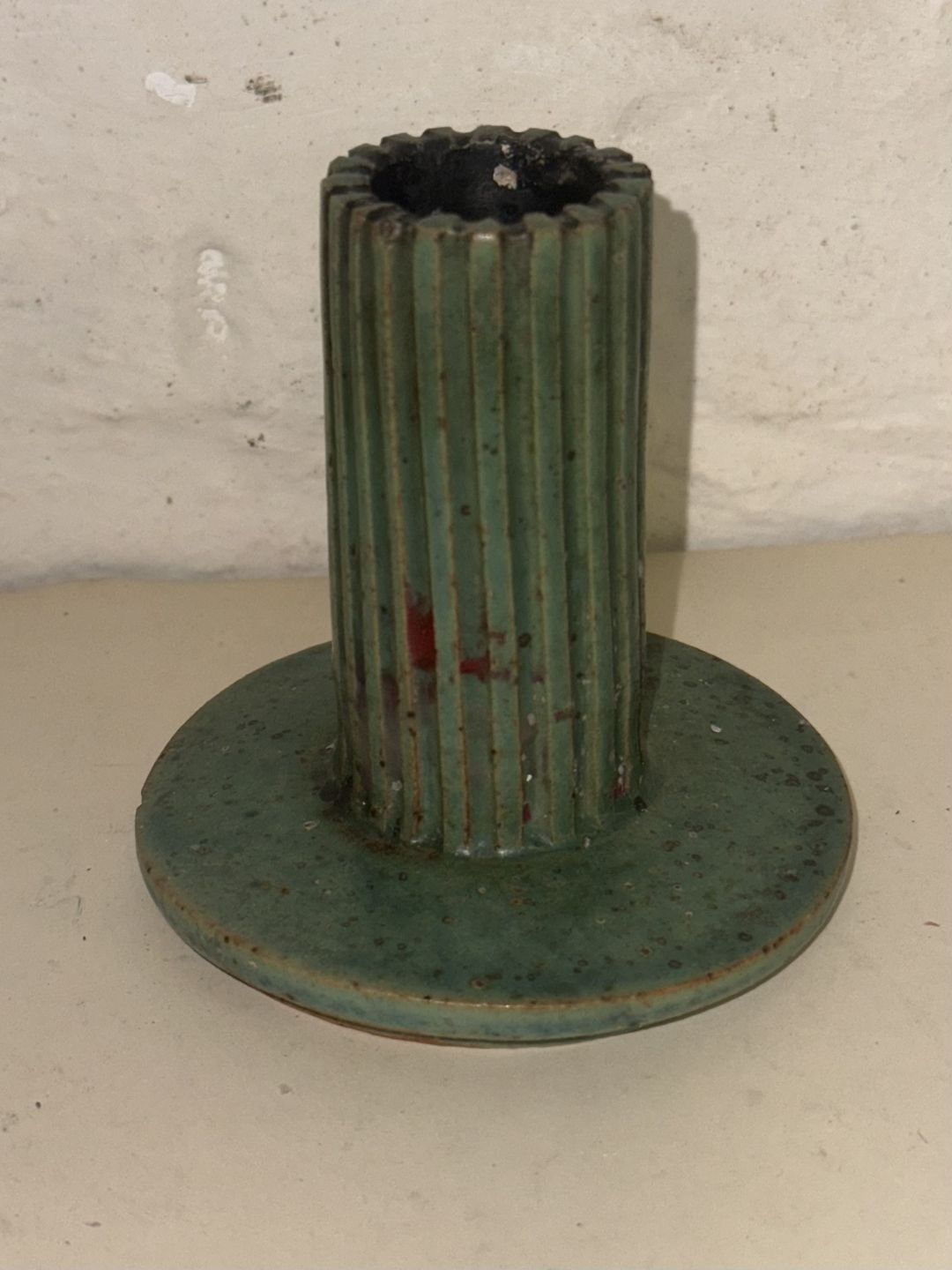 Beskrivelse: Lysestage i keramik med rillet lyspibe. I god stand. Dækket af grøn glasur. Brugsspor indvendigt. Indridset AB på undersiden sammen med modelnummer 133. H. 9,2 cm
