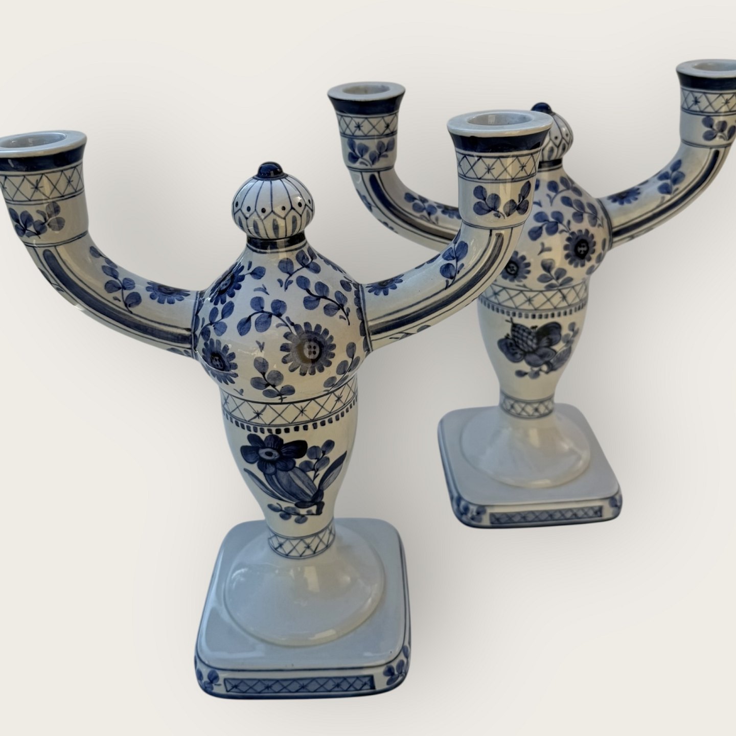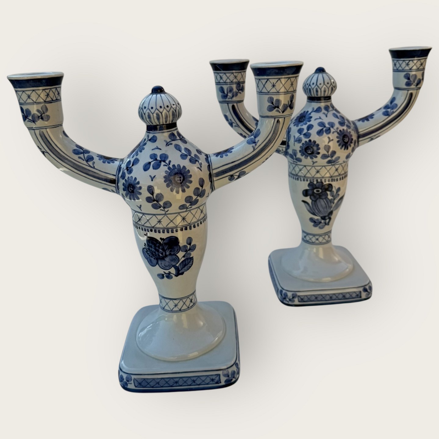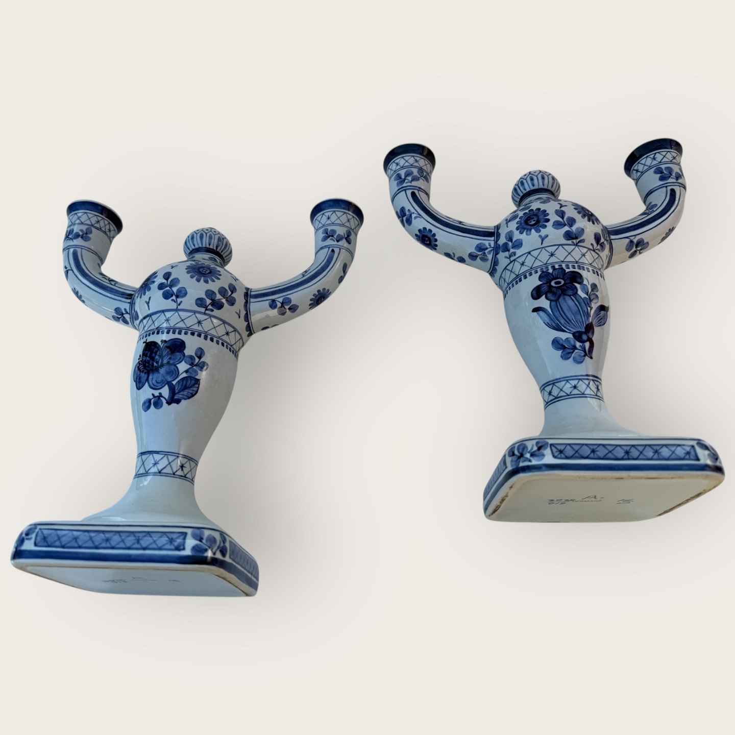 Description: Royal Copenhagen, Aluminia, Tranquebar A set of 2-armed candlesticks, #3037/919, a few small cracks under the glaze, otherwise very good condition, 1st grade, design Christian Joachim, Dimensions for one candlestick: Height 25.5cm, width 22cm, sold together.