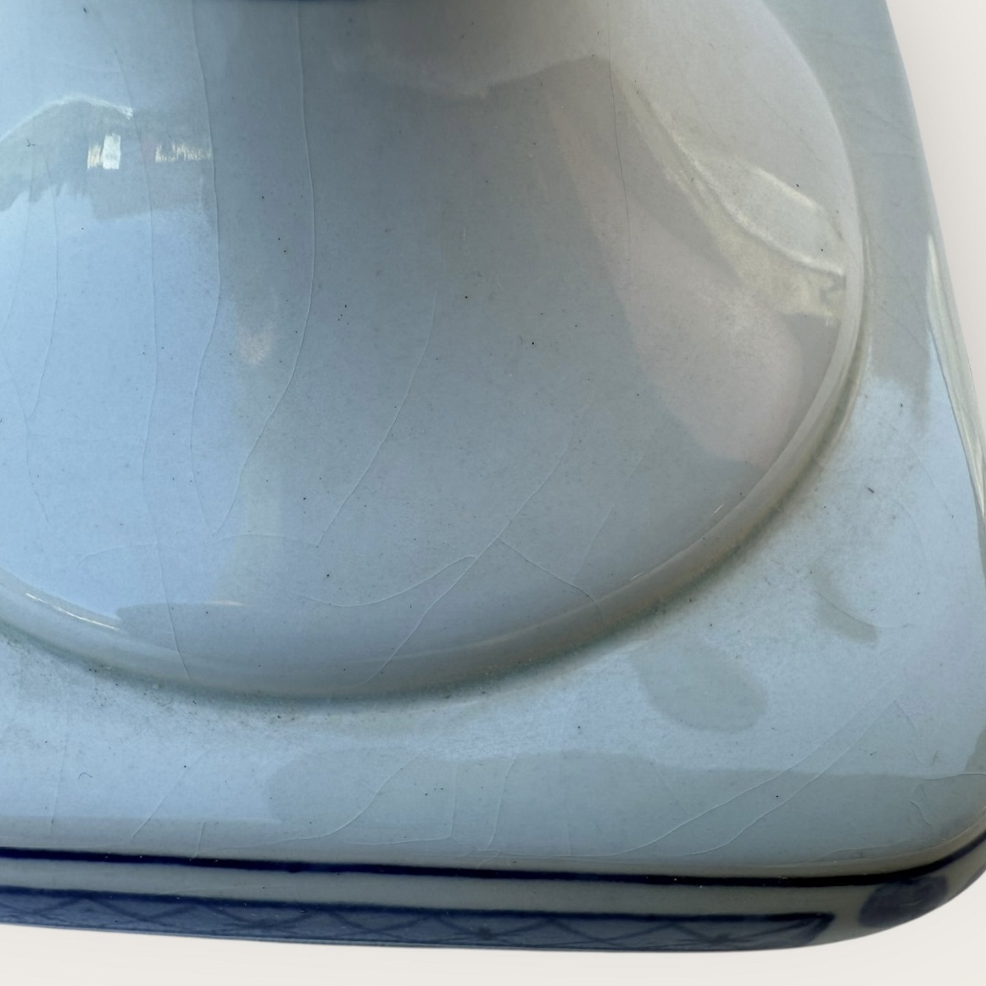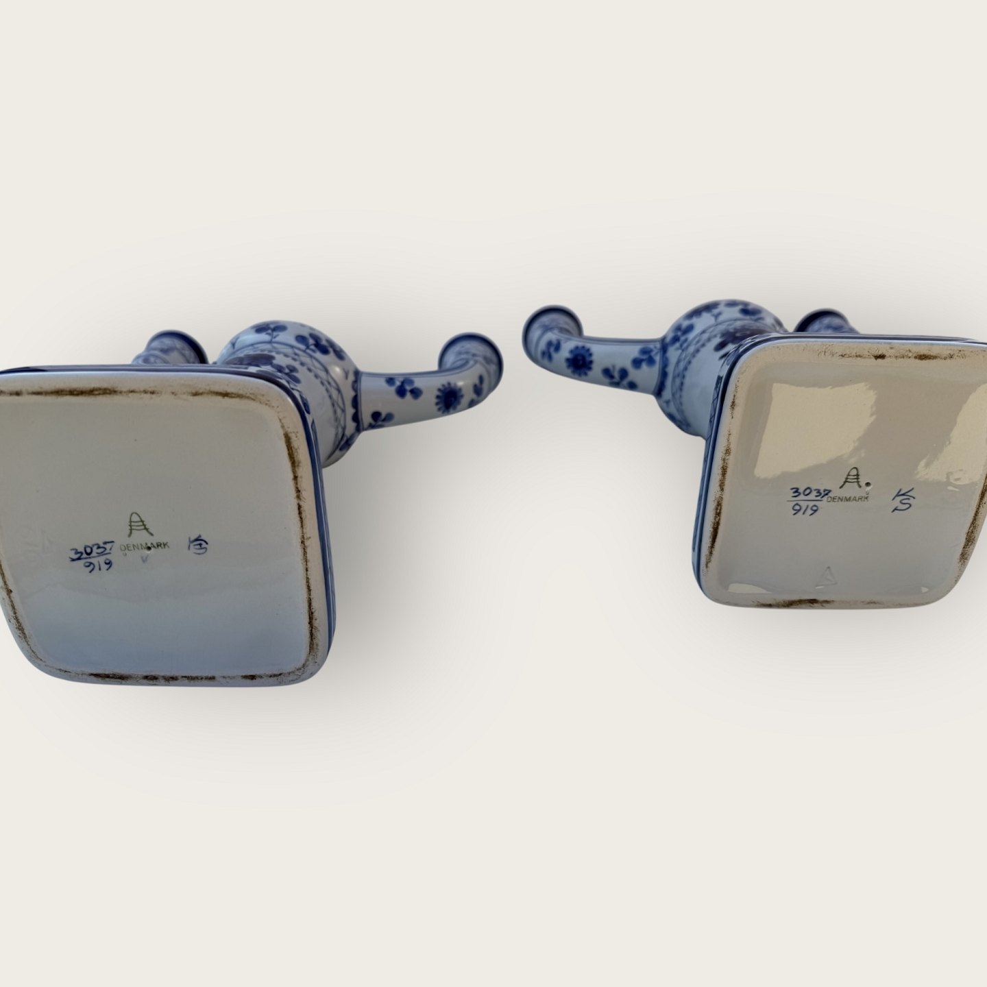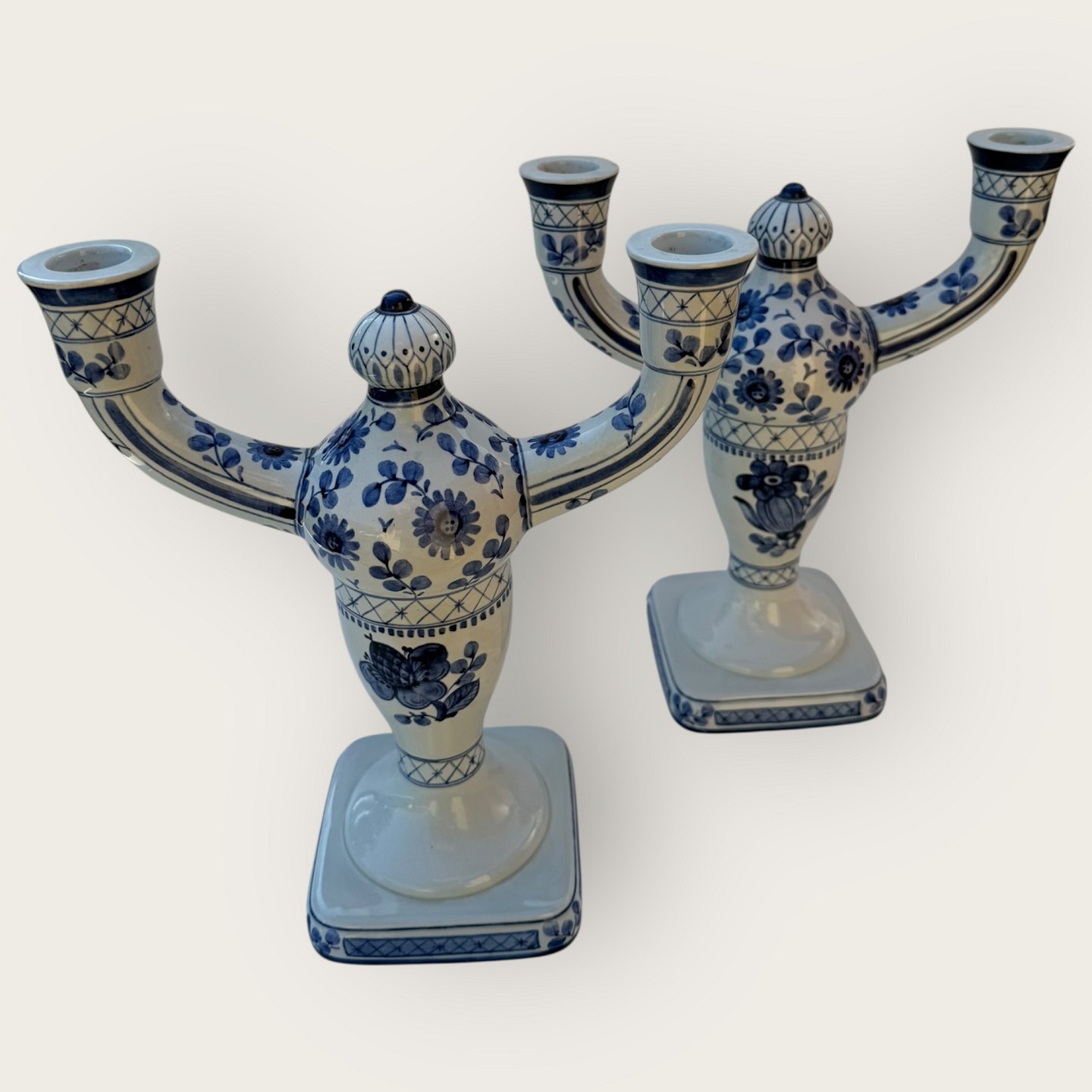 Description: Royal Copenhagen, Aluminia, Tranquebar A set of 2-armed candlesticks, #3037/919, a few small cracks under the glaze, otherwise very good condition, 1st grade, design Christian Joachim, Dimensions for one candlestick: Height 25.5cm, width 22cm, sold together.